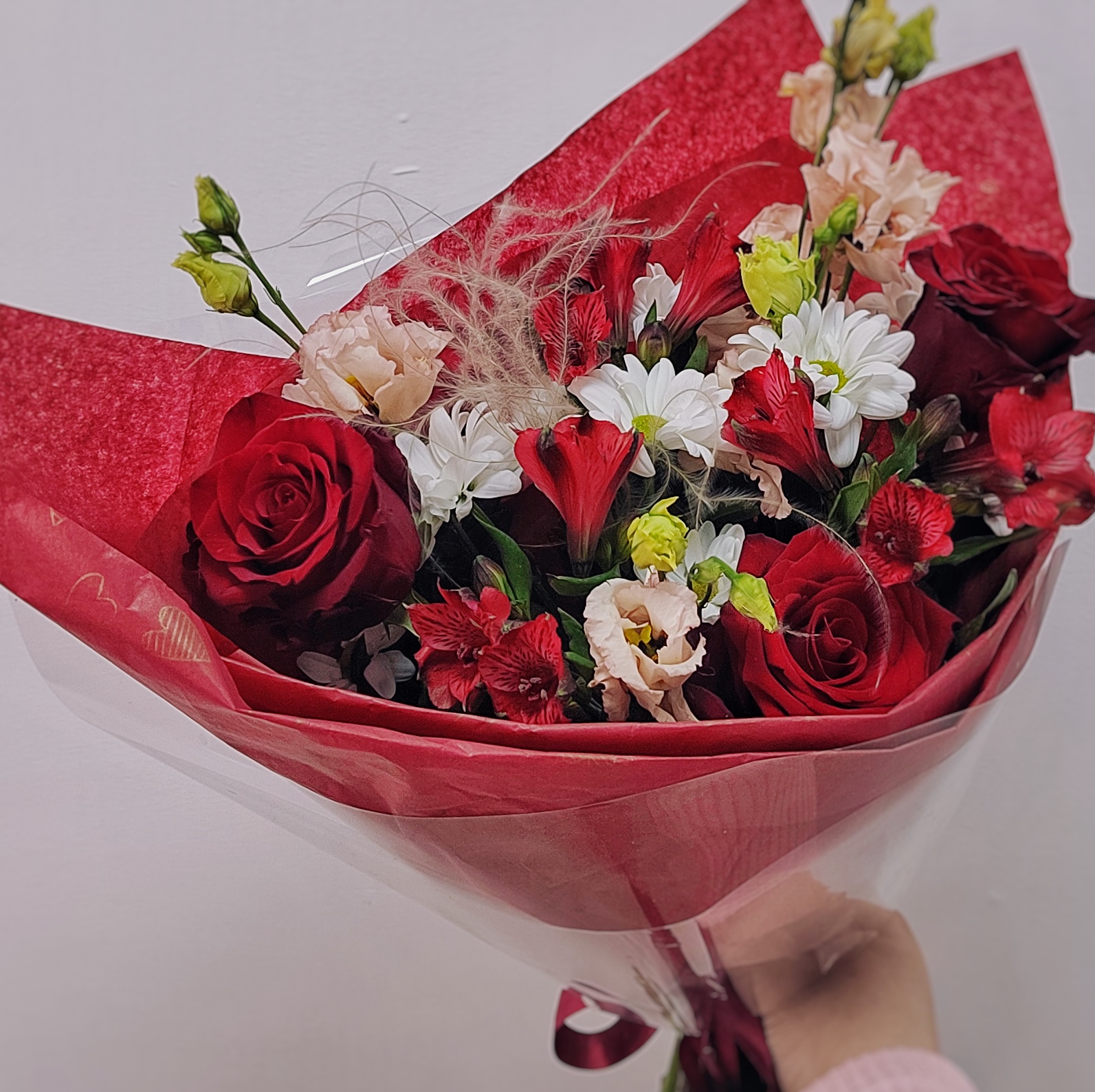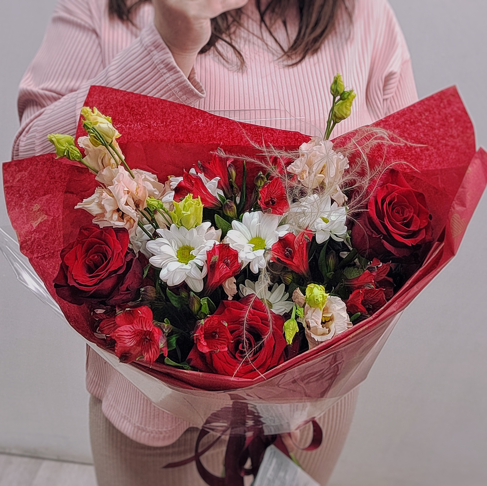 Готовый букет с алыми розами, пионовидной розой и эустомой | Размер 40/50 см