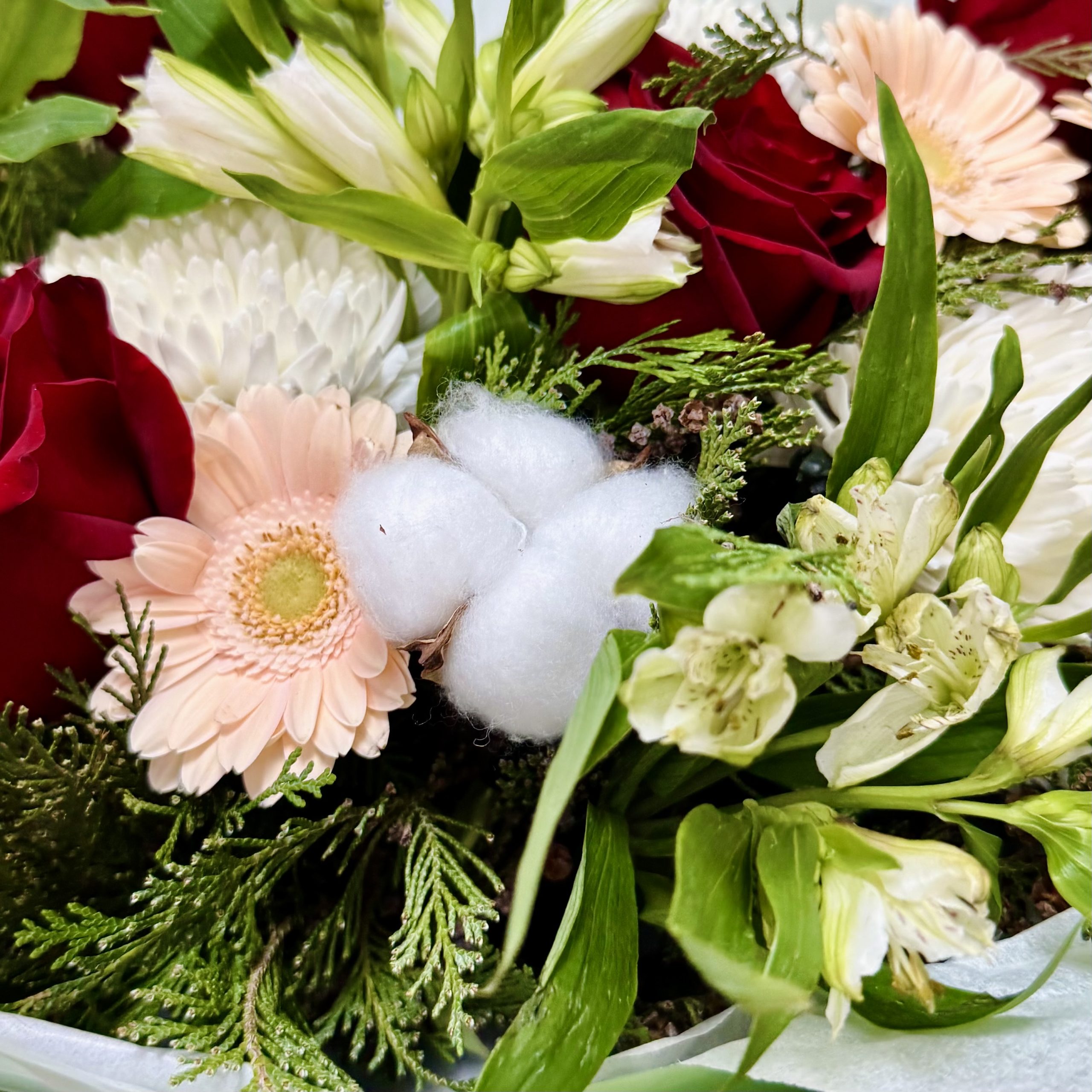 Стильный и яркий букет 60*60 см из бордовых роз, кремовых мини гербер и пушистой зимней туи — отличное решение для праздничного подарка или украшения дома в холодный сезон.