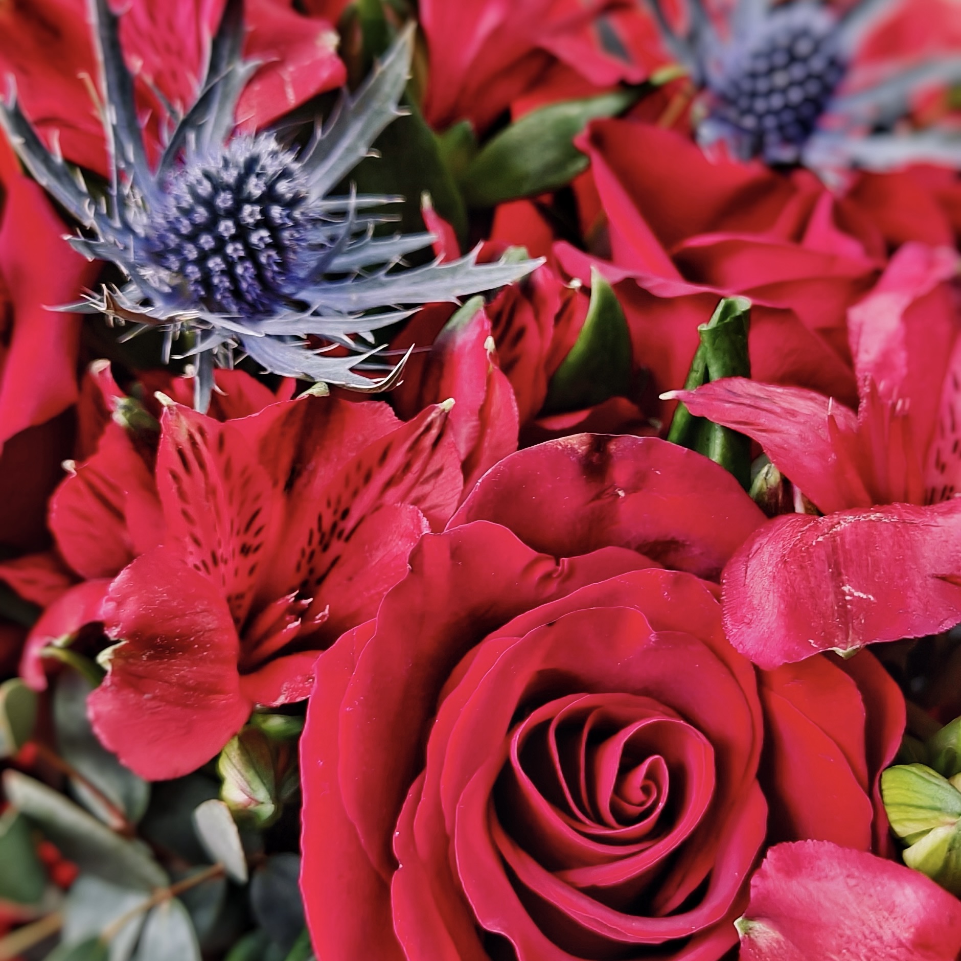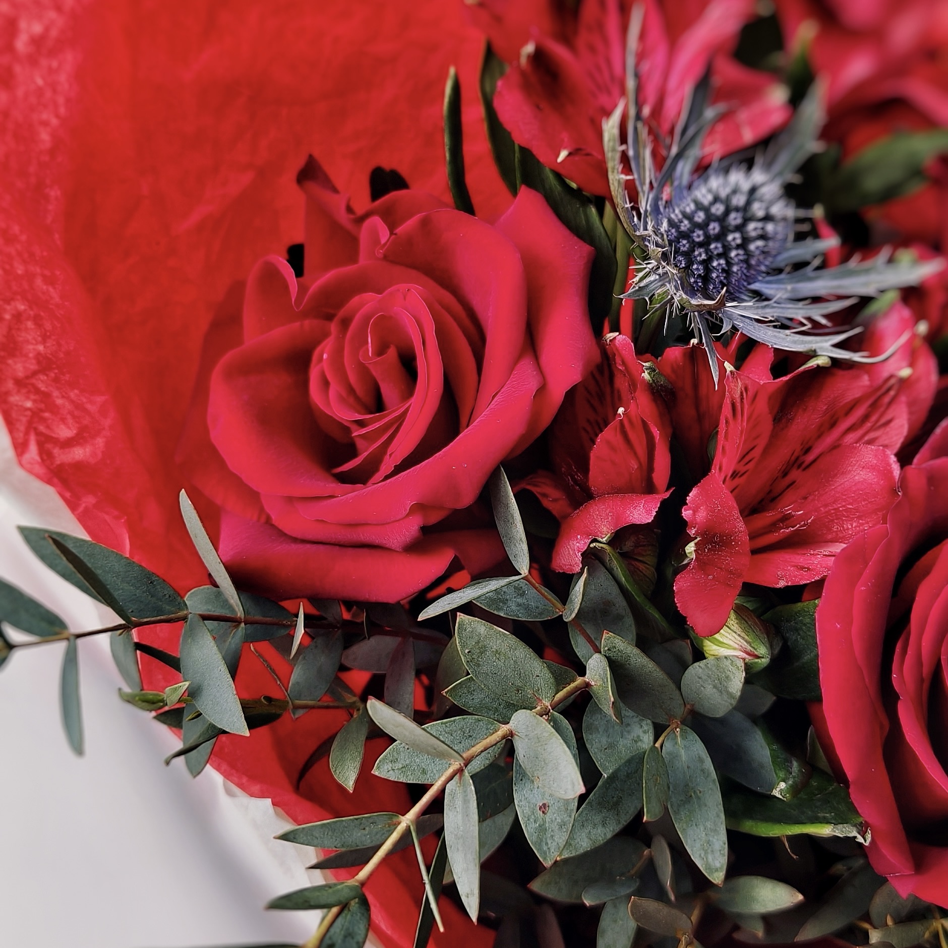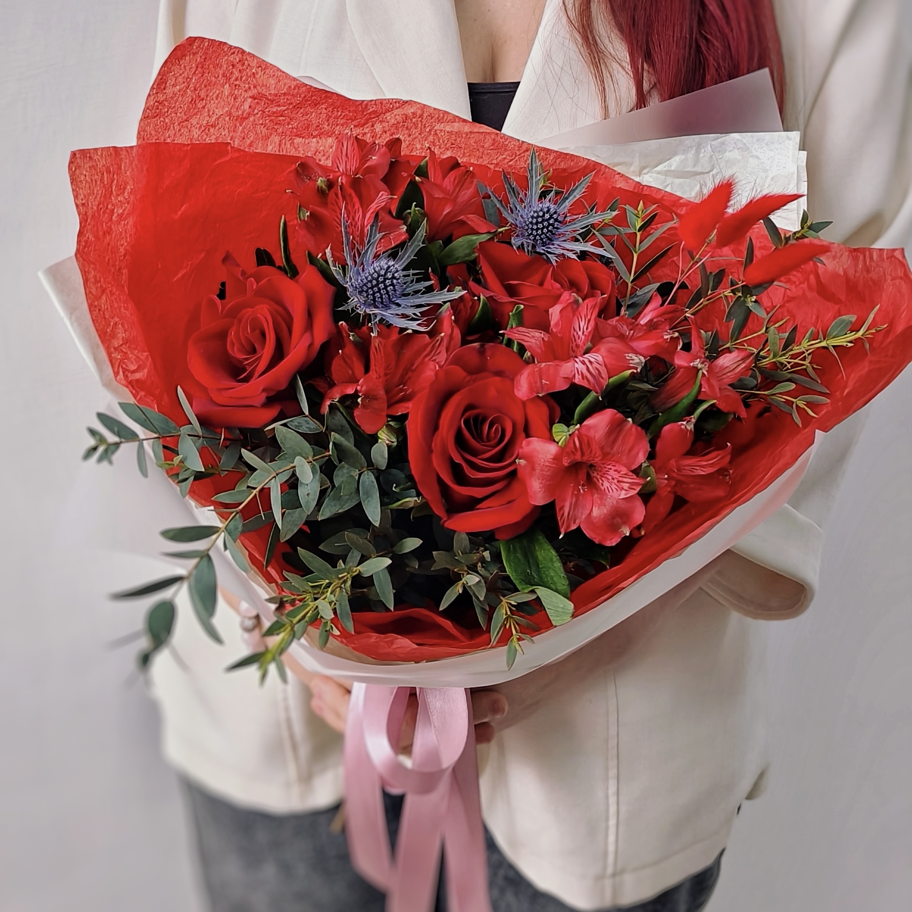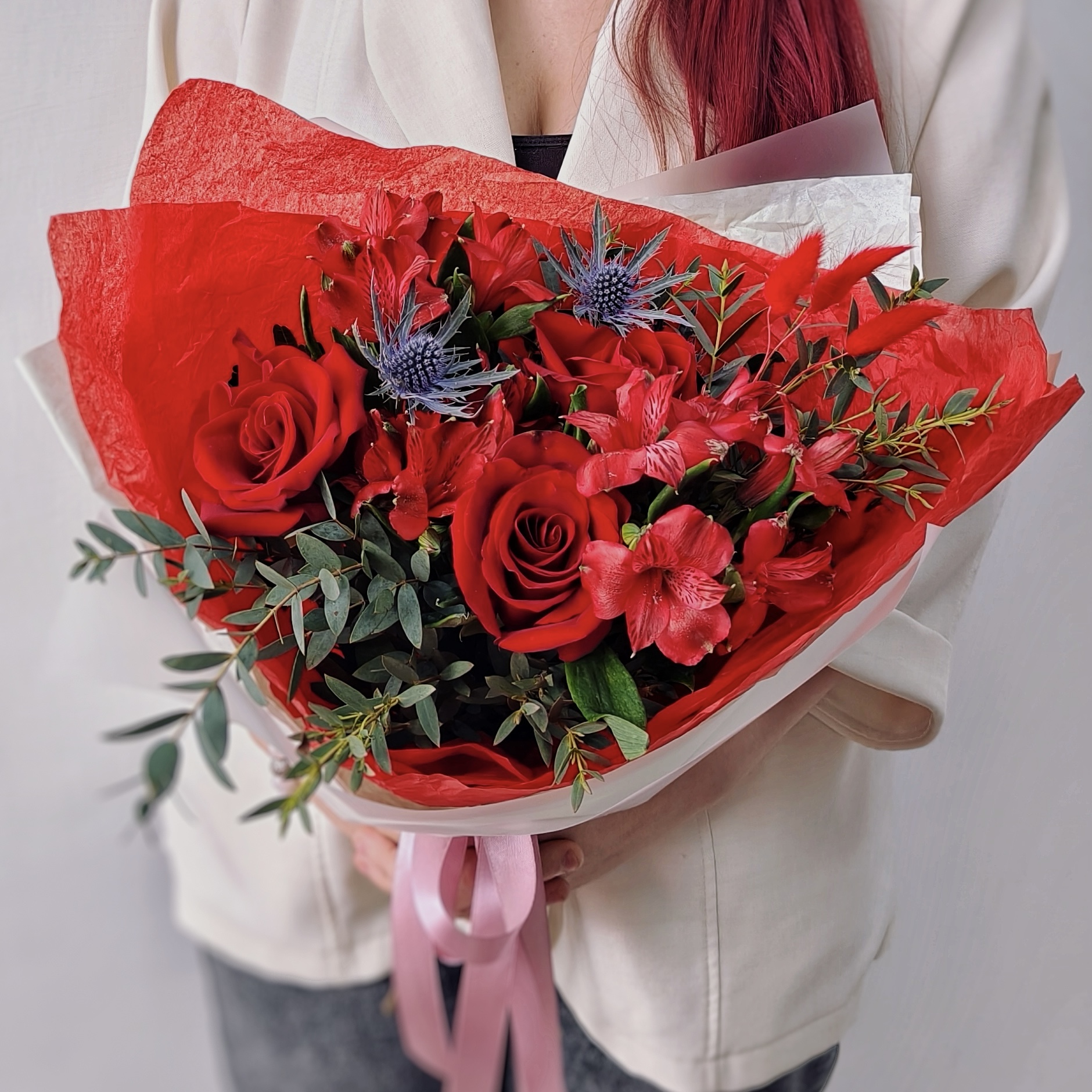 Сочетание глубоких бордовых роз, нежной альстромерии и ароматного эвкалипта создает букет, который говорит о чувствах без лишних слов.