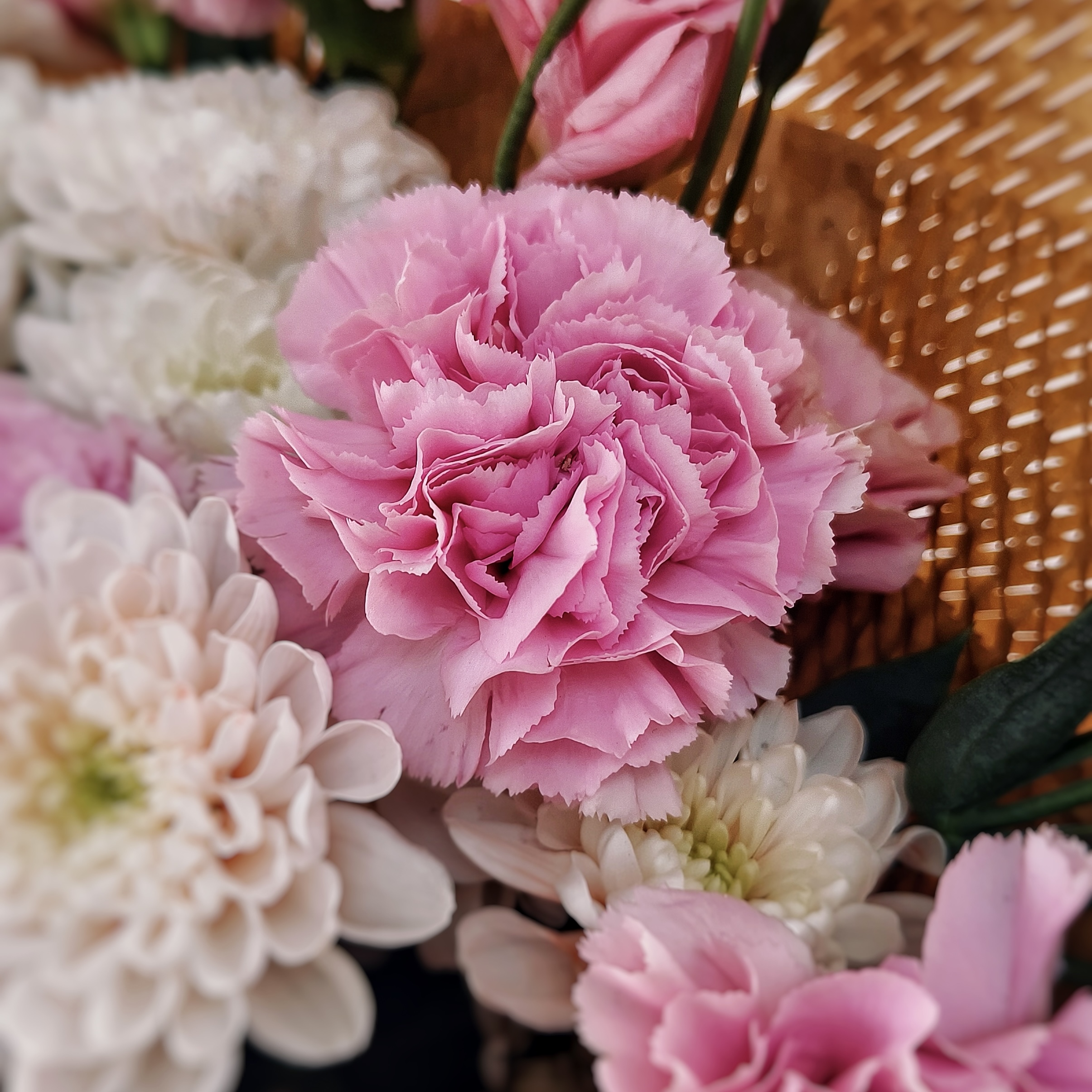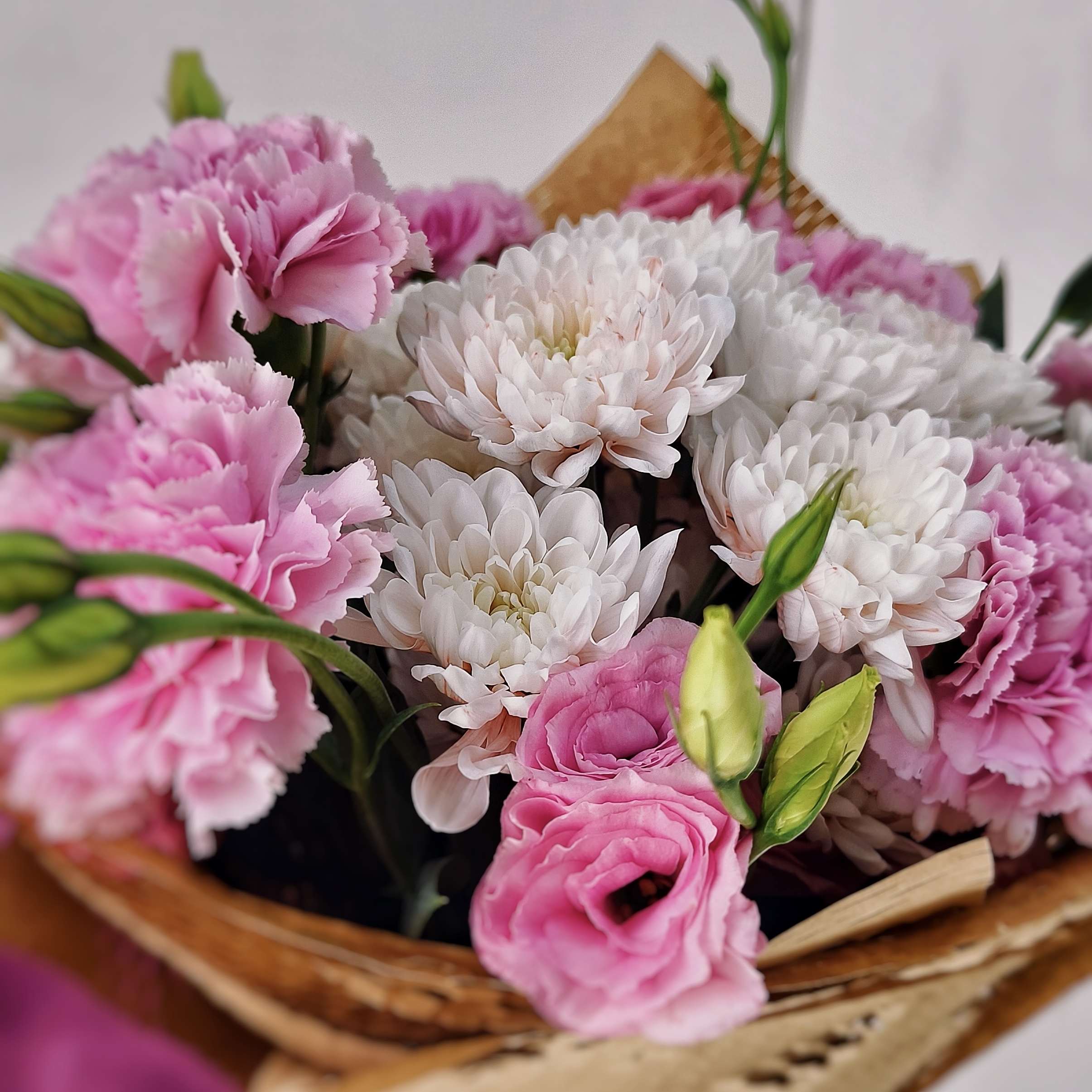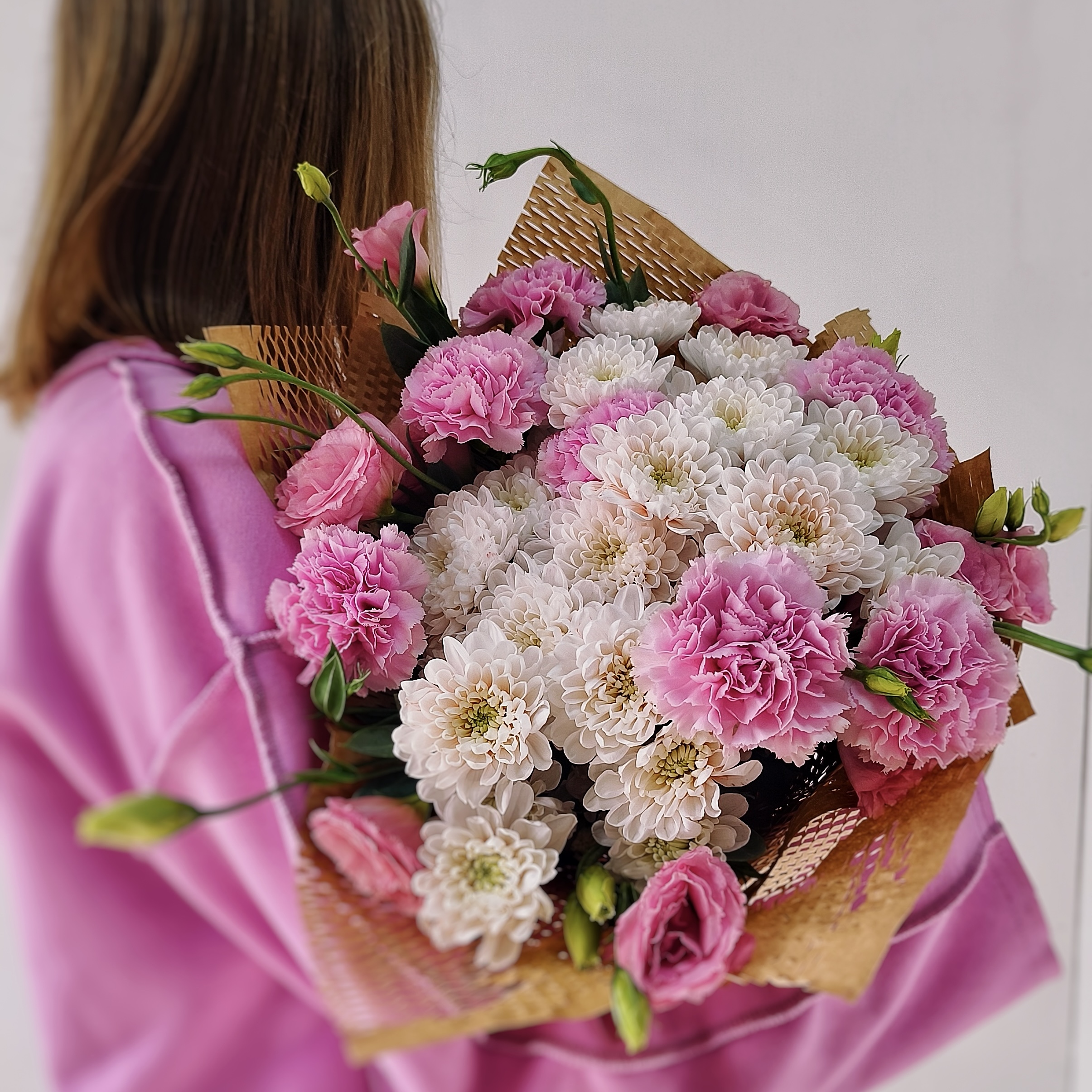 Яркий, как первый поцелуй, и нежный, как весенний рассвет — этот букет размером 45/47 см создан для самых искренних признаний. В его сердце — роскошный розовый диантус и удивительная кустовая хризантема с её лепестками, которая добавляет объём букету. Утончённая эустома добавляет изящества. Букет получается объёмным, фактурным и невероятно фотогеничным — идеальный выбор для дня рождения, годовщины, Пасху или сюрприза без повода.