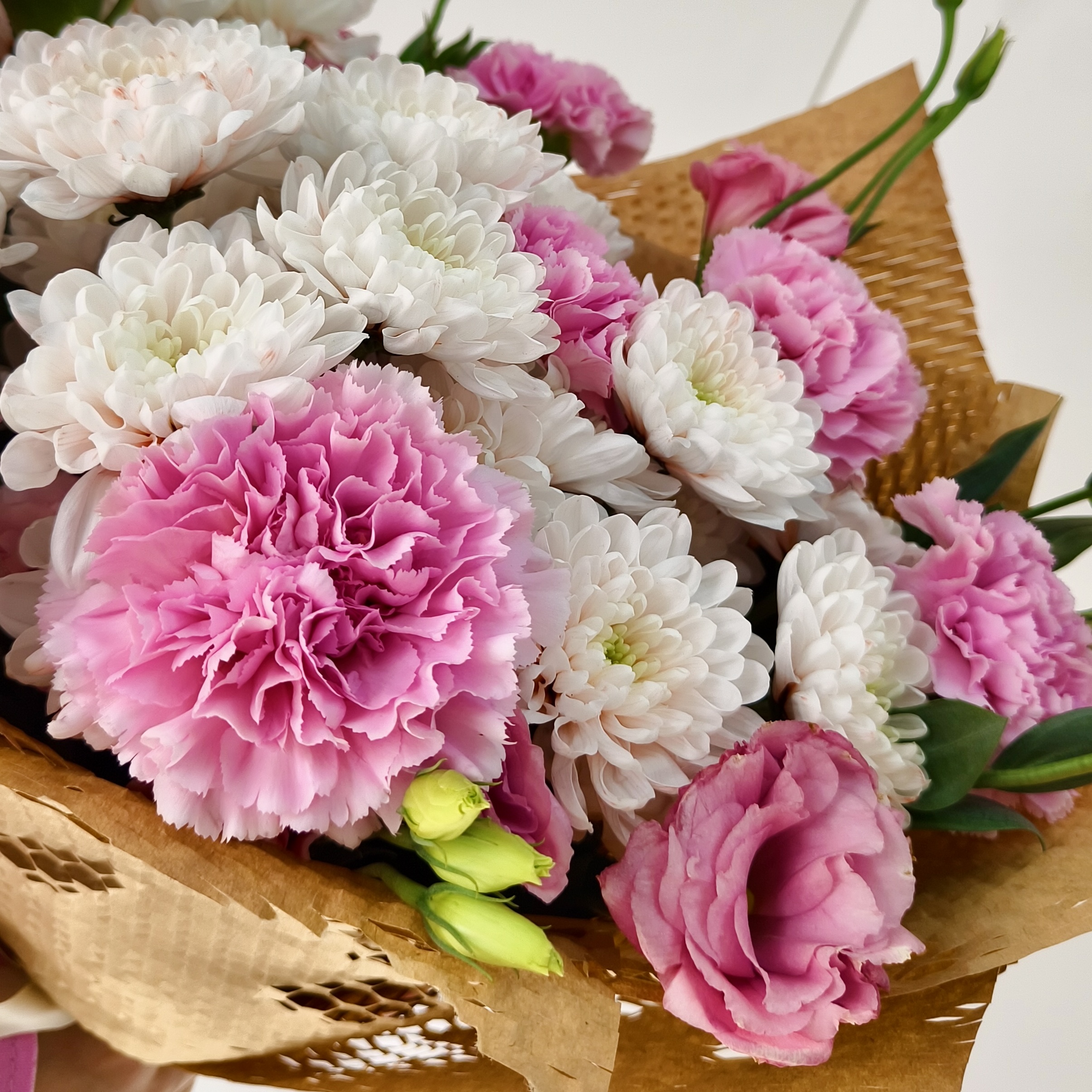 Готовый букет с эустомой, гвоздиками и кустовой хризантемой купить с доставкой в Бердске