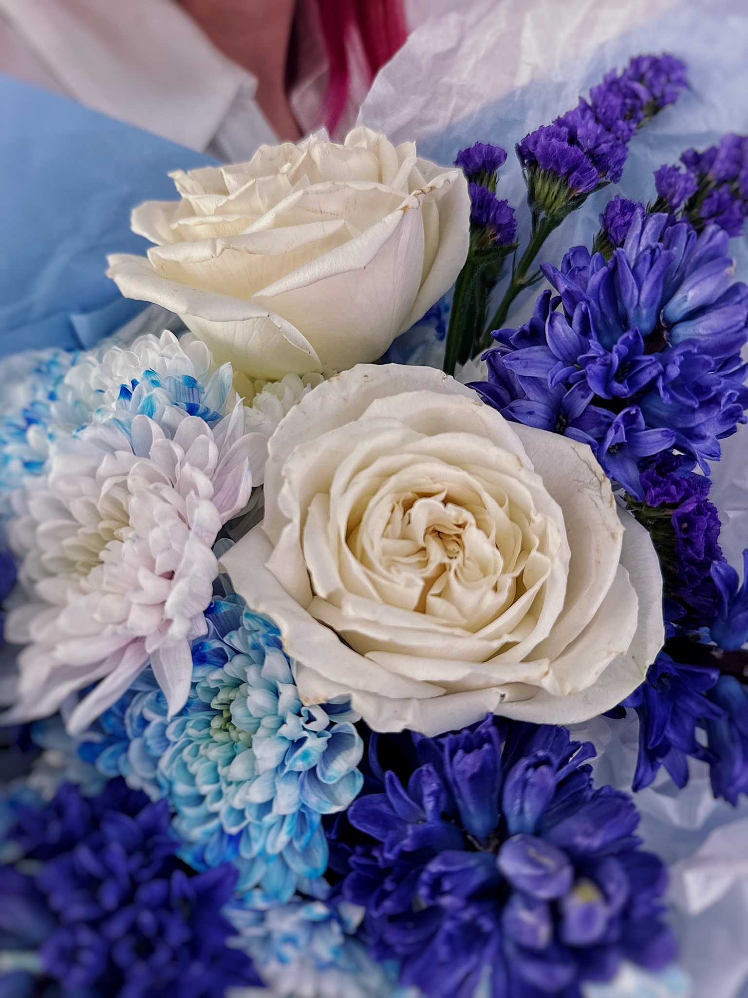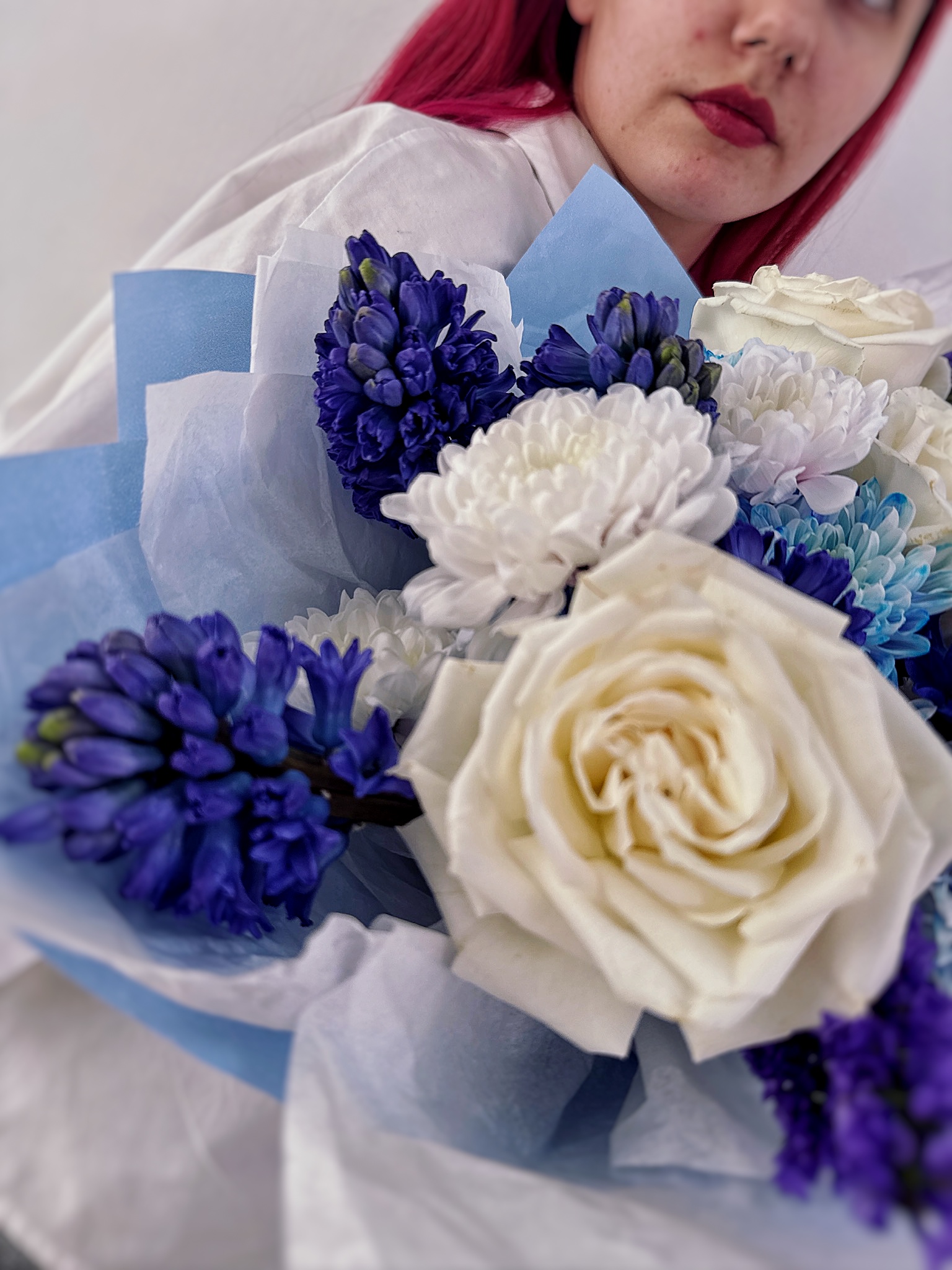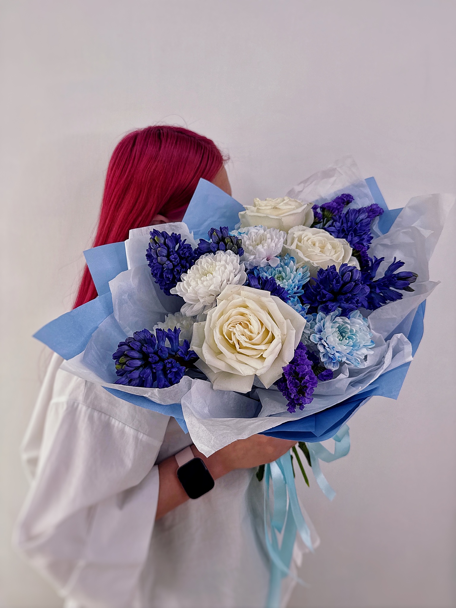 Сочетание ярких гиацинтов, нежной розы и свежей хризантемы выглядит гармонично и радостно — идеальный выбор для 8 Марта, Пасхи, дня рождения или просто для того, чтобы порадовать близкого человека без повода.