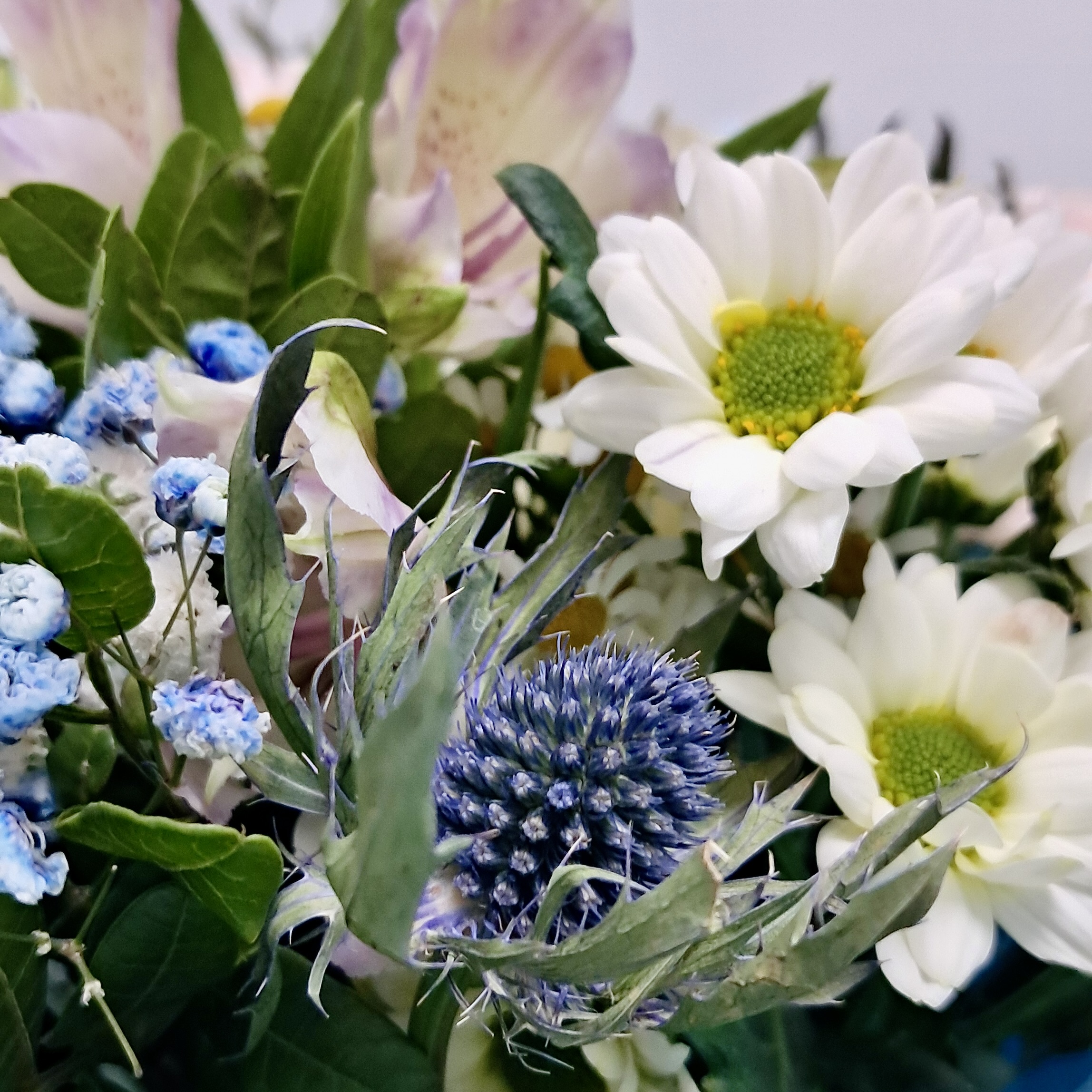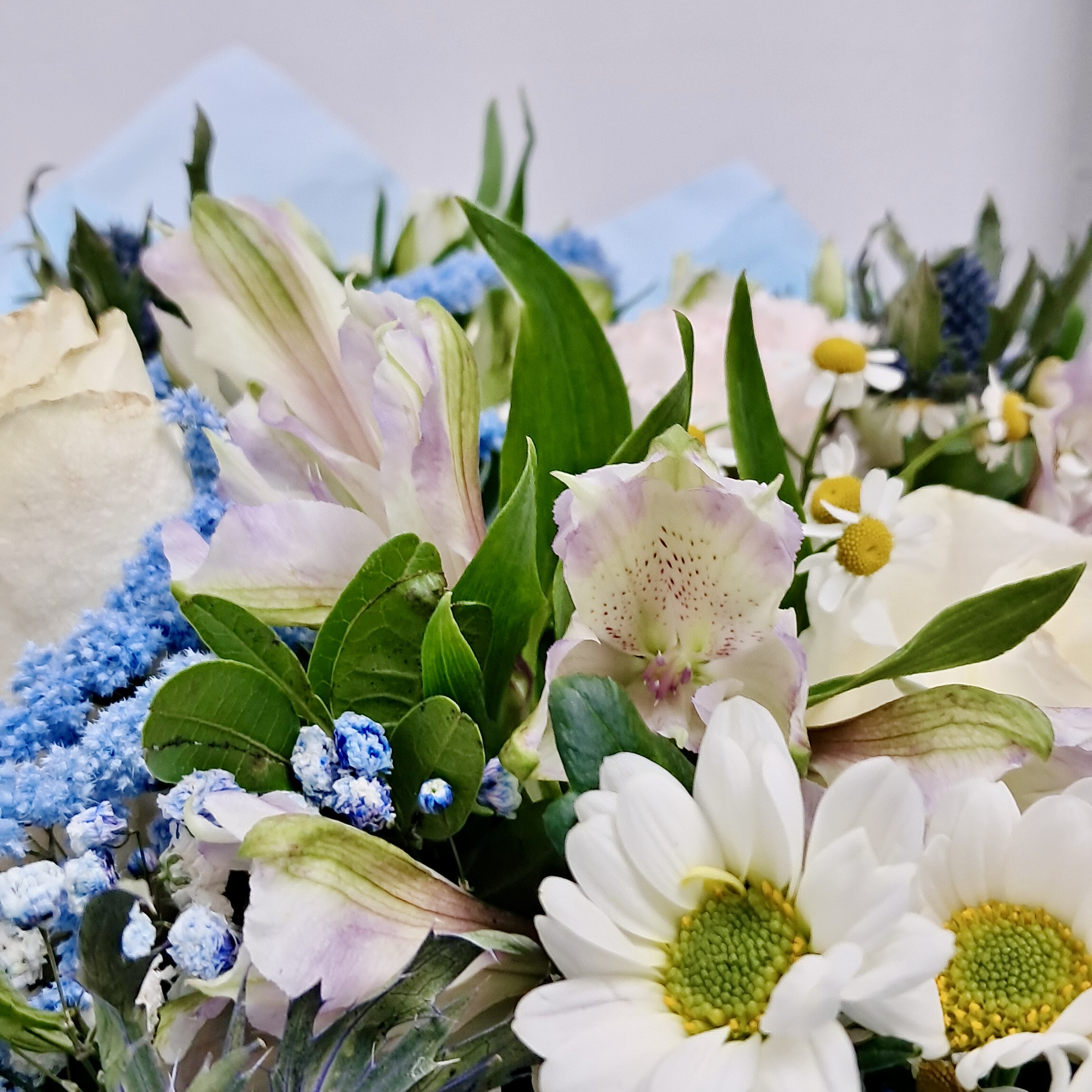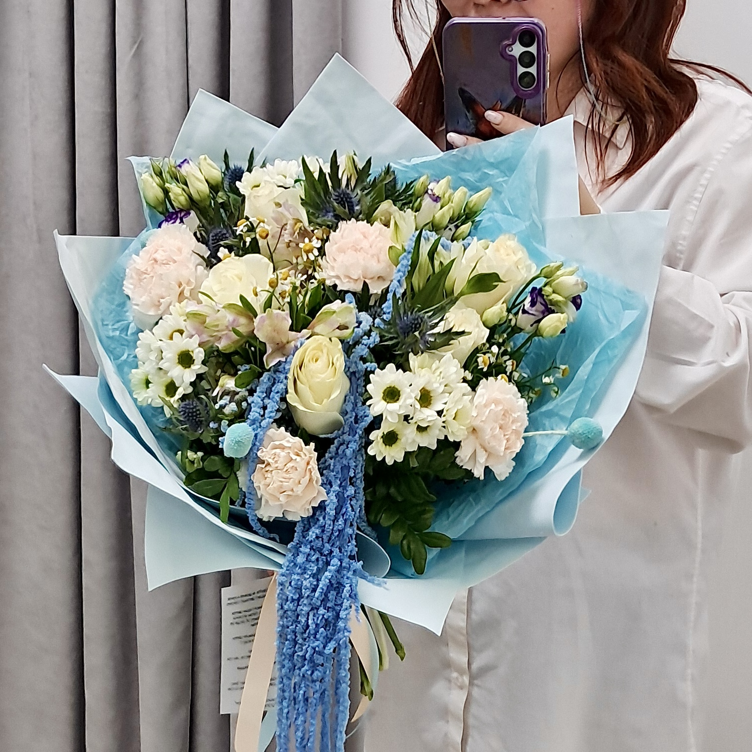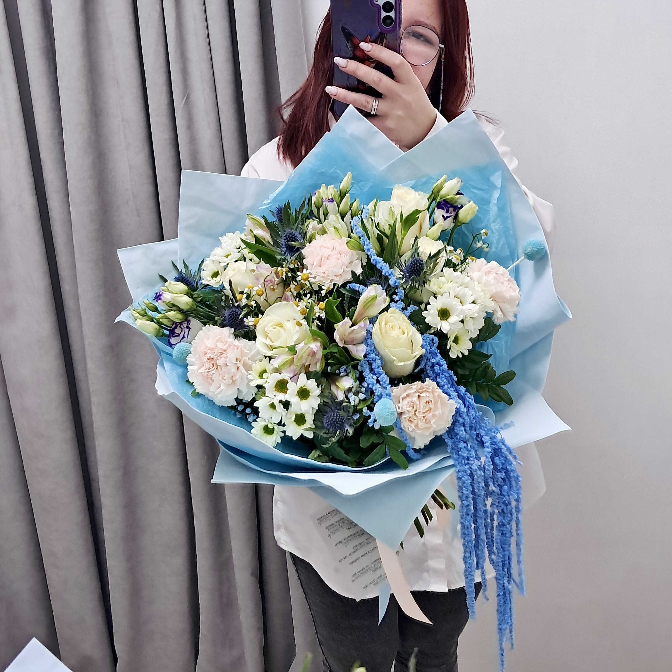 Холодная элегантность зимнего утра! Свежая хризантема, дымчатый голубой амарант и нежные розы создают утонченную композицию, полную спокойствия, свежести и благородного сияния.