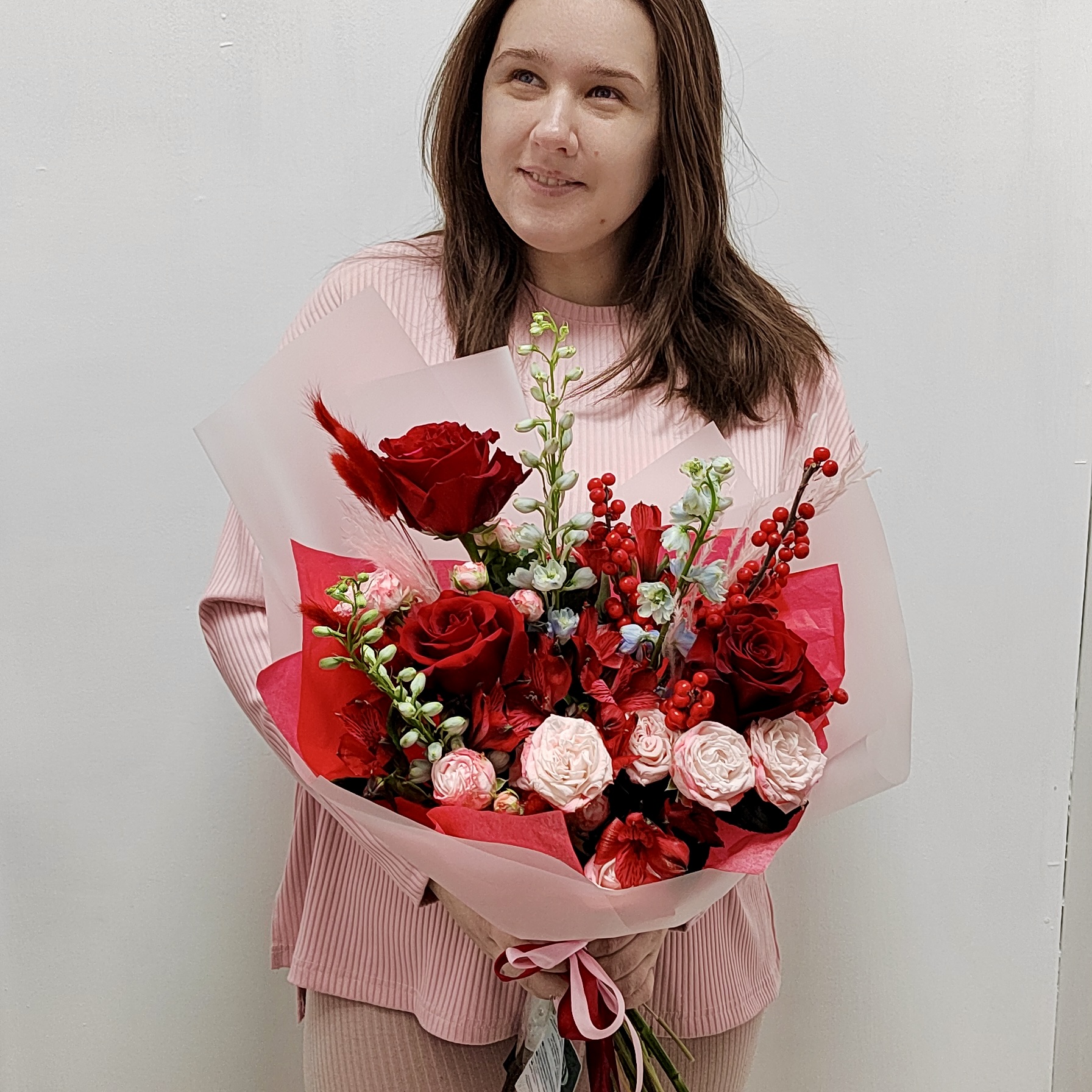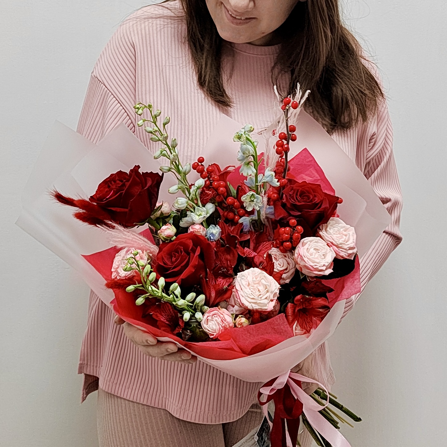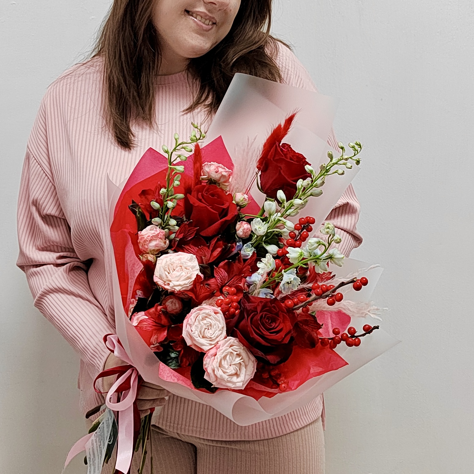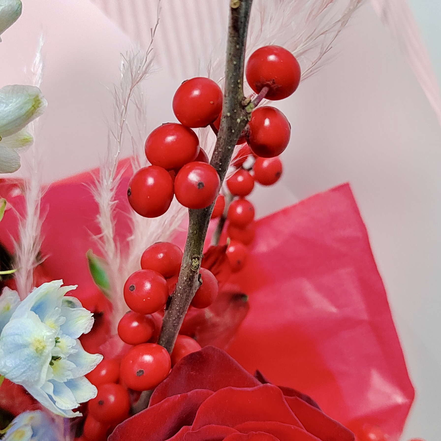 Этот готовый букет сочетает пламенные красные розы, элегантные ягоды илекс и воздушные голубые дельфиниумы. Яркое противопоставление насыщенного и нежного создает запоминающийся образ, полный глубины и гармонии.