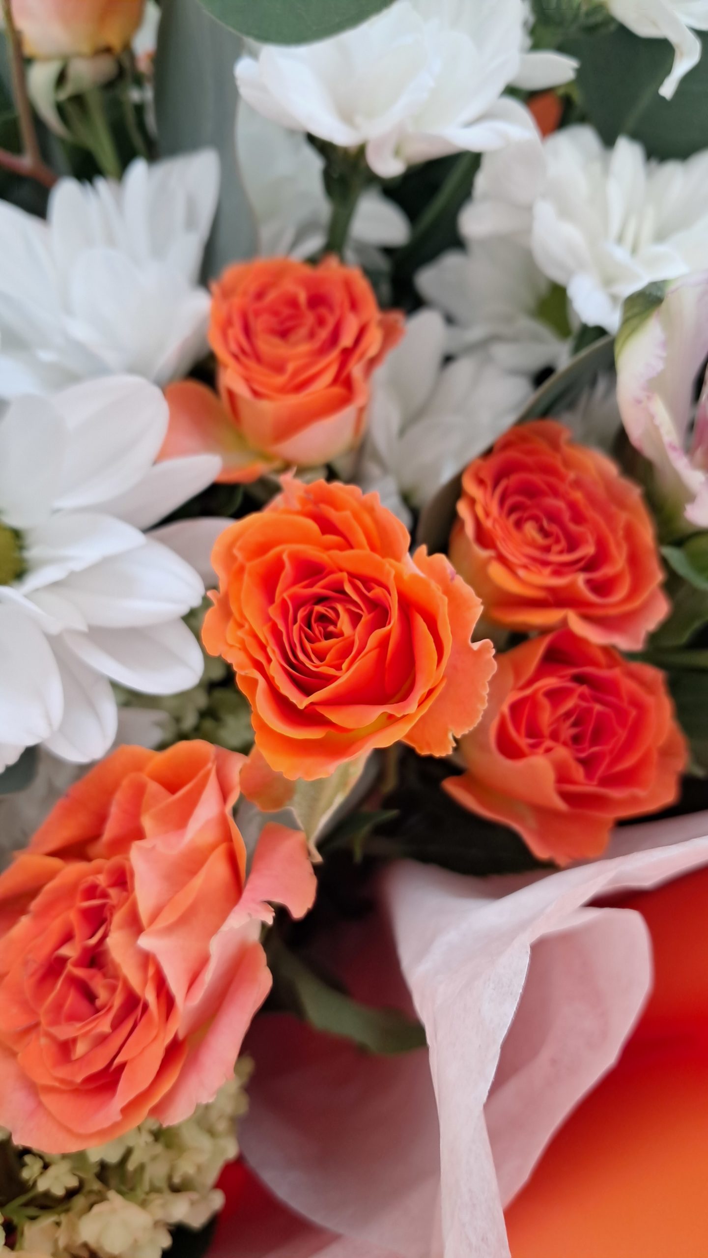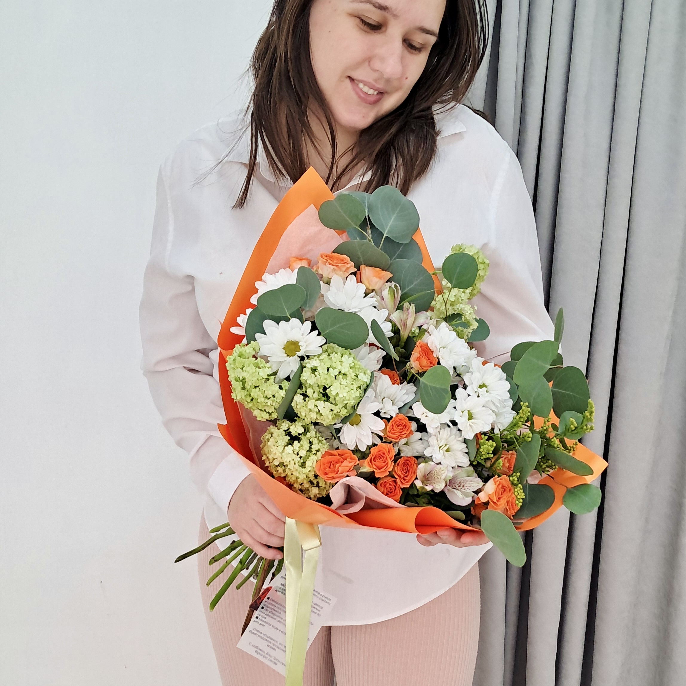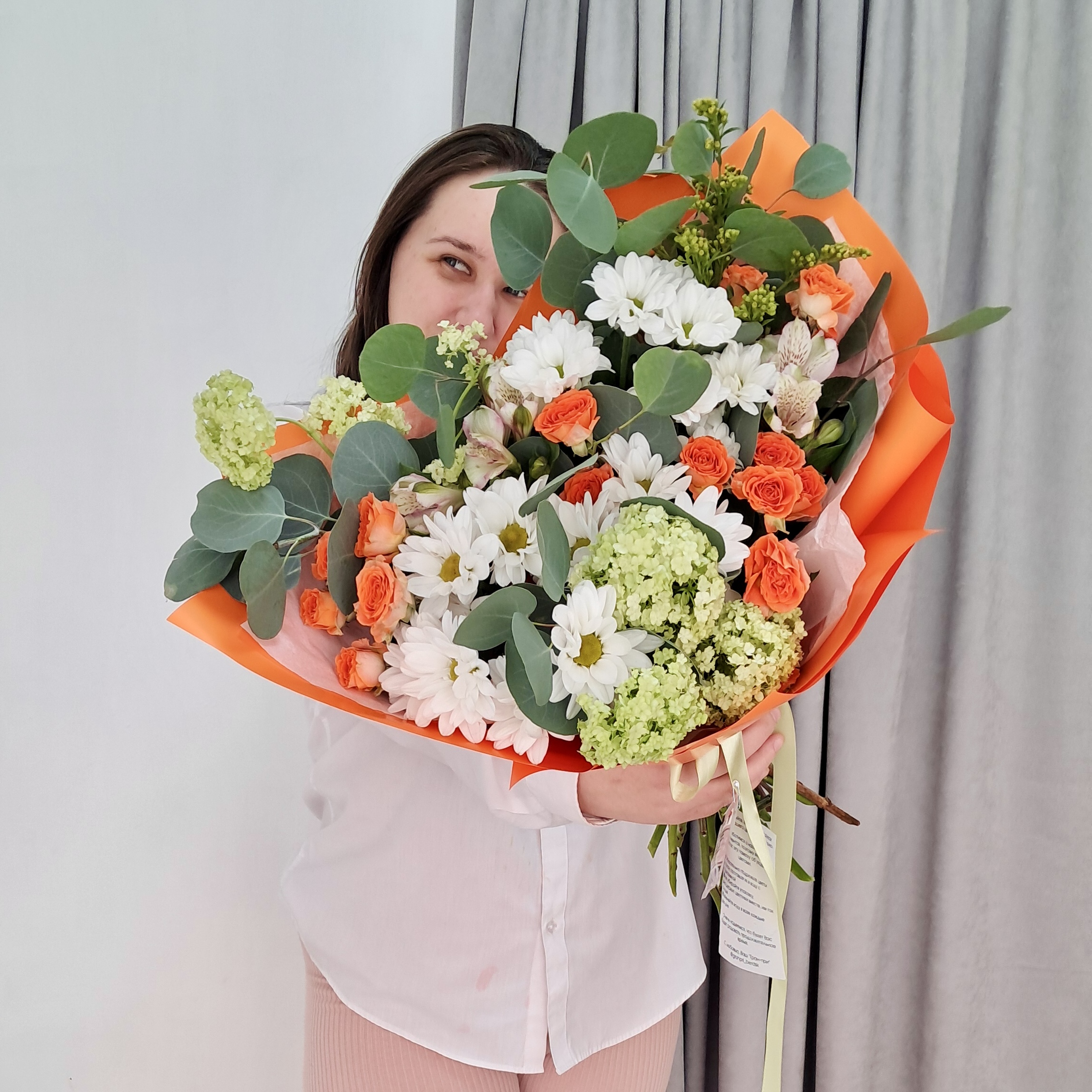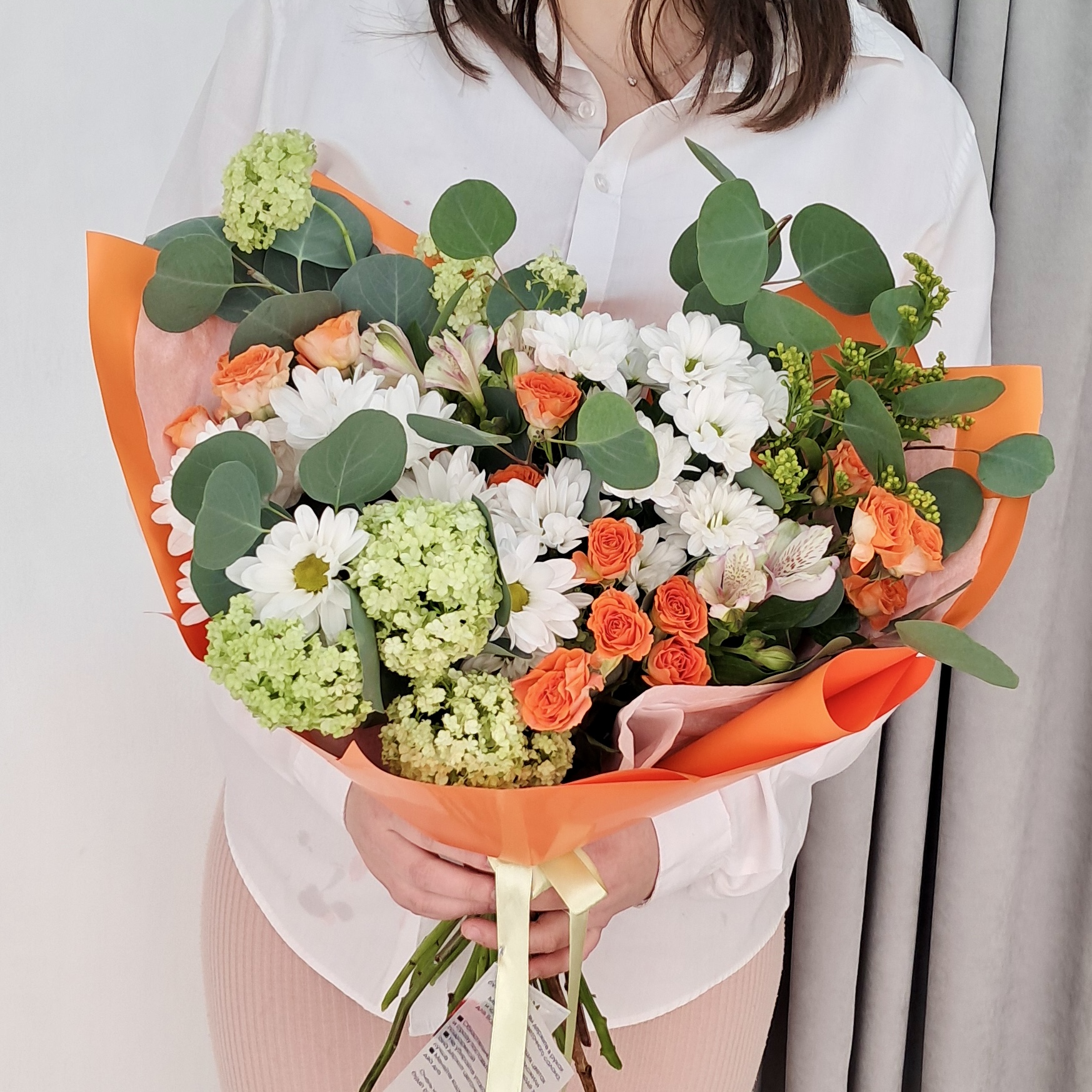 Готовый букет с кустовой оранжевой розой, хризантемой ромашкой и эвкалиптом