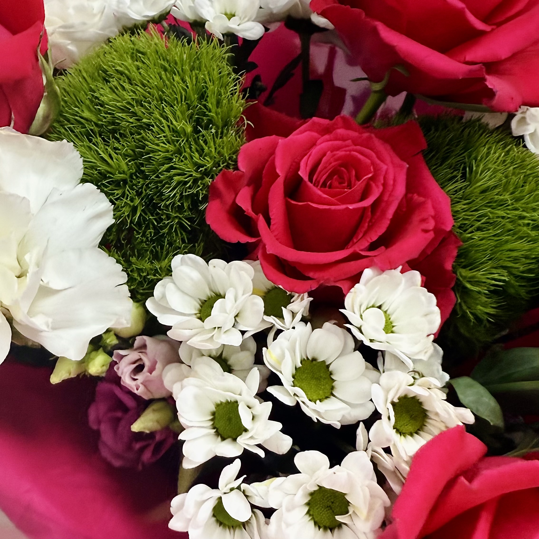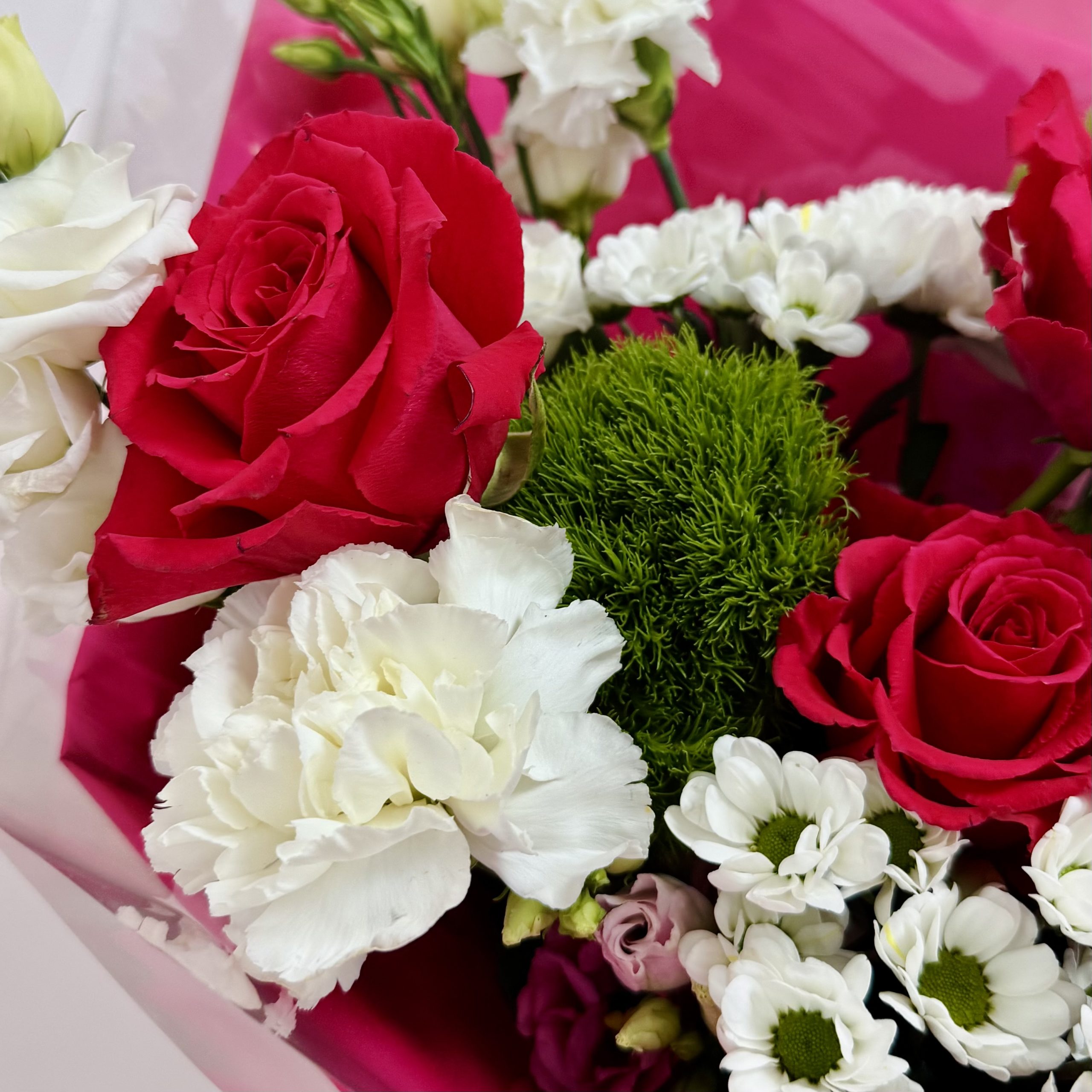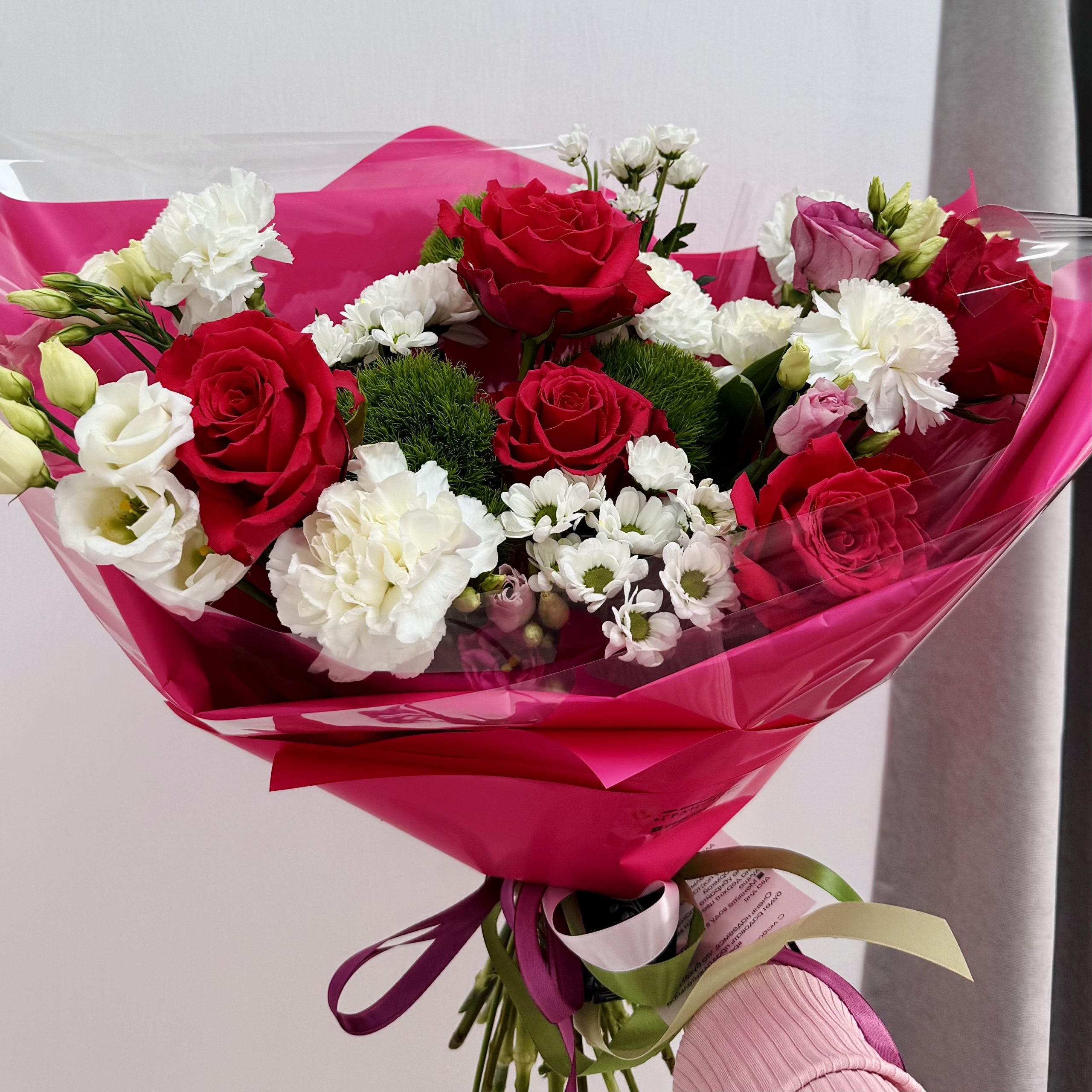 Данный букет размером 50/60 см выполнен в насыщенной малиново-розовой гамме и включает малиновые розы, эустомы и хризантемы сантини. Это пример нашего предложения для особых поводов: предложение руки и сердца, юбилей, день рождения, важное достижение или грандиозный романтический сюрприз