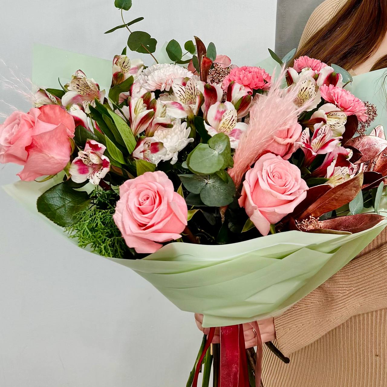 Роскошный букет размером 55*60 см из нежно-розовых роз, стойкой альстромерии и эффектной золотой скимии — идеальный выбор для особых случаев и стильных подарков!
