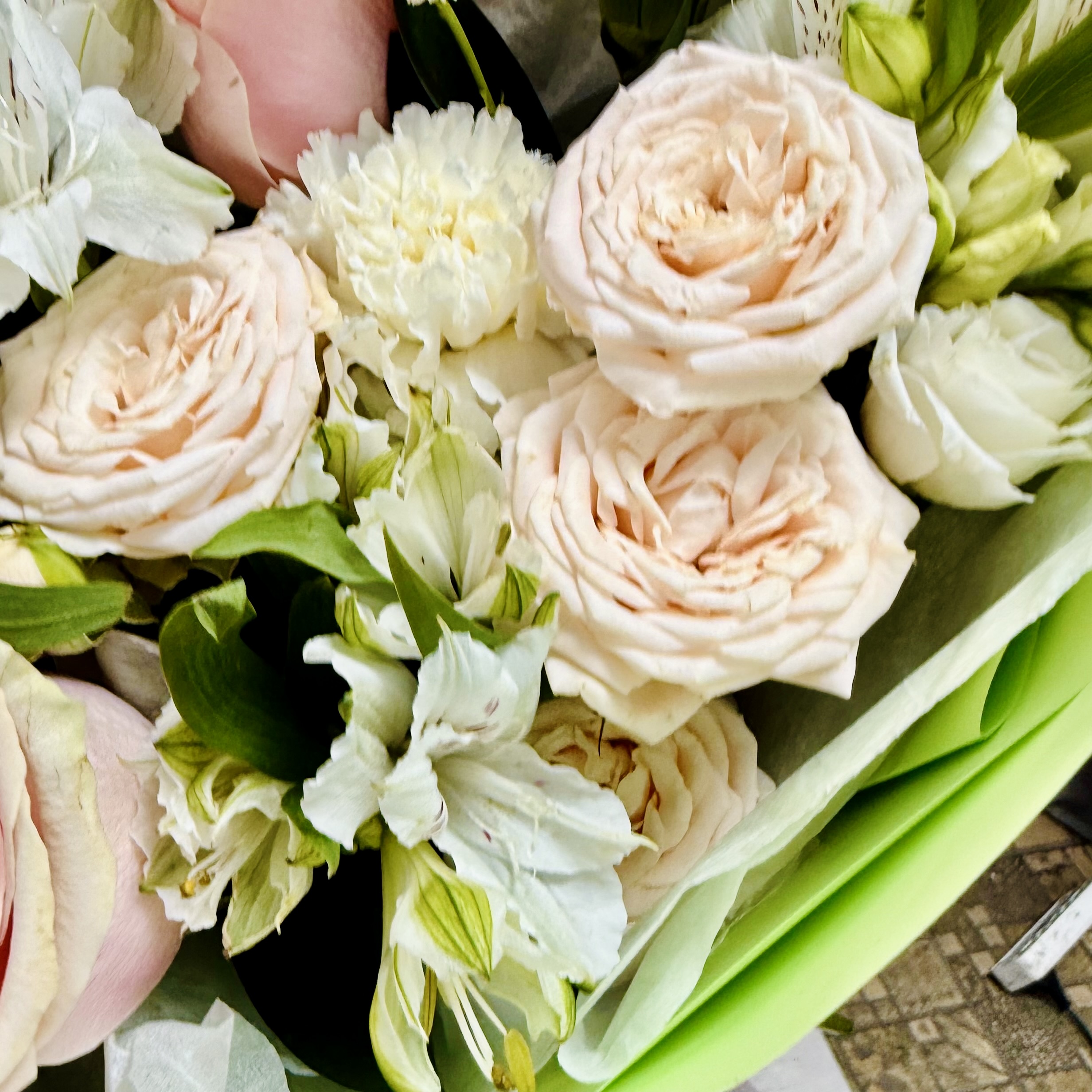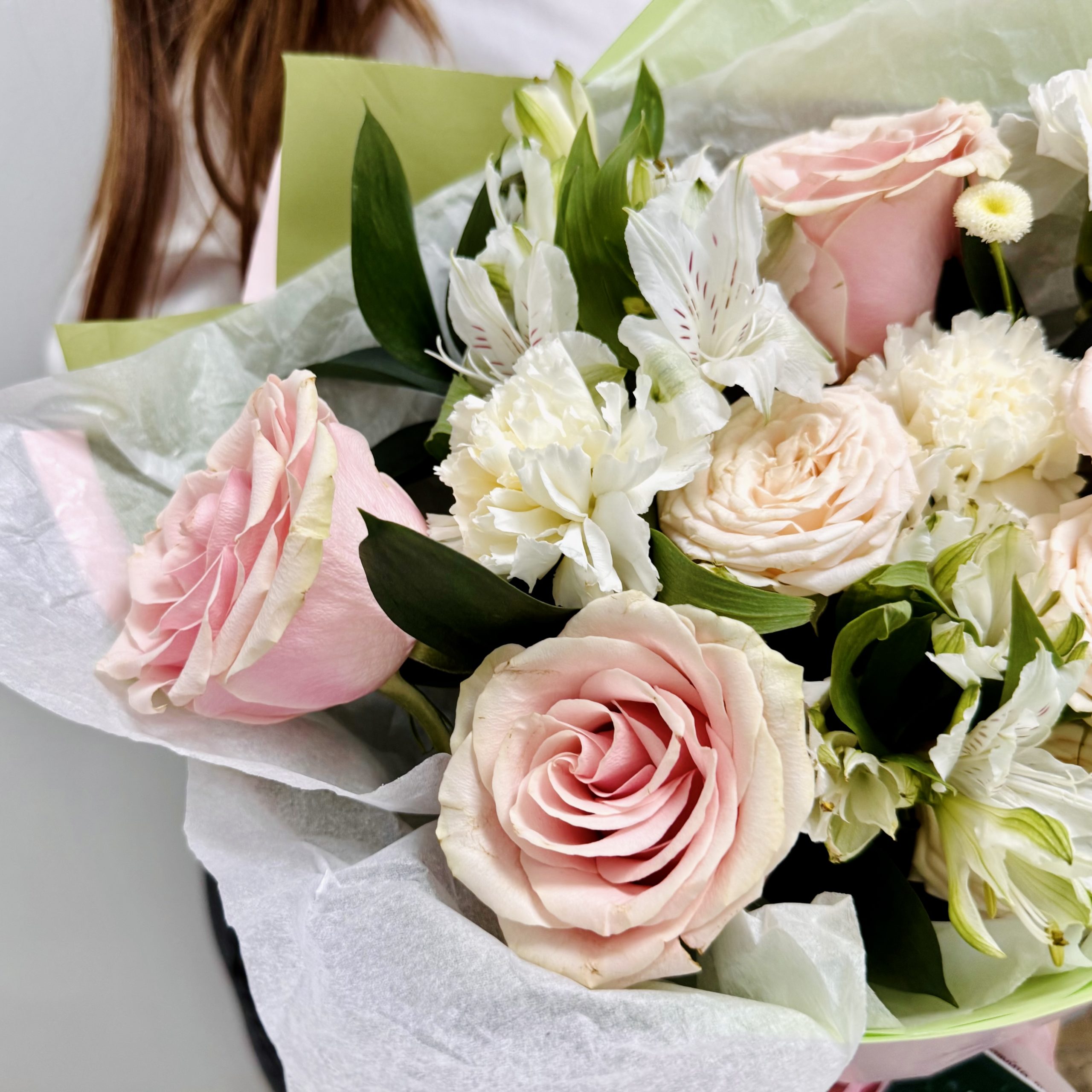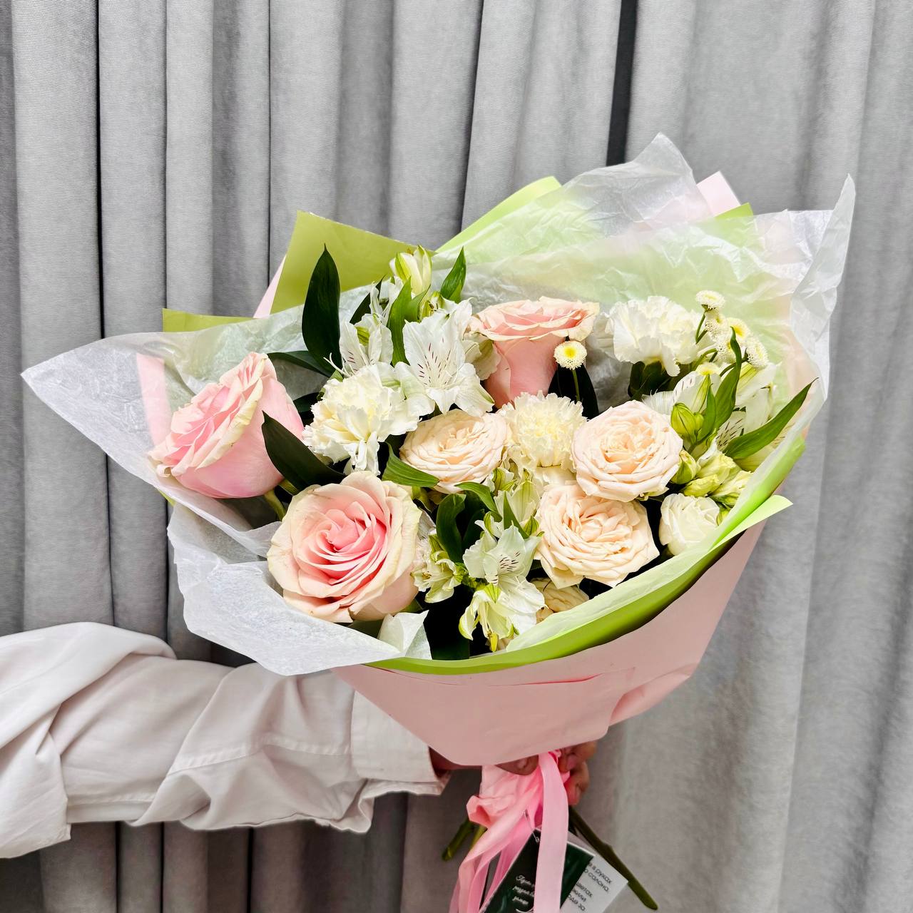 Очаровательный букет из нежно-розовых роз, стойких гвоздик и элегантной альстромерии — идеальный выбор для утончённого подарка. Свежесть и гармония сочетаются в каждой композиции.