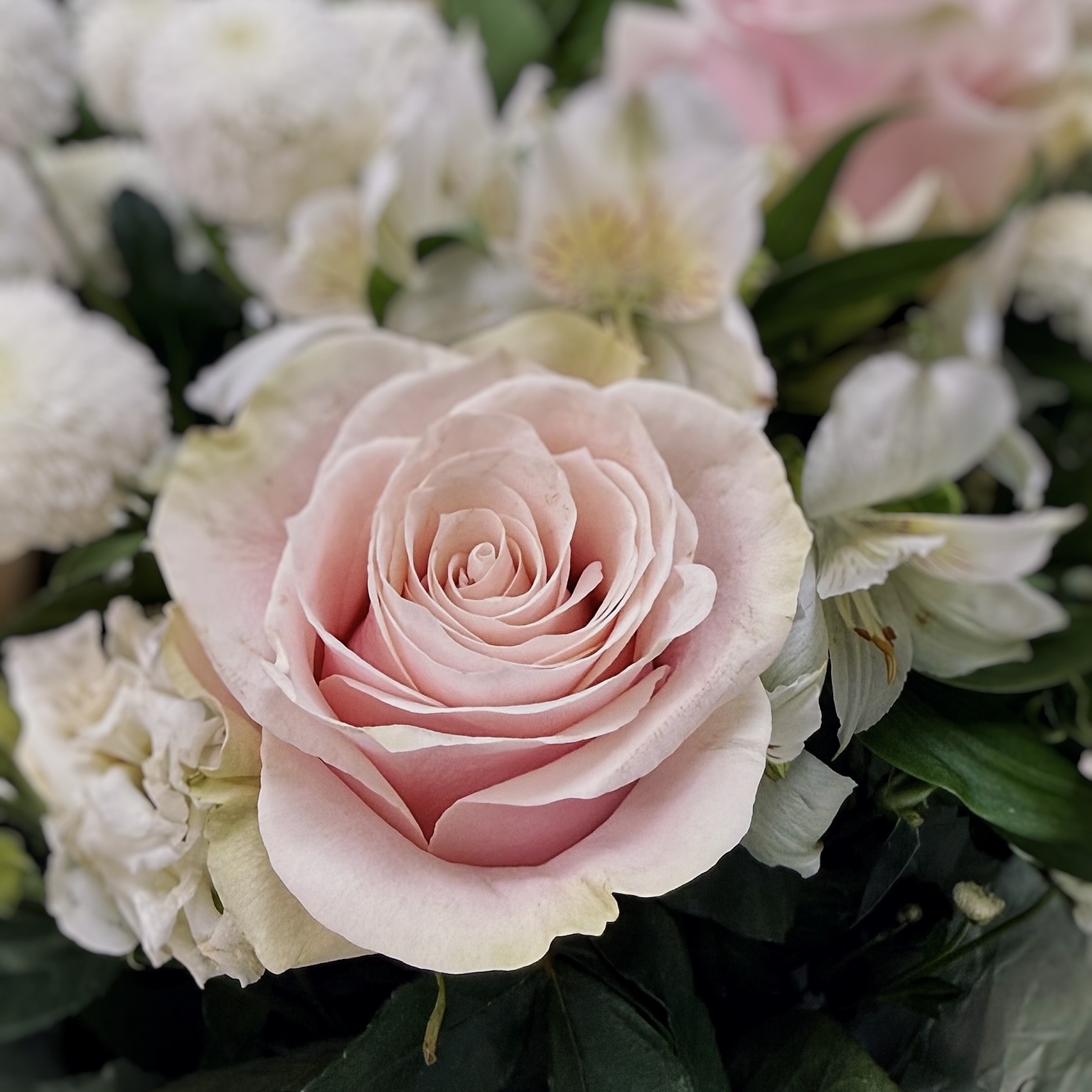 Нежность, стиль и безупречный вкус — этот букет создан для самых трогательных моментов. Нежно-розовые розы, словно облака на закате, символизируют зарождающееся чувство и искреннюю симпатию. Пышная кустовая хризантема добавляет композиции объёма и свежести, а трогательные гвоздики с их изящными лепестками привносят нотку душевного тепла