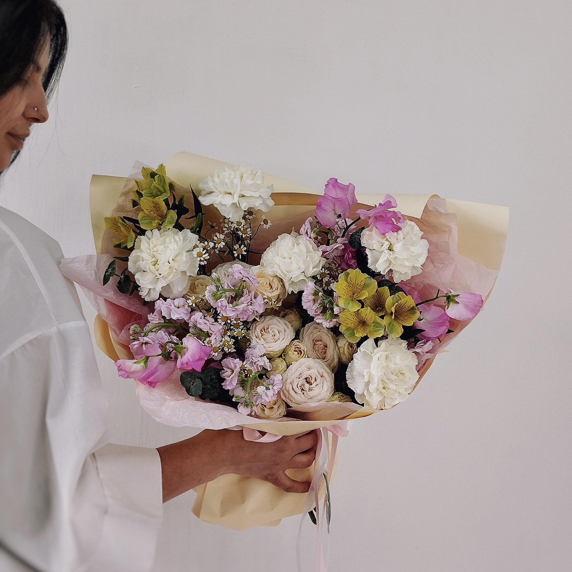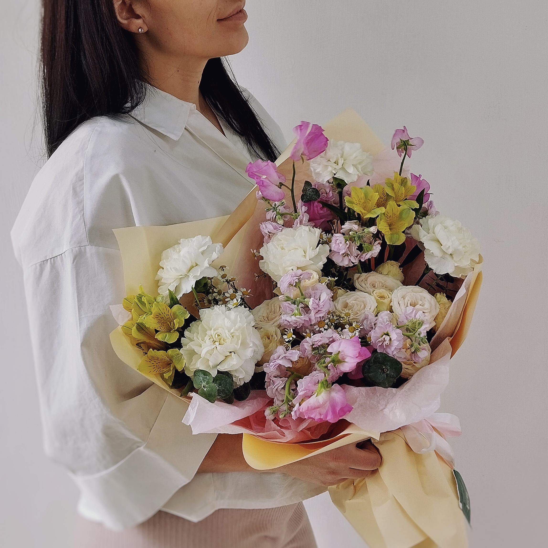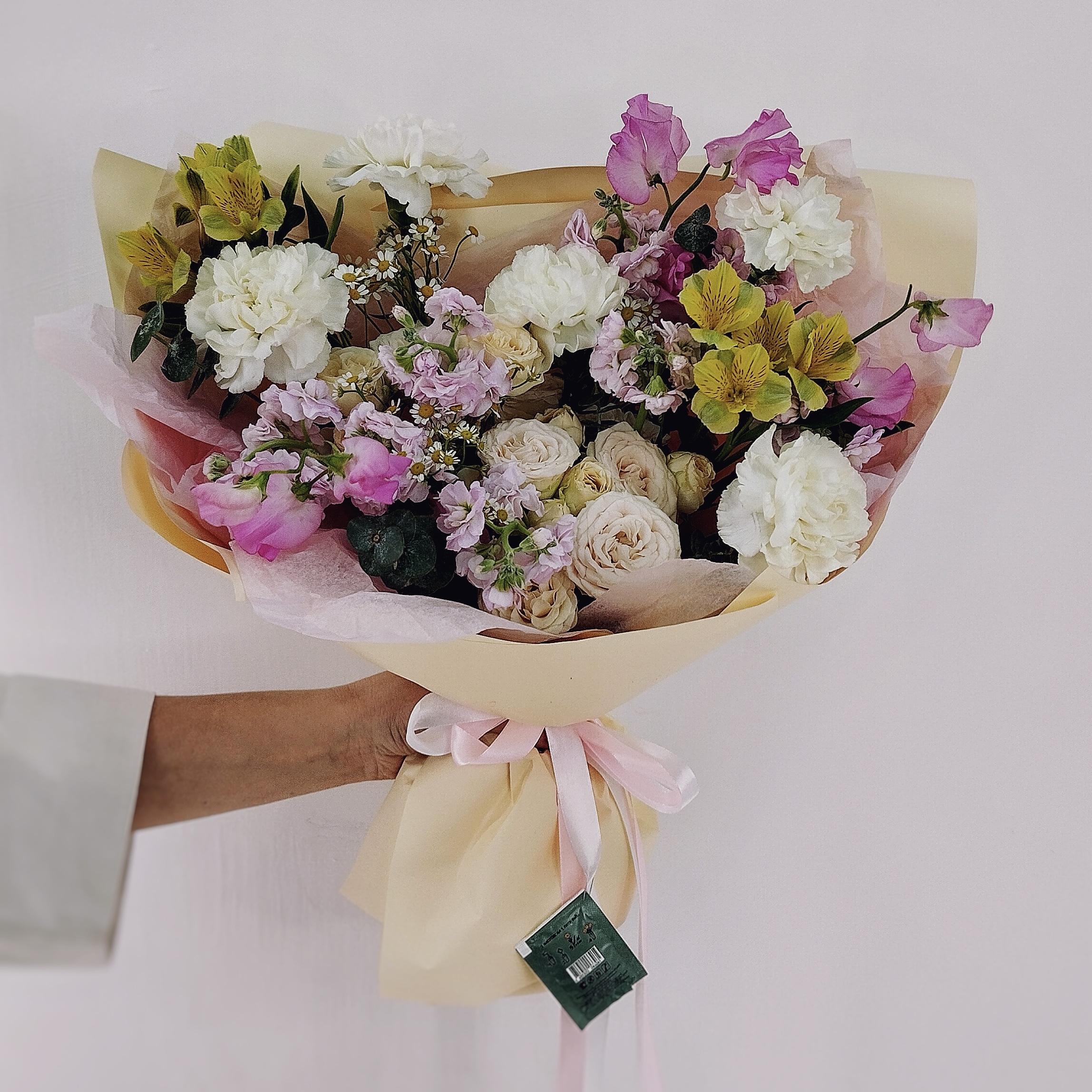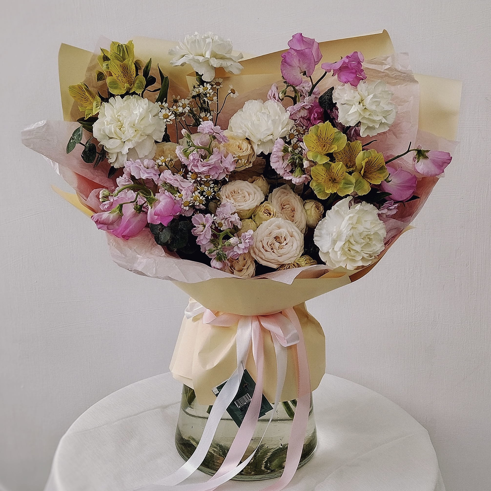 Этот букет — настоящая симфония ароматов: сладкий горошек, пряная маттиола и нежная роза дополняются свежестью ромашки и графичной гвоздикой. Идеально для романтического вечера или сюрприза без повода