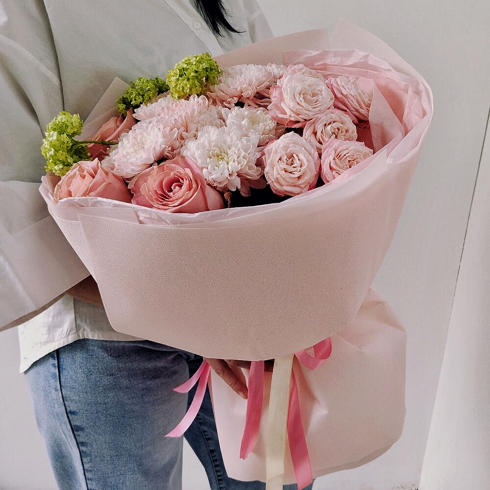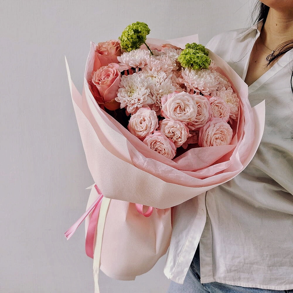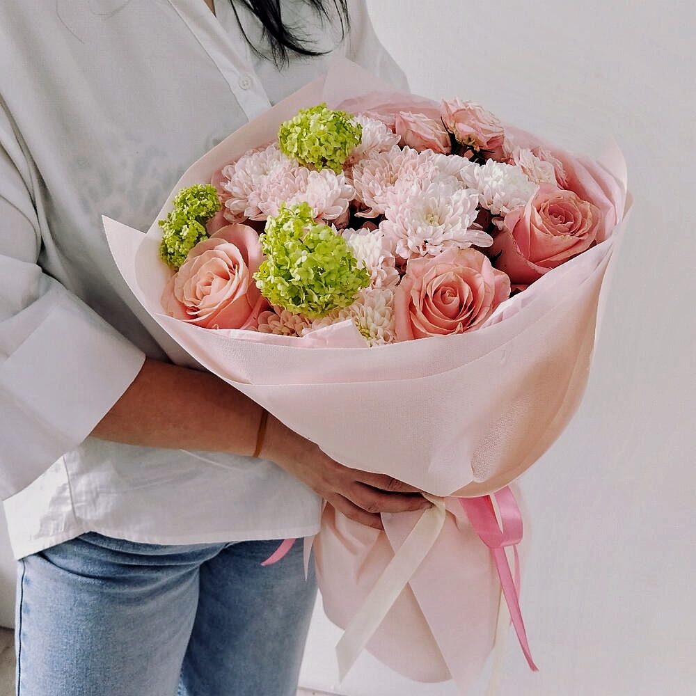 Готовый стильный букет в нежной розовой гамме. В составе крупные одиночные и кустовые пионовидные розы, воздушный, сочный вибурнум и нежные кустовые хризантемы. Прекрасный подарок для любимой девушки или жены. Букет оформлен в стильную, воздушную упаковку»Зефир» и нежную бумагу «тишью»