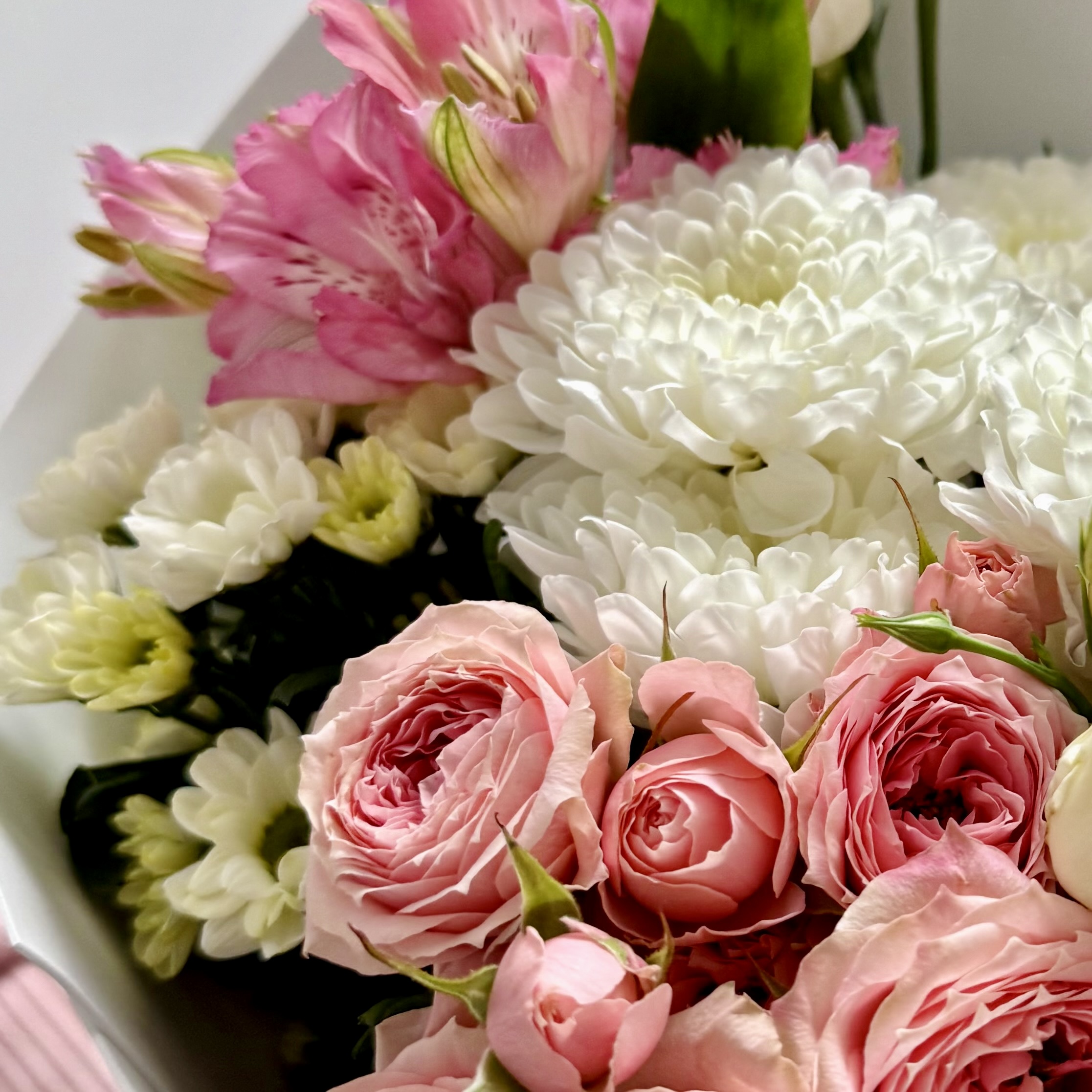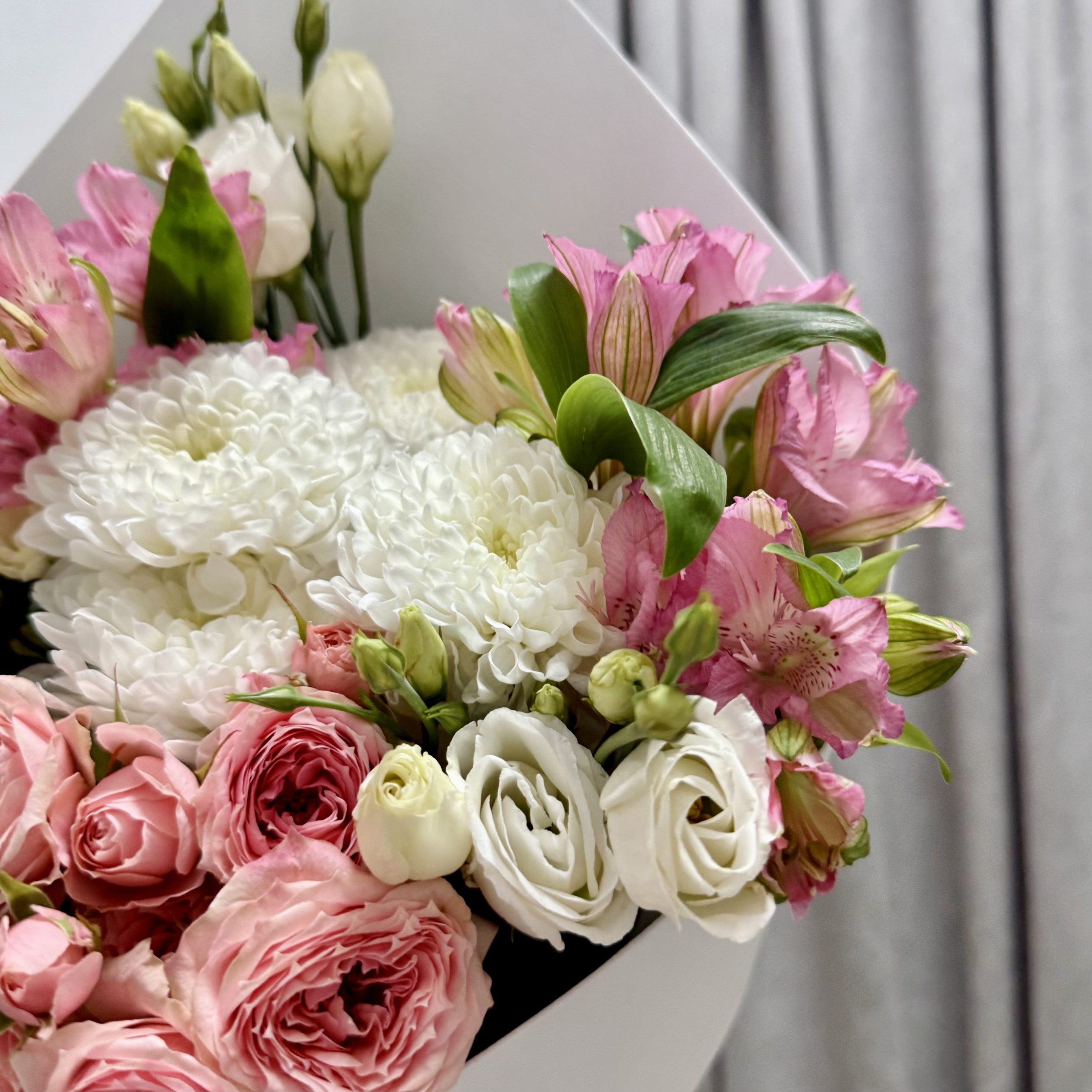 Готовый букет с пионовидной кустовой розой, альстромерией и эустомой