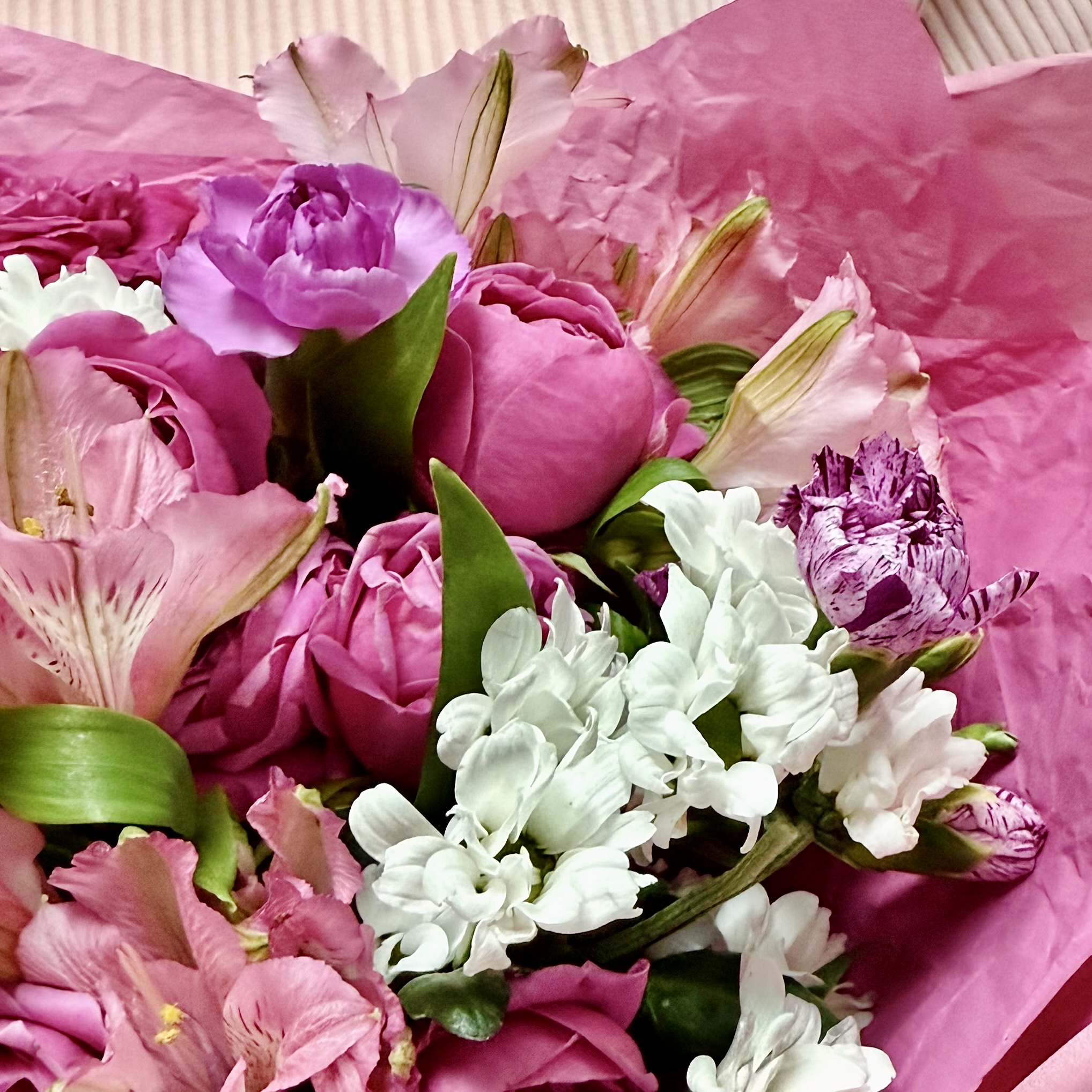 Готовый букет с пионовидными кустовыми розами, альстромерией и сантини