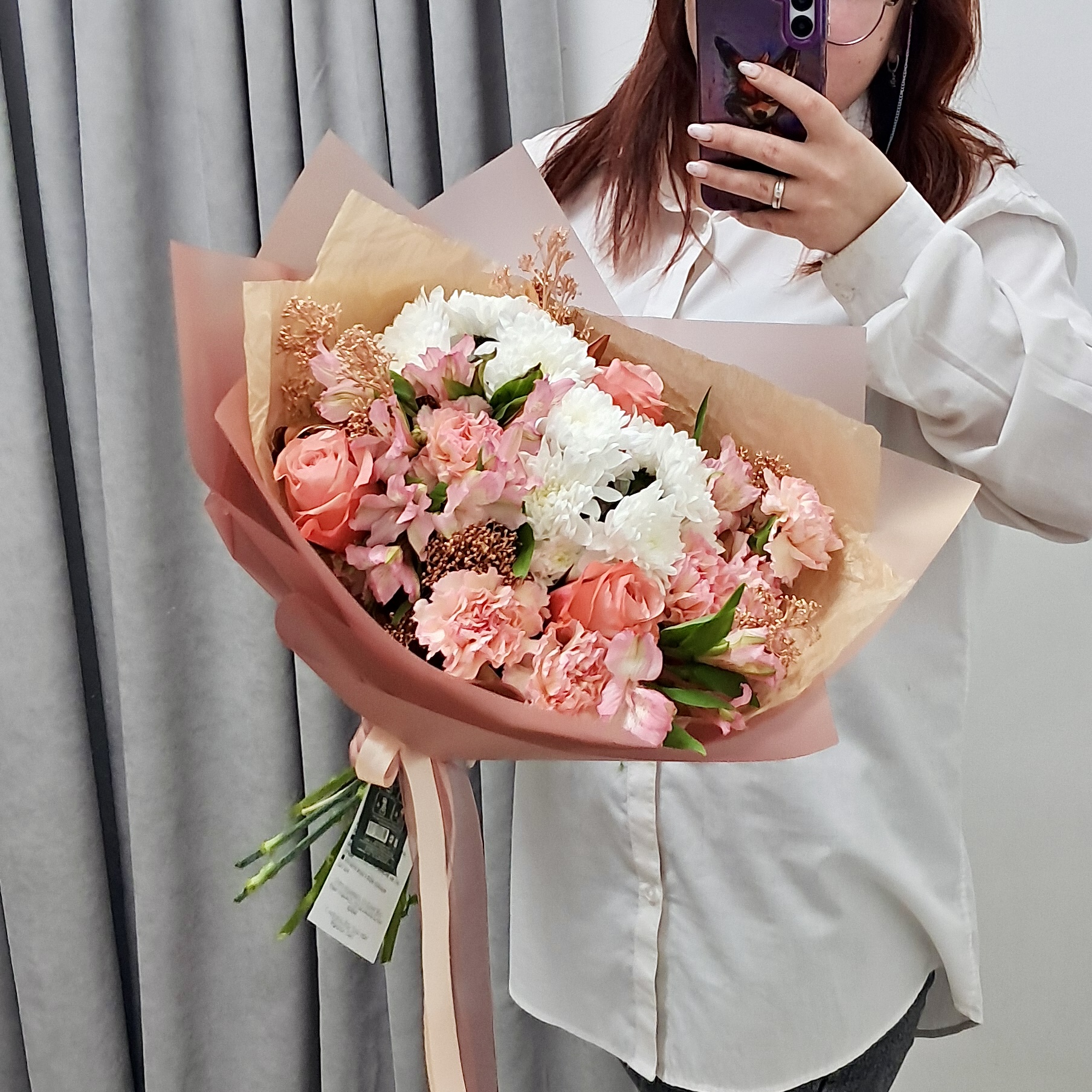 Нежные розы, солнечные ромашки и стойкие гвоздики создают душевный букет, который говорит о заботе, простых радостях и надежности.