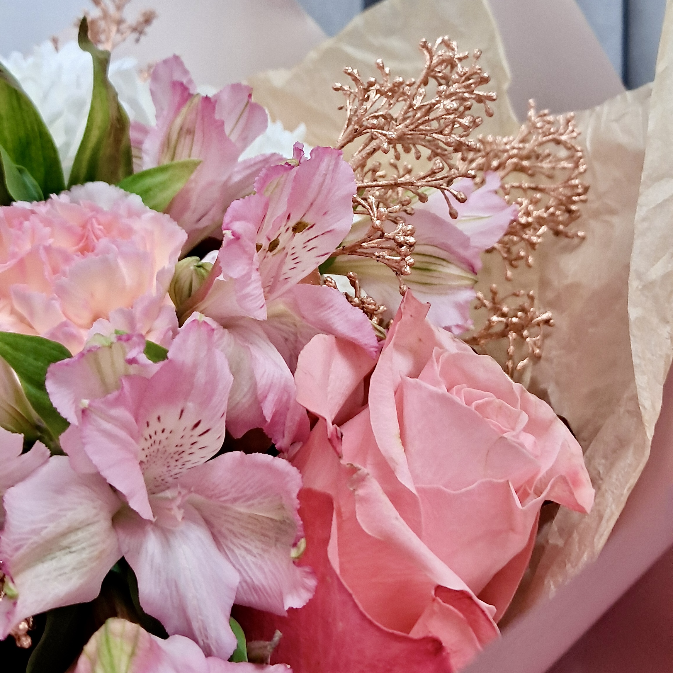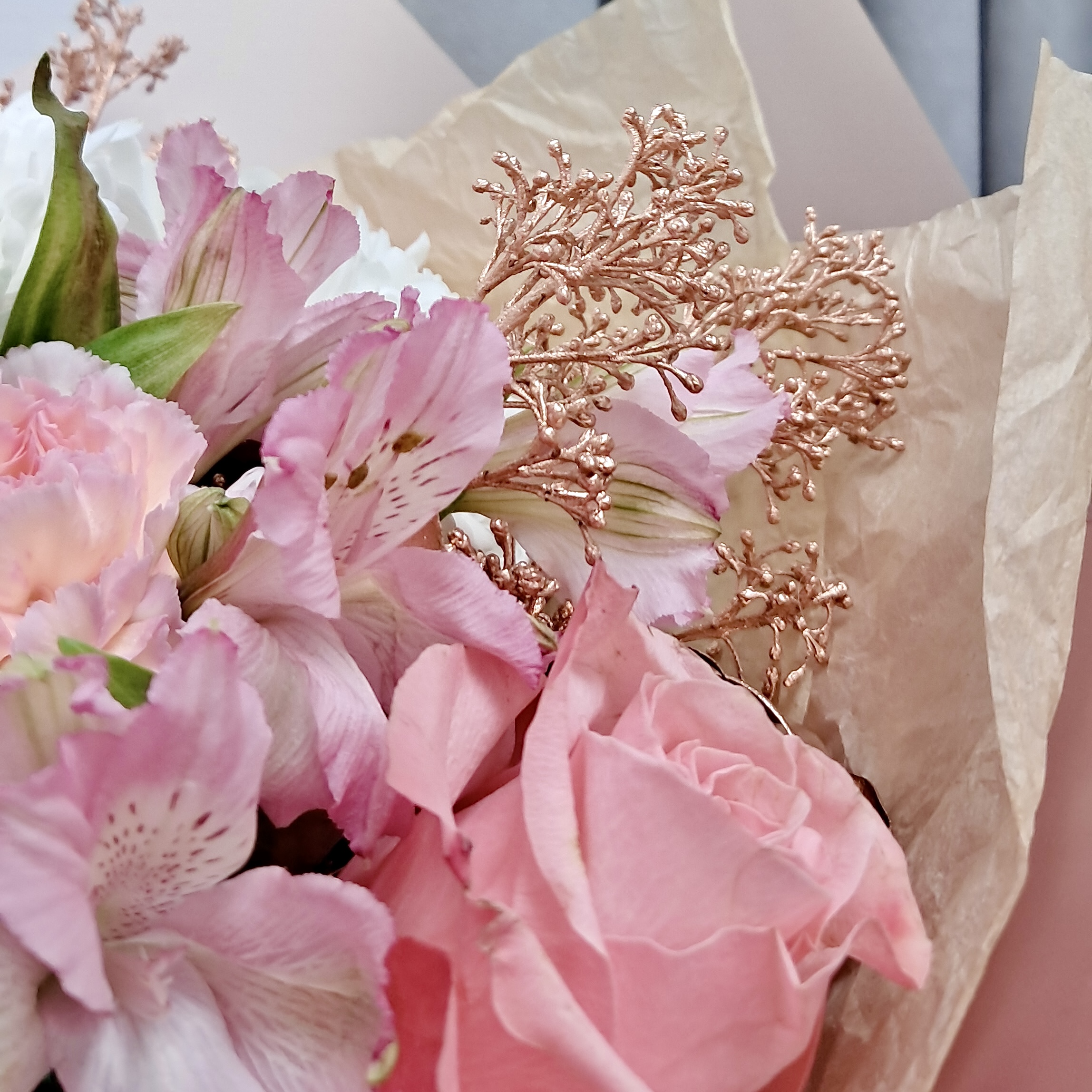 Готовый букет с розами, альстромерией и золотой скиммией | Доставка 30 минут