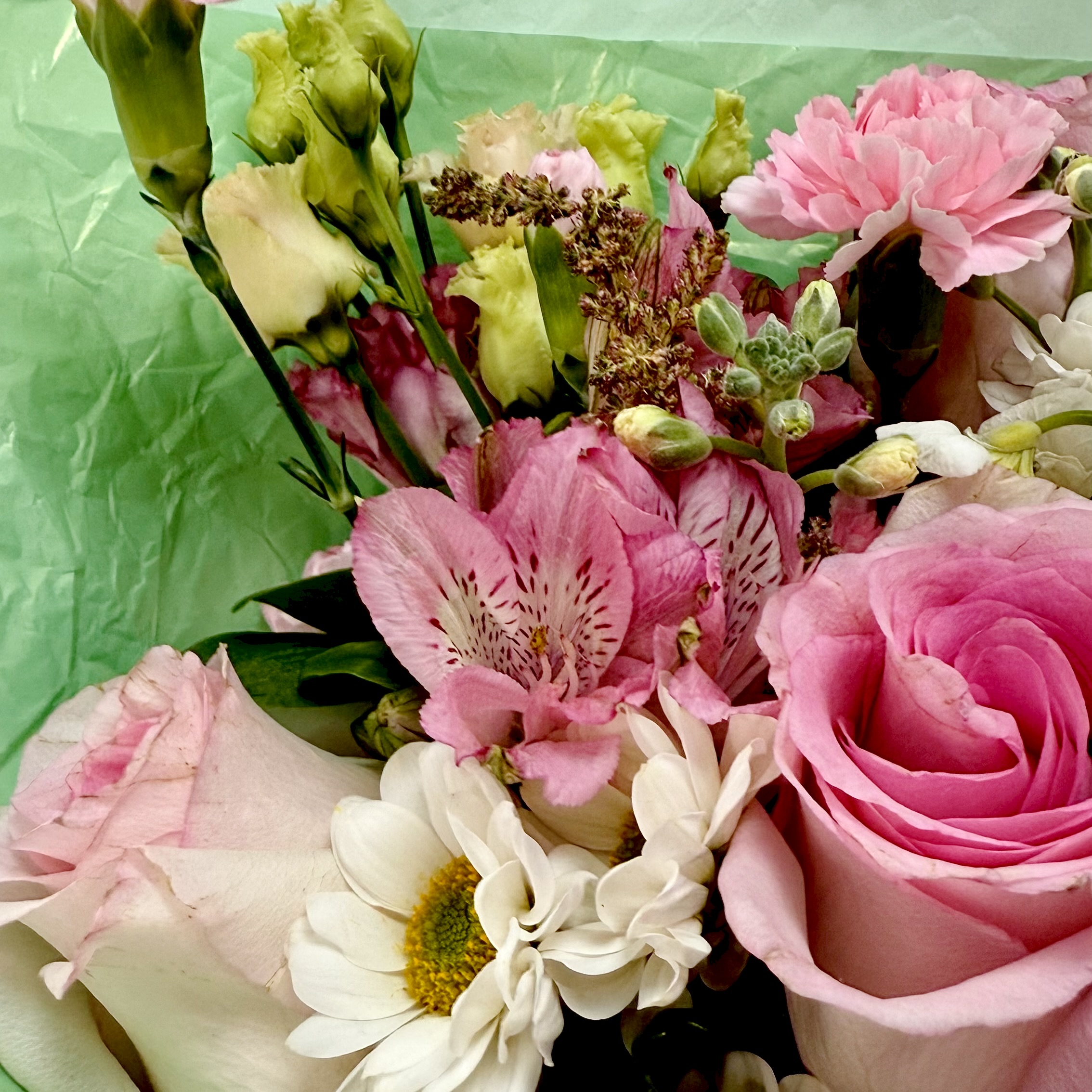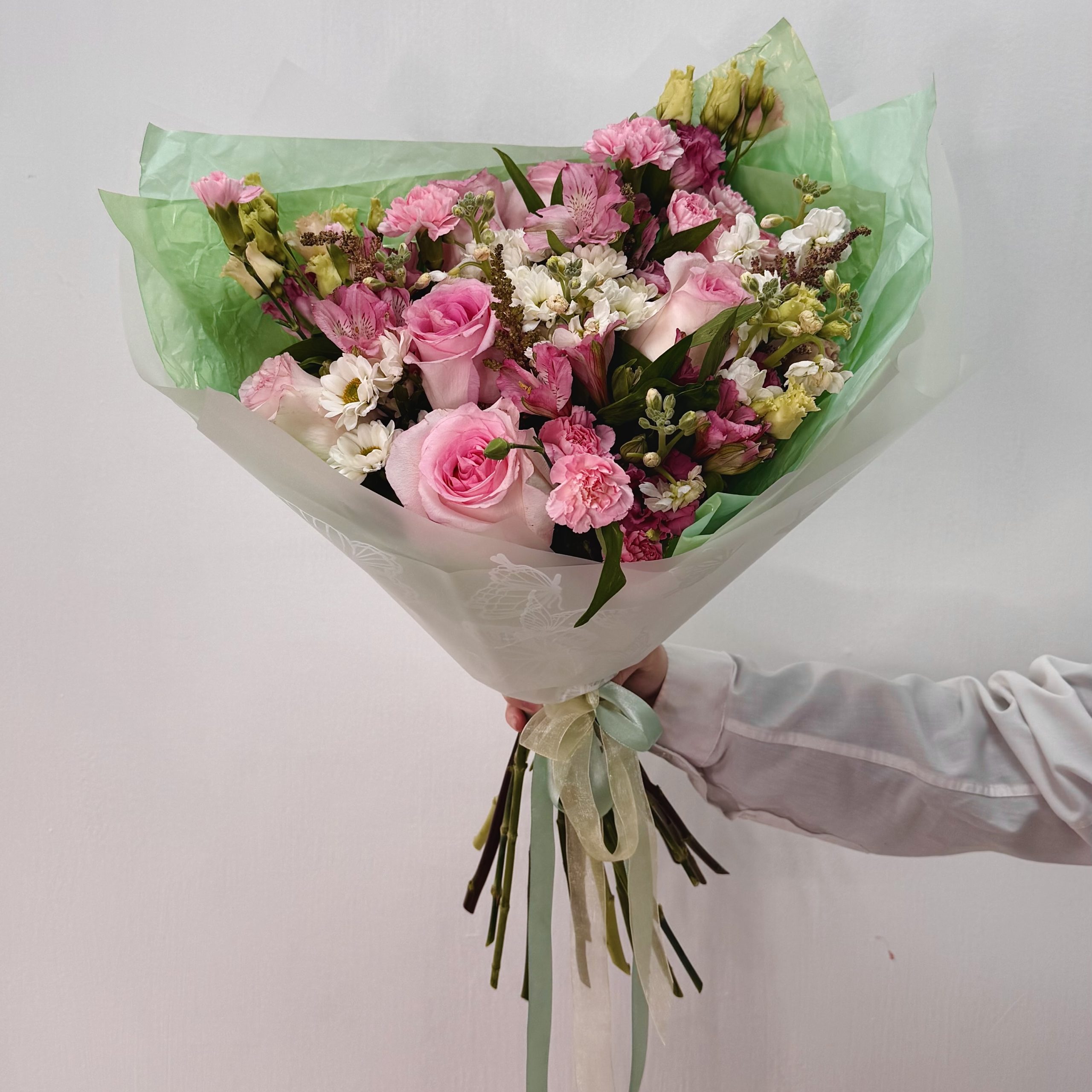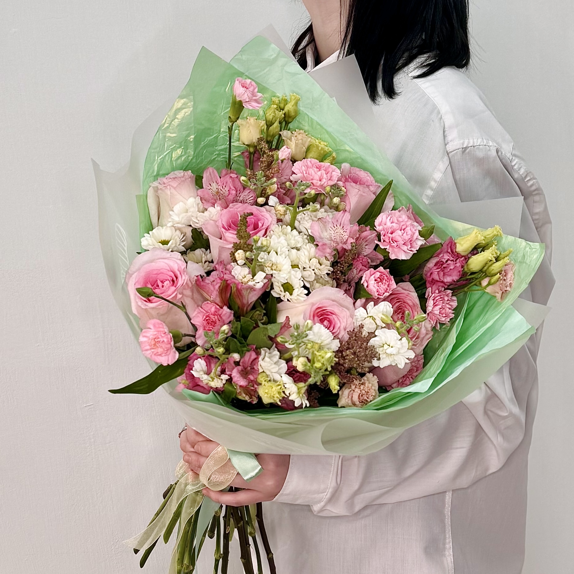 Эта готовая композиция от «Гран При» сочетает нежные розовые розы, ароматную маттиолу, стойкие гвоздики и изящную альстромерию. Букет не только выглядит невероятно элегантно, но и наполняет пространство тонким чарующим ароматом, создавая атмосферу любви и нежности.