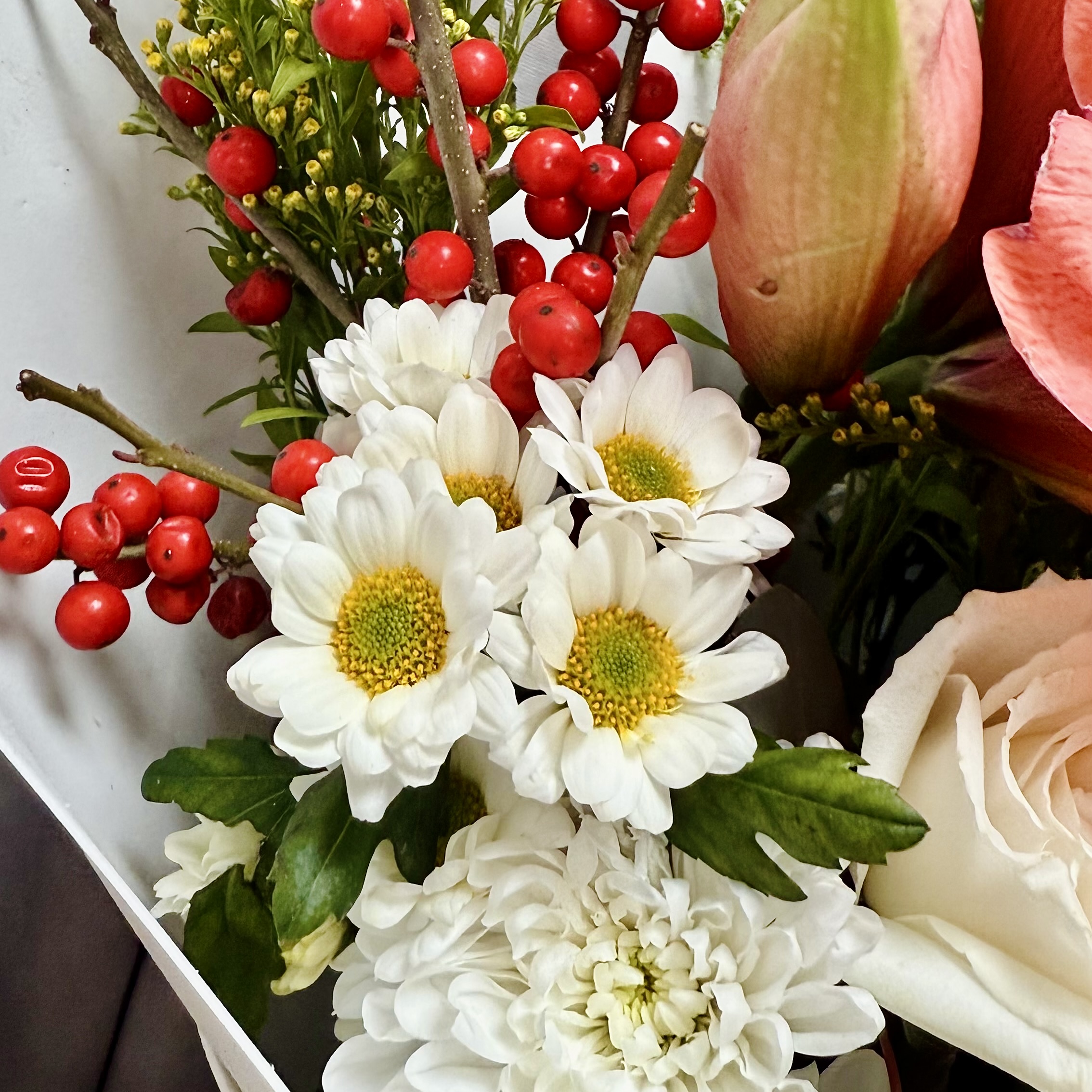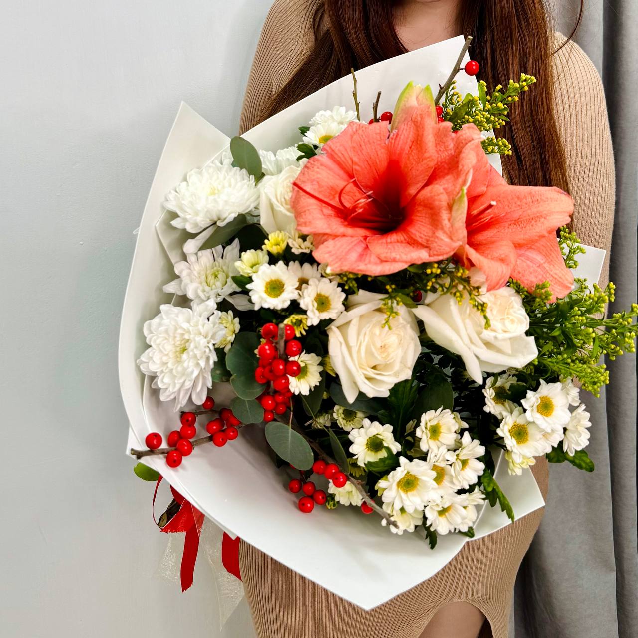 Готовый Букет с зимним амариллисом, ягодами илекс и стойкими хризантемами
