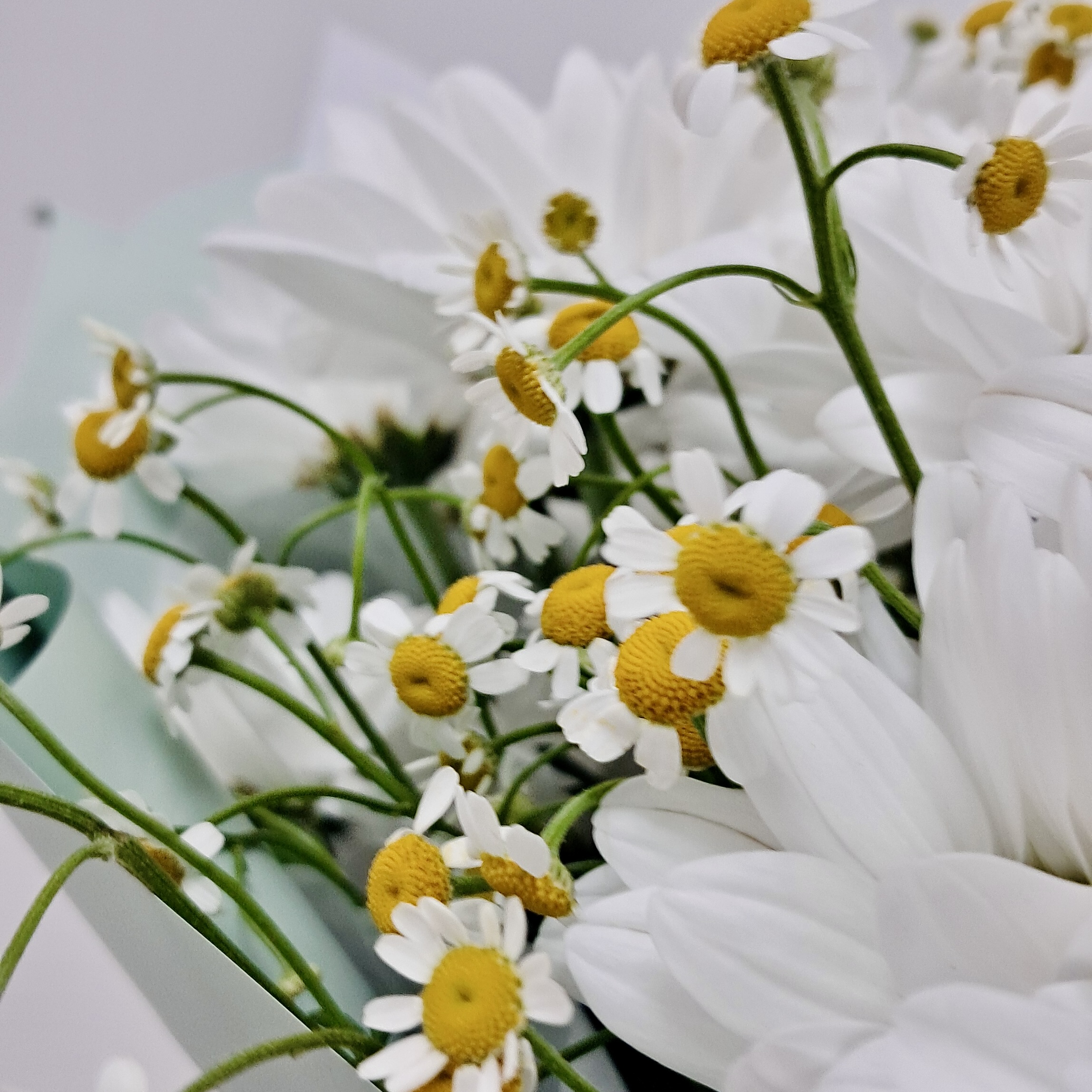 Настоящий луч солнца в изящном исполнении! Готовый букет от «Гран При» размером 30/50 см сочетает пышную кустовую хризантему и нежные соцветия ромашки. Идеально сбалансированная композиция сохраняет естественную красоту полевых цветов, дополненную благородством садовых сортов. Такой подарок наполнит любое пространство теплом и свежестью.