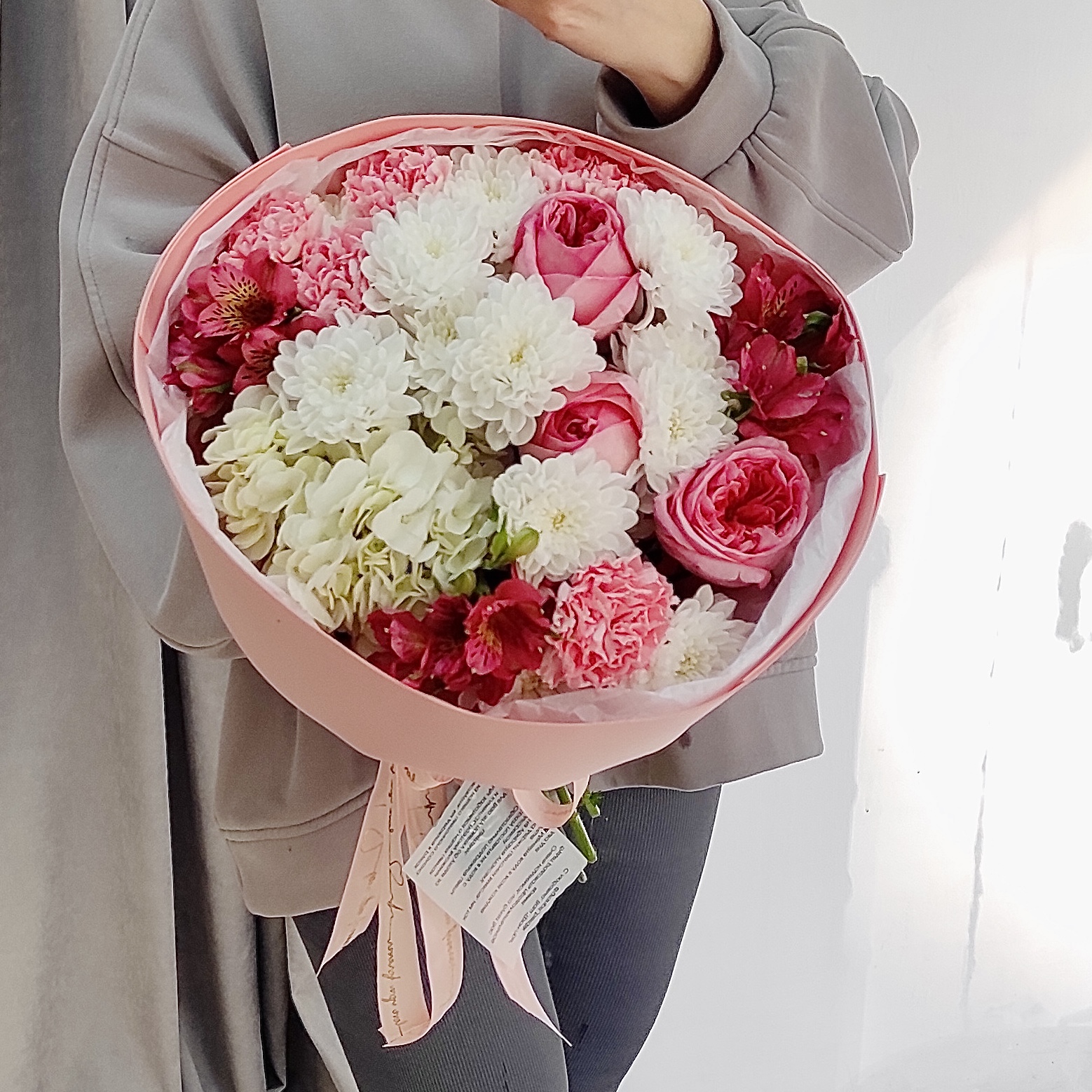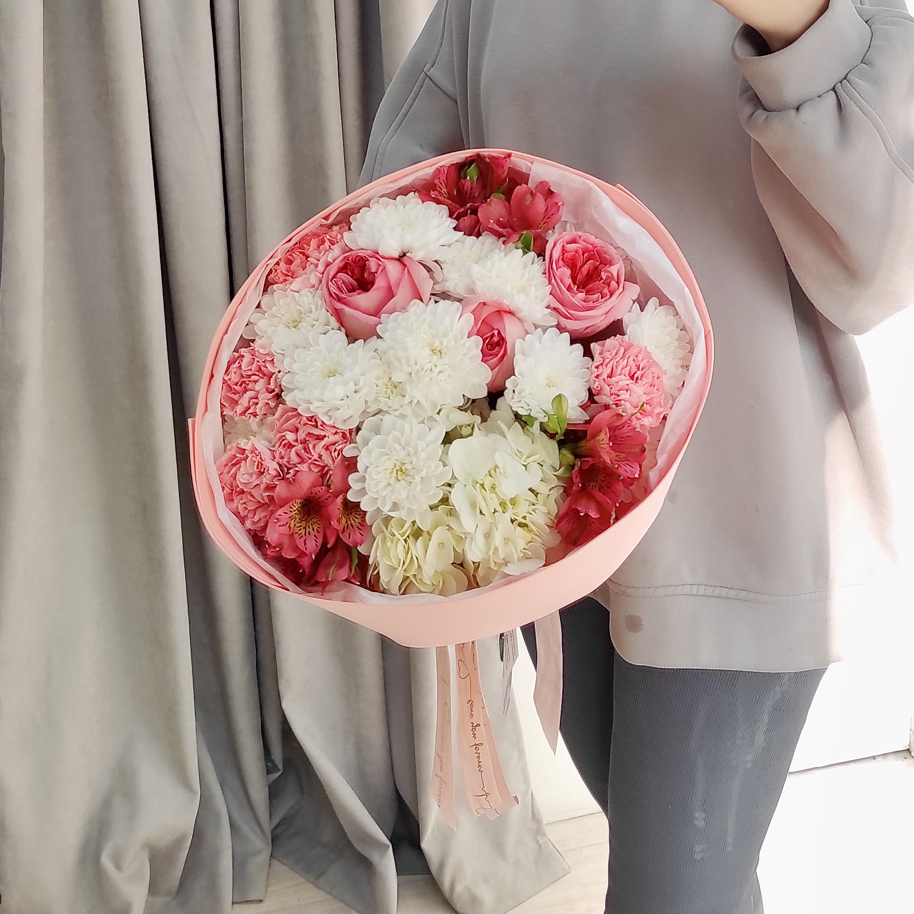 Готовый букет в круглой упаковке | Пионовидные розы, хризантема, гортензия