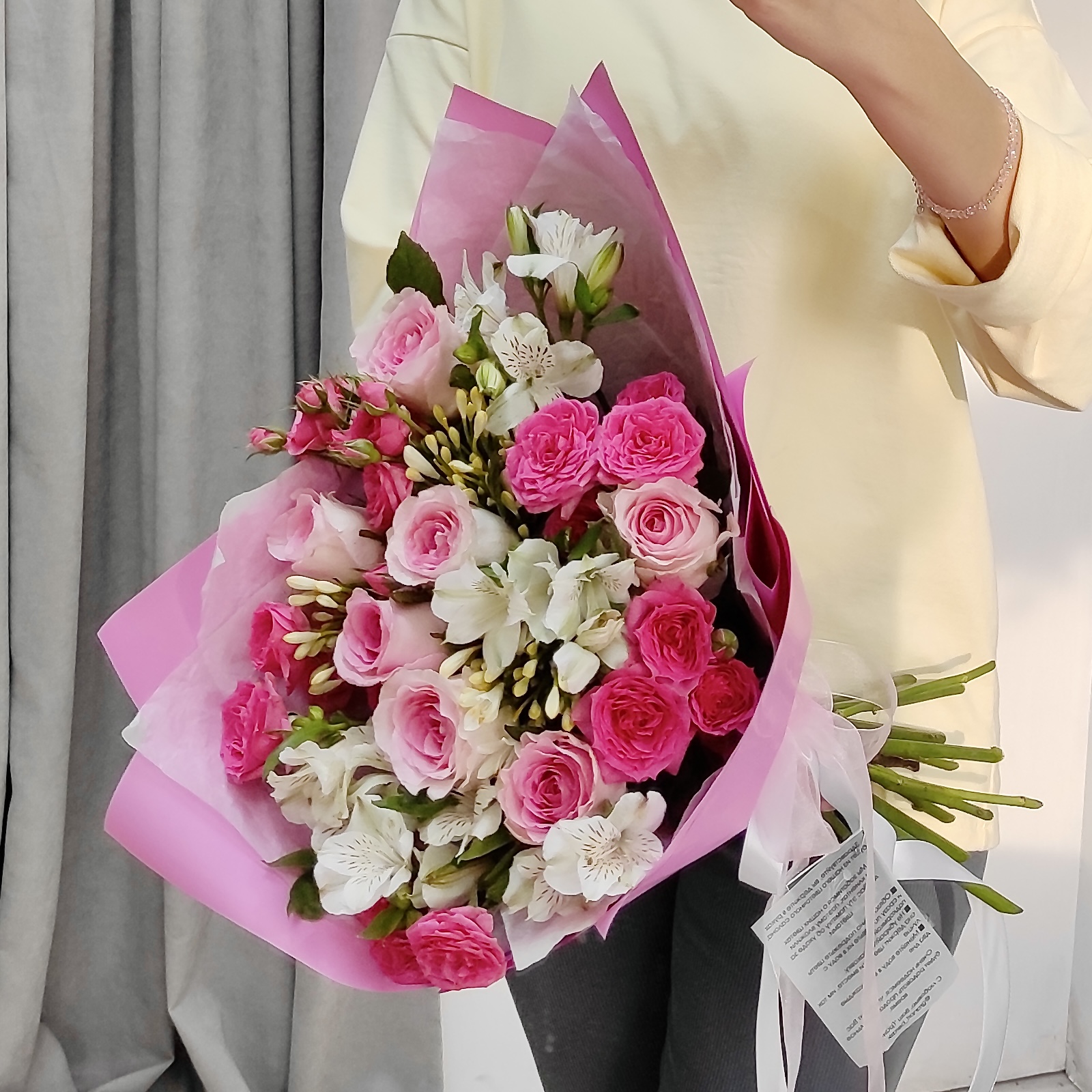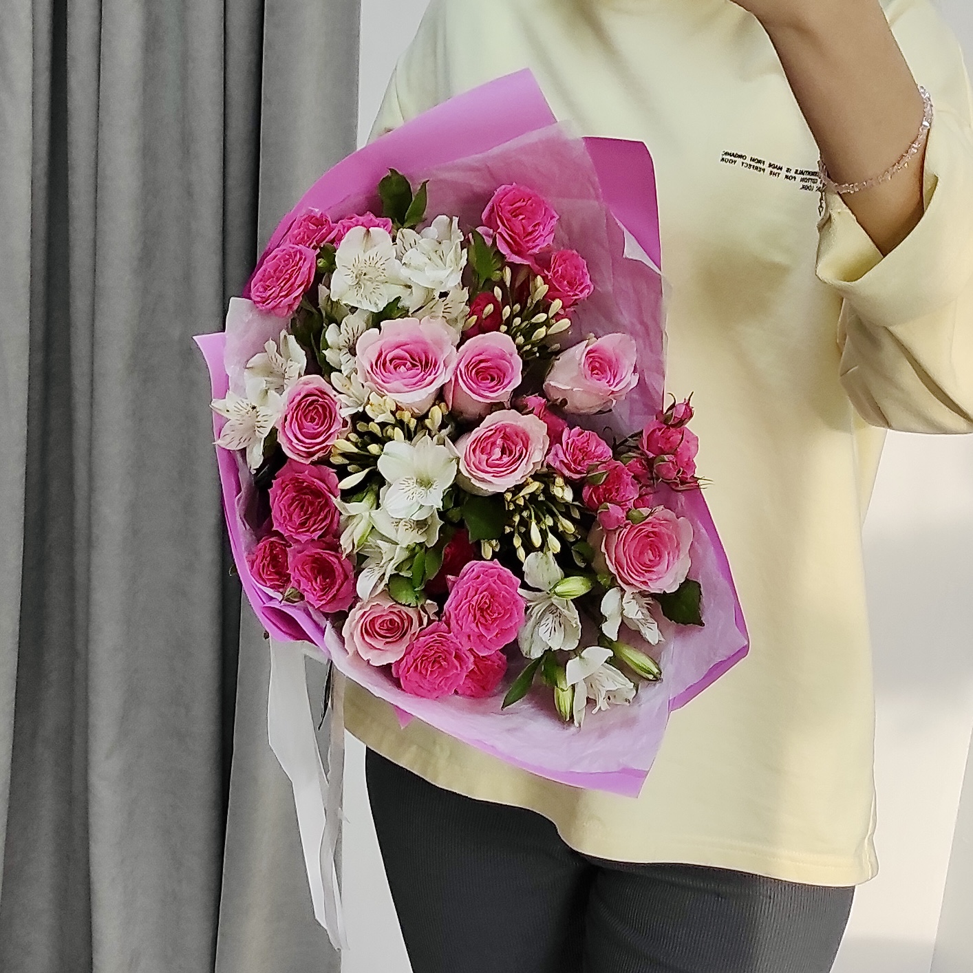 Готовый букет в малиновой гамме | Розы и альстромерия