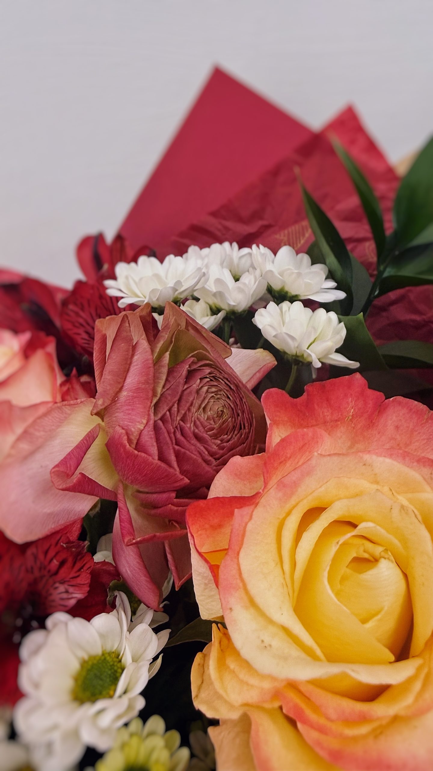 Этот эффектный букет размером 50/50 см создан для тех, кто хочет подарить яркие эмоции и незабываемое настроение. В его основе — благородные рыжие розы с глубоким, насыщенным оттенком, трогательные ранункулюсы, напоминающие маленькие пионы, жизнерадостная солнечная ромашка и изящная хризантема сантини, которая добавляет композиции лёгкости и объёма.