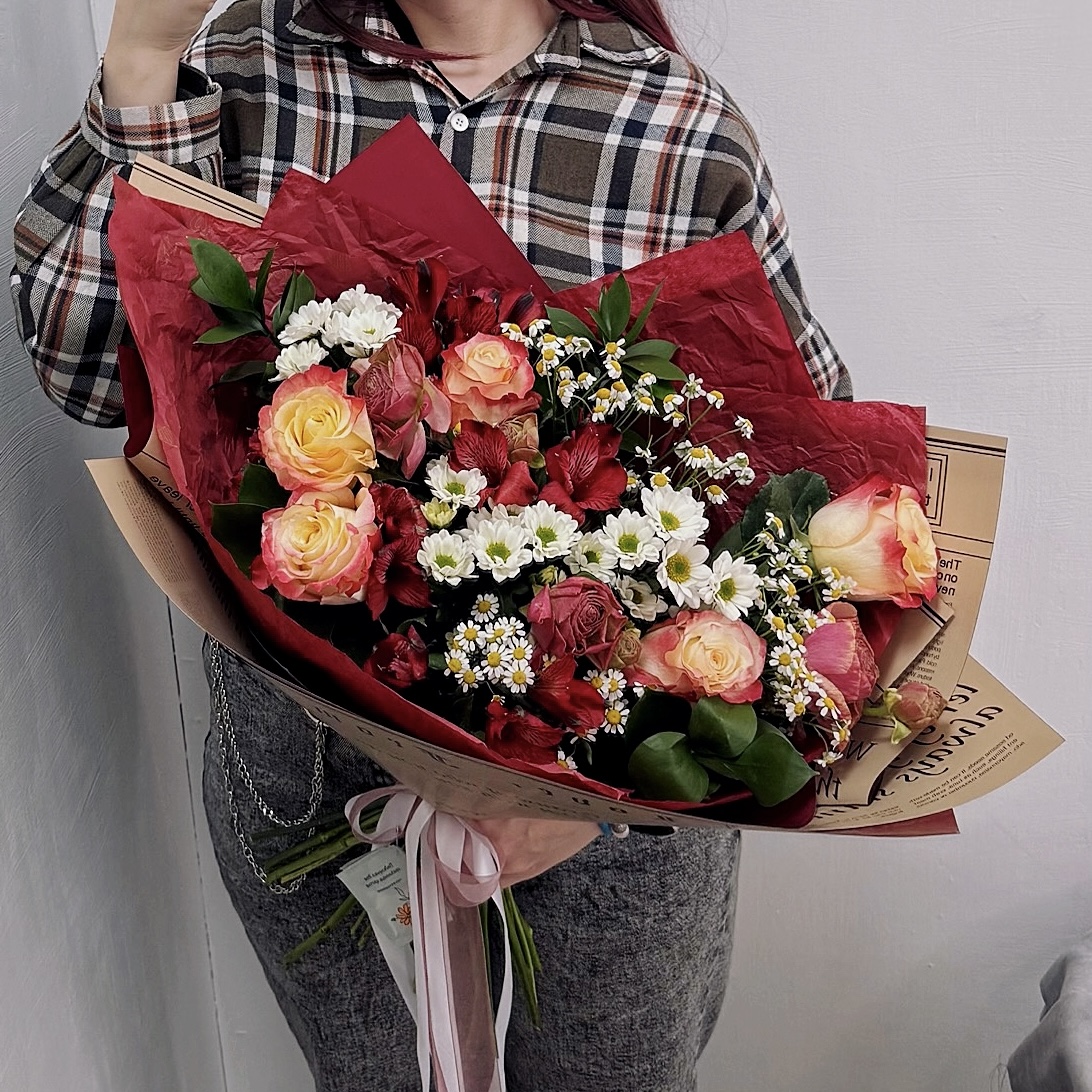 Вместе они создают по-настоящему стильный, трендовый микс, который не останется незамеченным. букет идеально сбалансированным — он одинаково эффектно смотрится и в руках, и в вазе. Это идеальный выбор для дня рождения, юбилея или просто яркого признания в чувствах без повода.