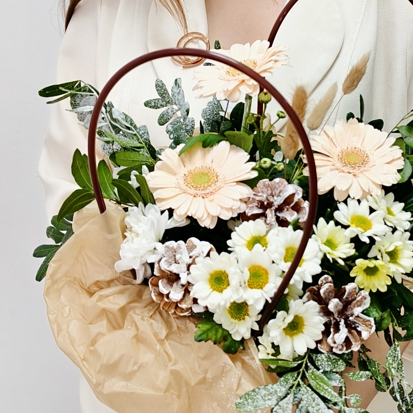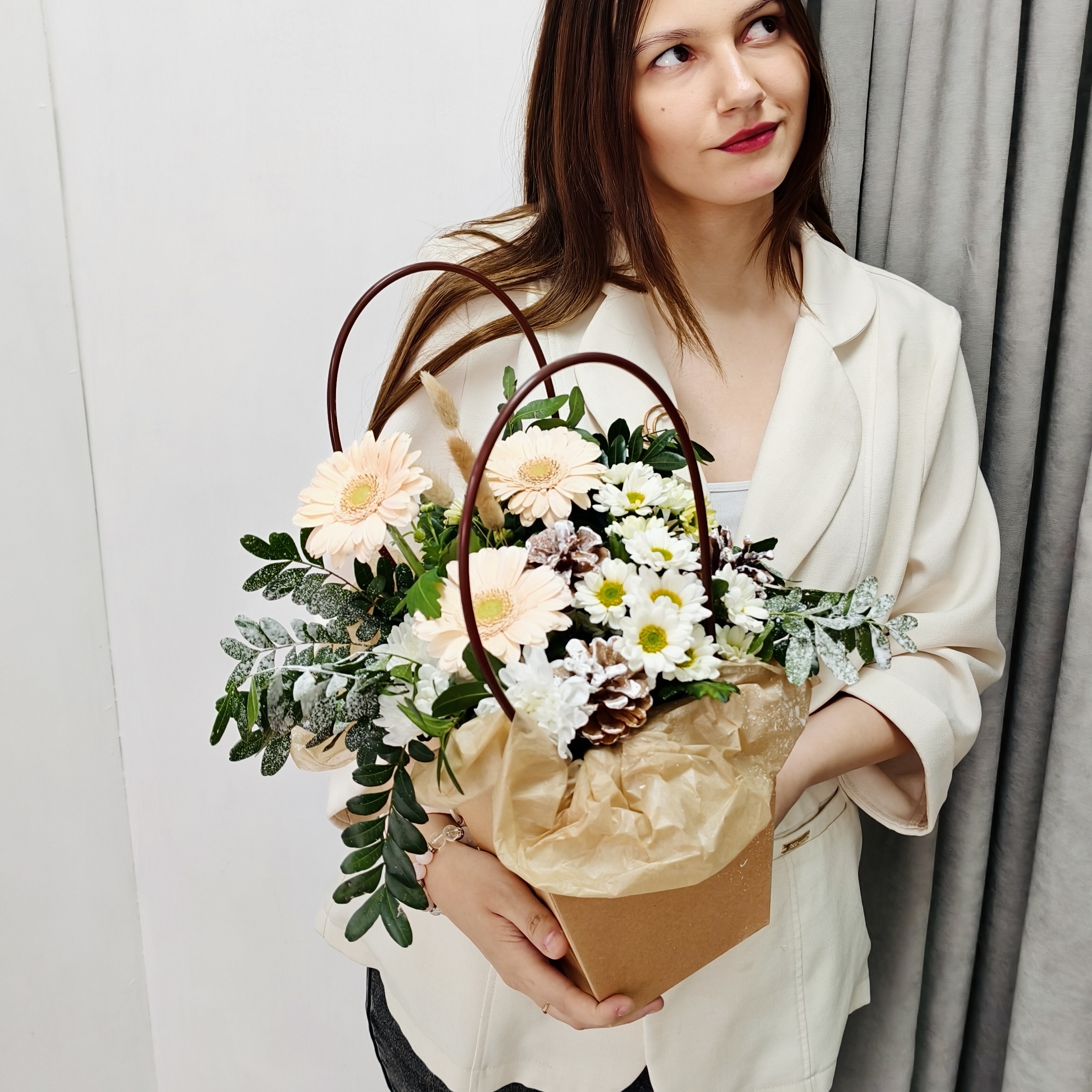 Эта нежная композиция объединяет задорные мини герберы и нежную хризантему сантини. Компактная и жизнерадостная композиция, которая подарит заряд позитива, идеально подходит для маленьких радостей и моментов счастья.