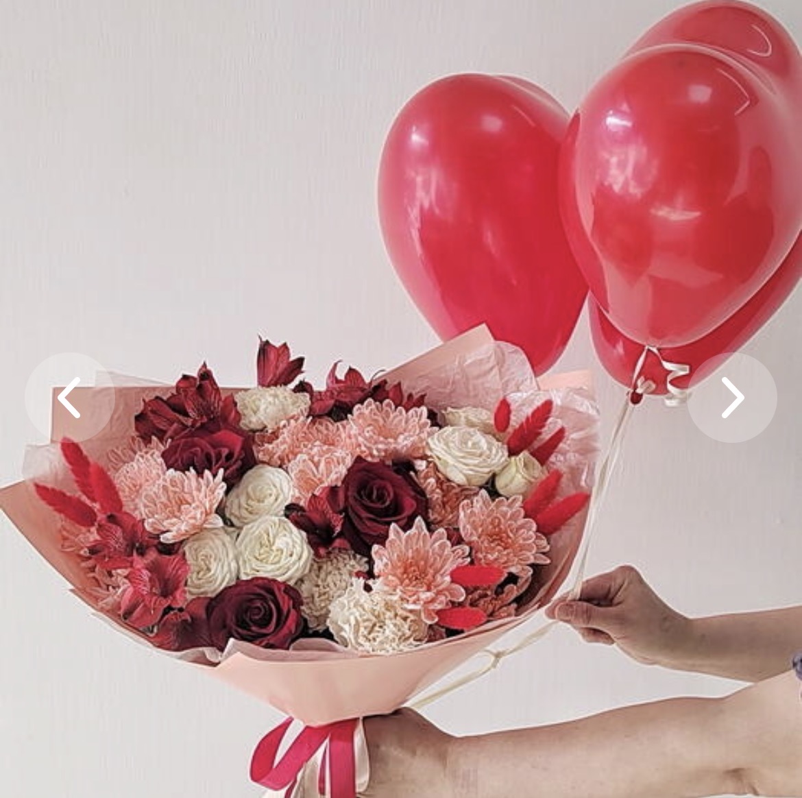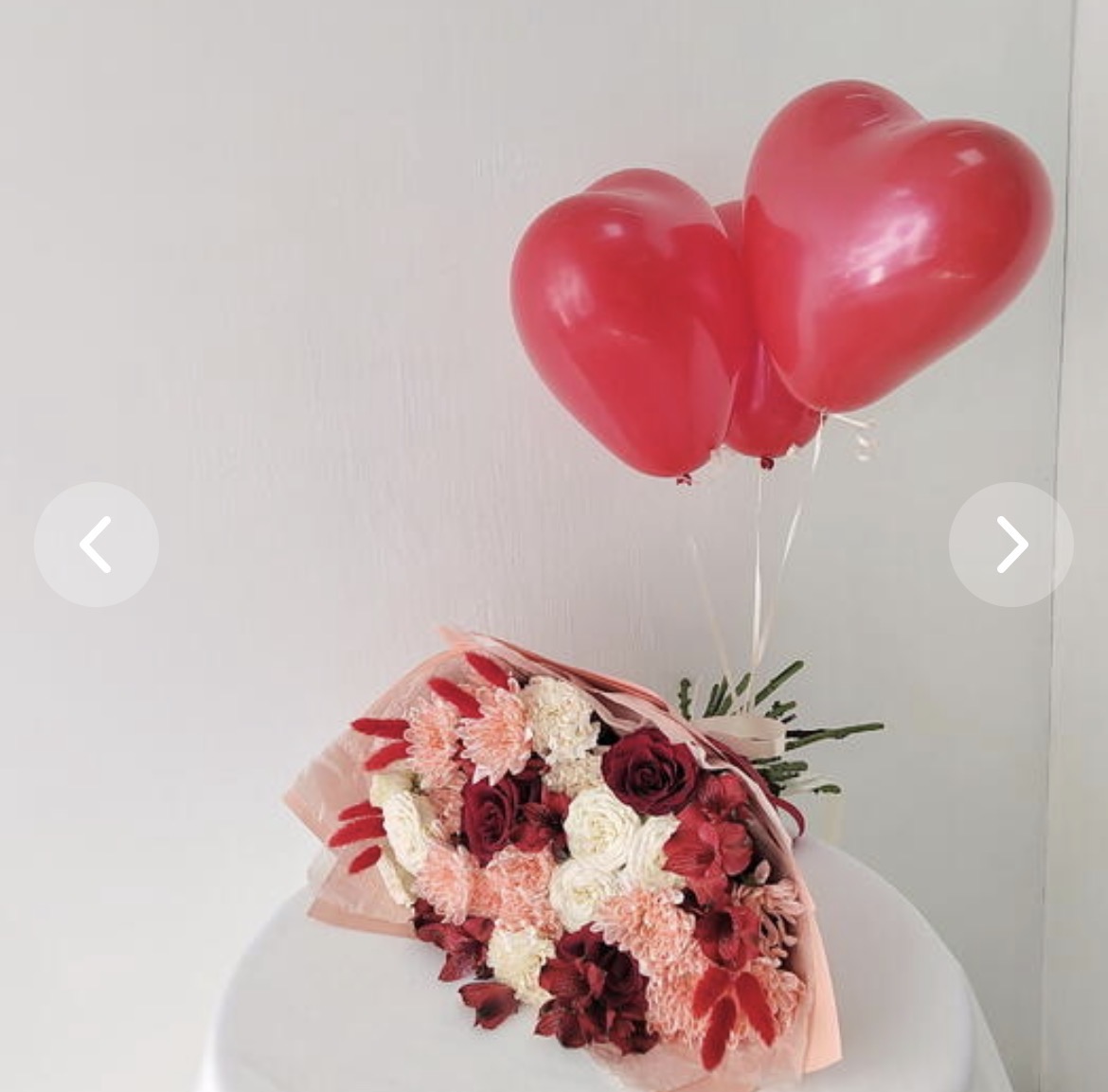 И главный сюрприз — три алых воздушных сердца. Они парят над цветами, создавая праздничное, волшебное настроение и делая подарок по-настоящему запоминающимся