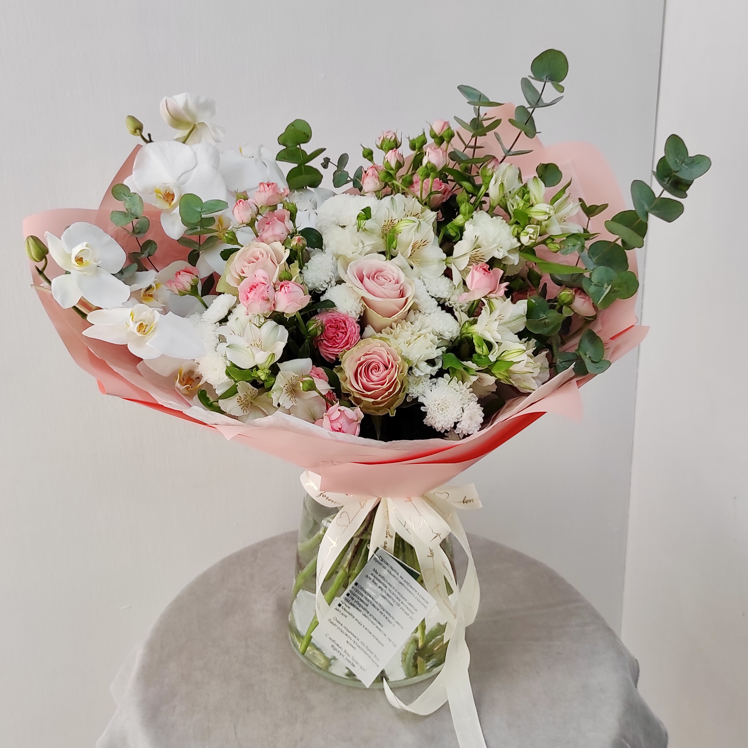 Этот готовый премиум букет от «Гран При» объединяет утонченную орхидею фаленопсис, пышные пионовидные розы, ароматный эвкалипт и нежные гвоздики. Каждый элемент композиции подчеркивает статусность и элегантность, создавая впечатление безупречного вкуса. Такой подарок говорит о внимании к деталям и идеален для самых значимых событий.