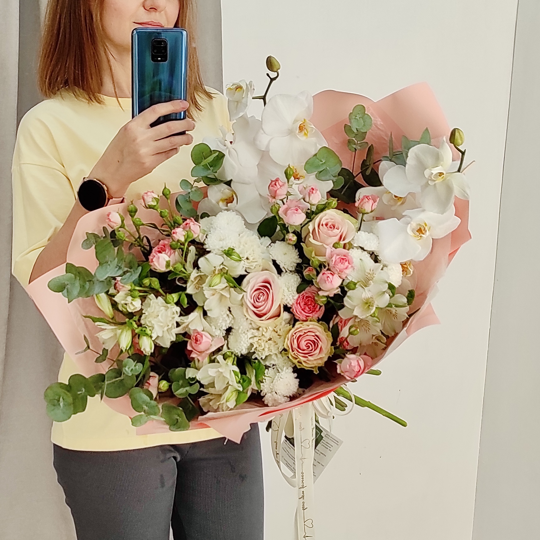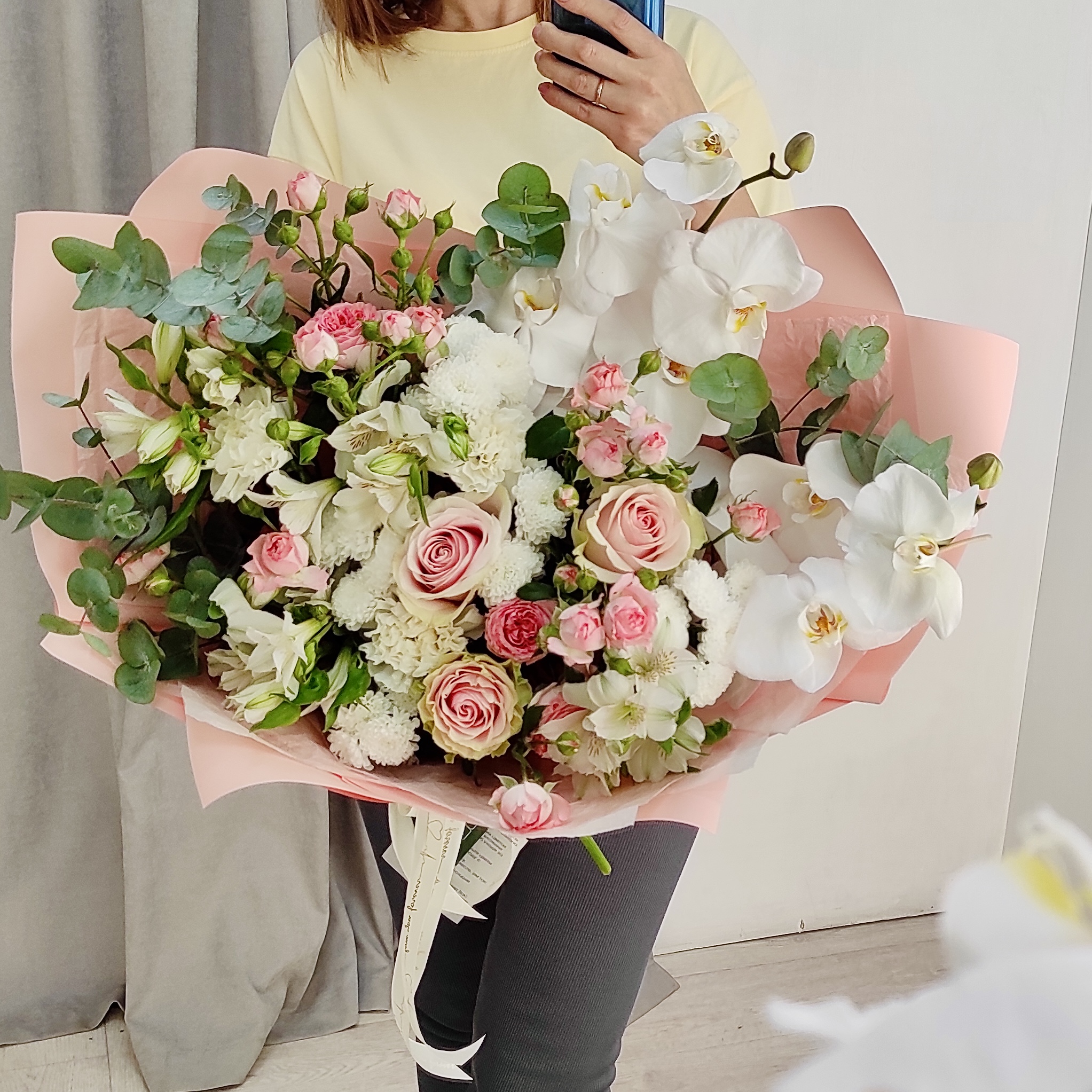 Готовый премиум букет с орхидеей фаленопсис | Пионовидные розы и эвкалипт