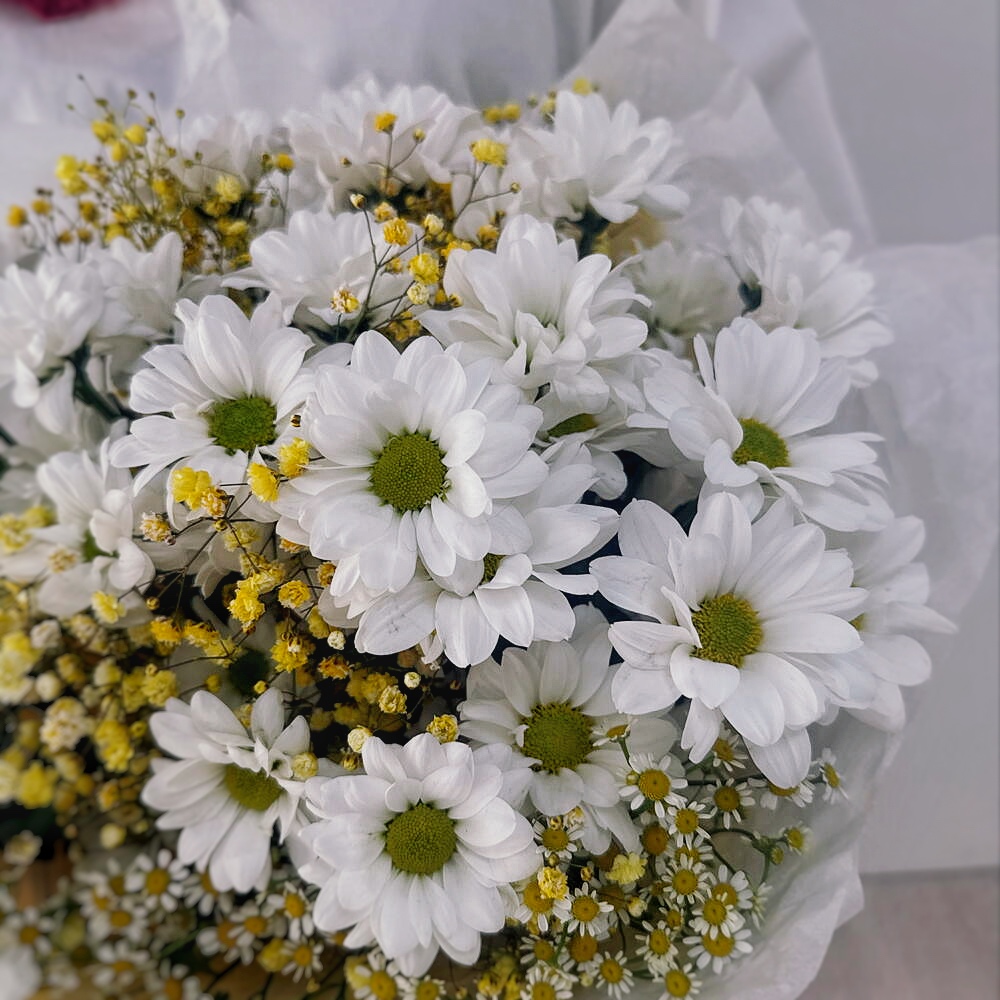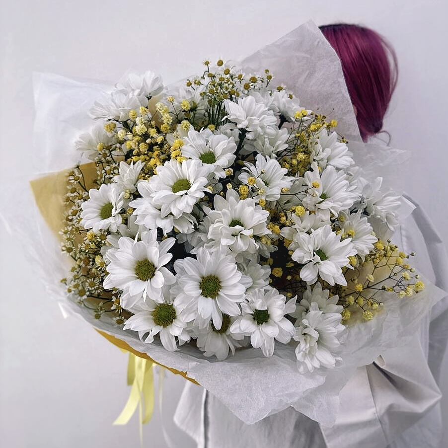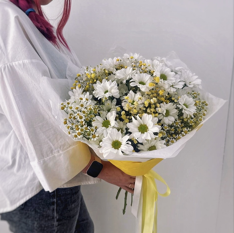 Готовый солнечный букет с кустовой хризантемой ромашкой и гипсофилой. Этот готовый букет (размер 40/45 см) — настоящий праздничный акцент, который не останется незамеченным. Внушительный объём и продуманный состав делают его идеальным выбором для особенного подарка. В букете гармонично переплелись нежная кустовая хризантема, изящная ромашка (матрикария) и стойкая гипсофила. Все цветы подобраны не только за красоту, но и за долговечность — букет будет радовать получателя особенно долго.