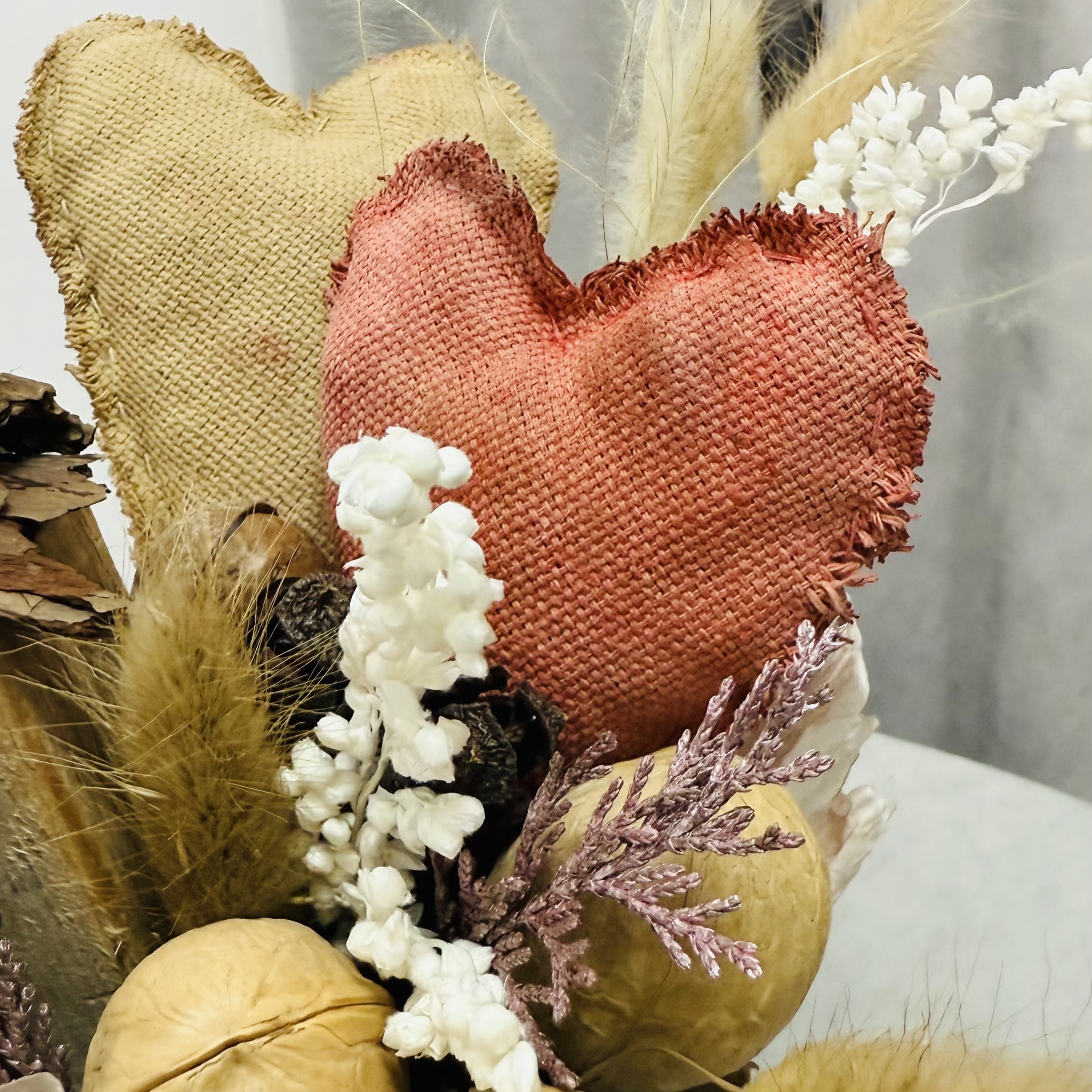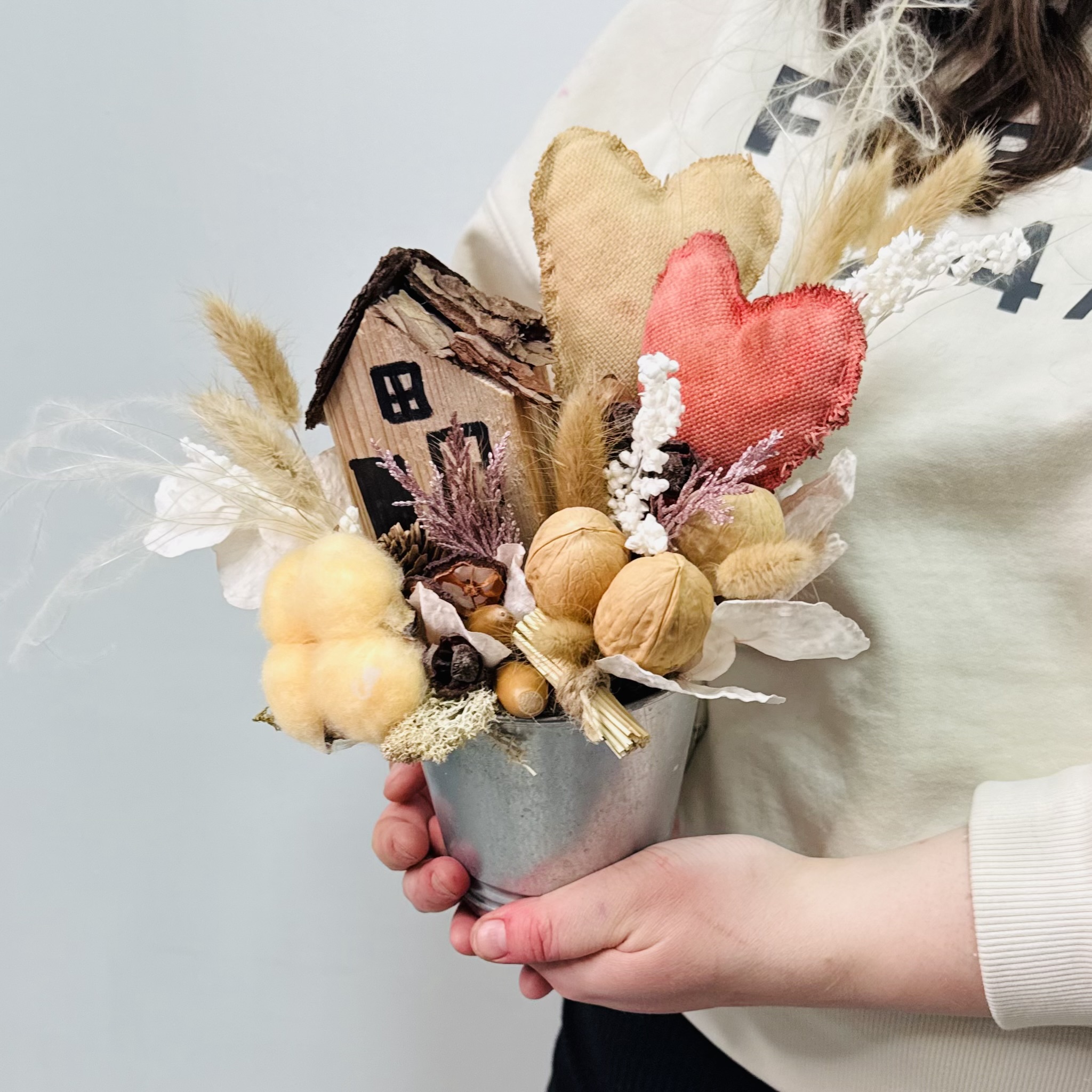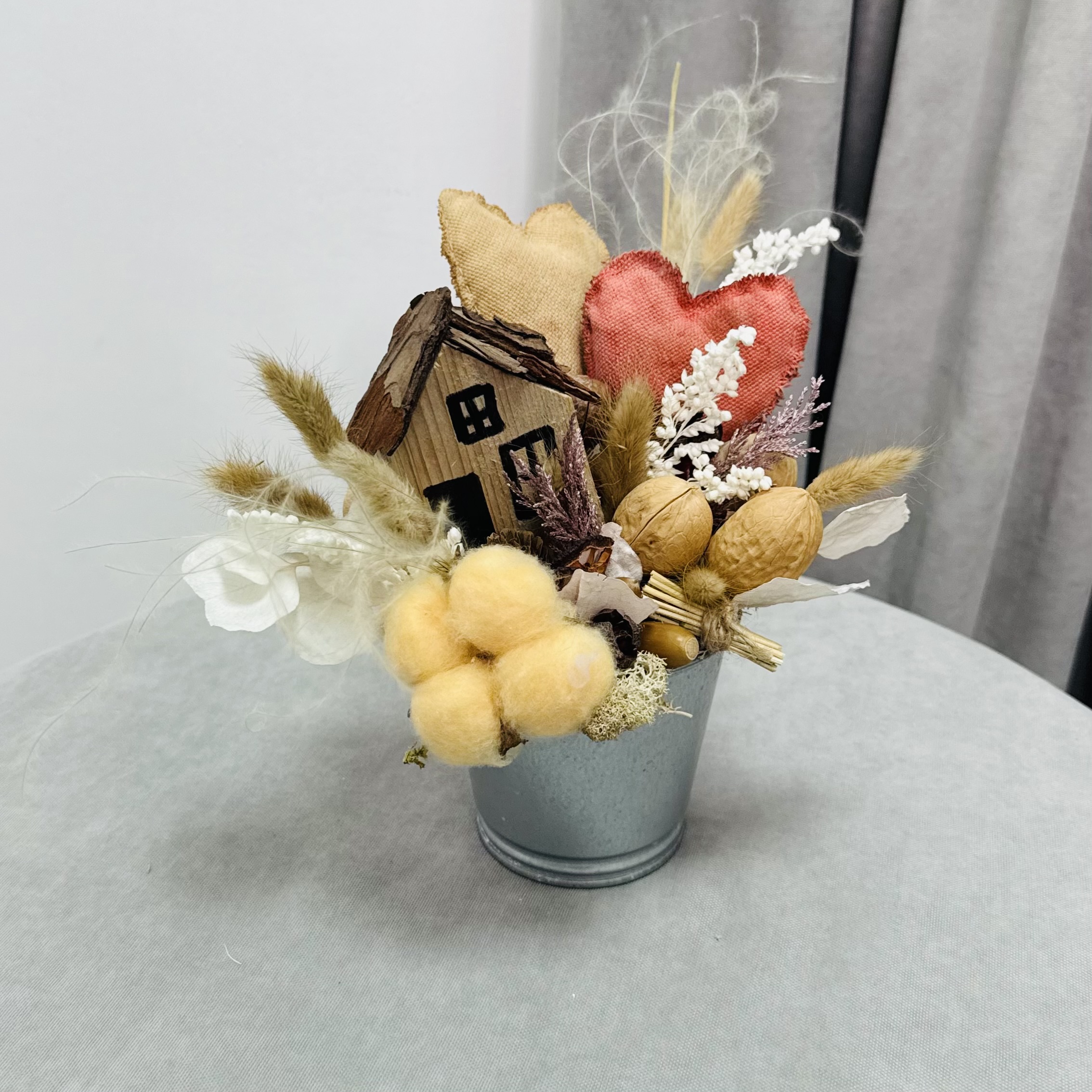 Вечный букет для вашего дома. Композиция из сухоцветов, миниатюрного домика и текстильных сердец в металлическом кашпо (30/30 см). Готовая деталь декора, которая несёт тепло и рассказывает свою историю. Не требует ухода. Идеальный символичный подарок для создания атмосферы любви и уюта.