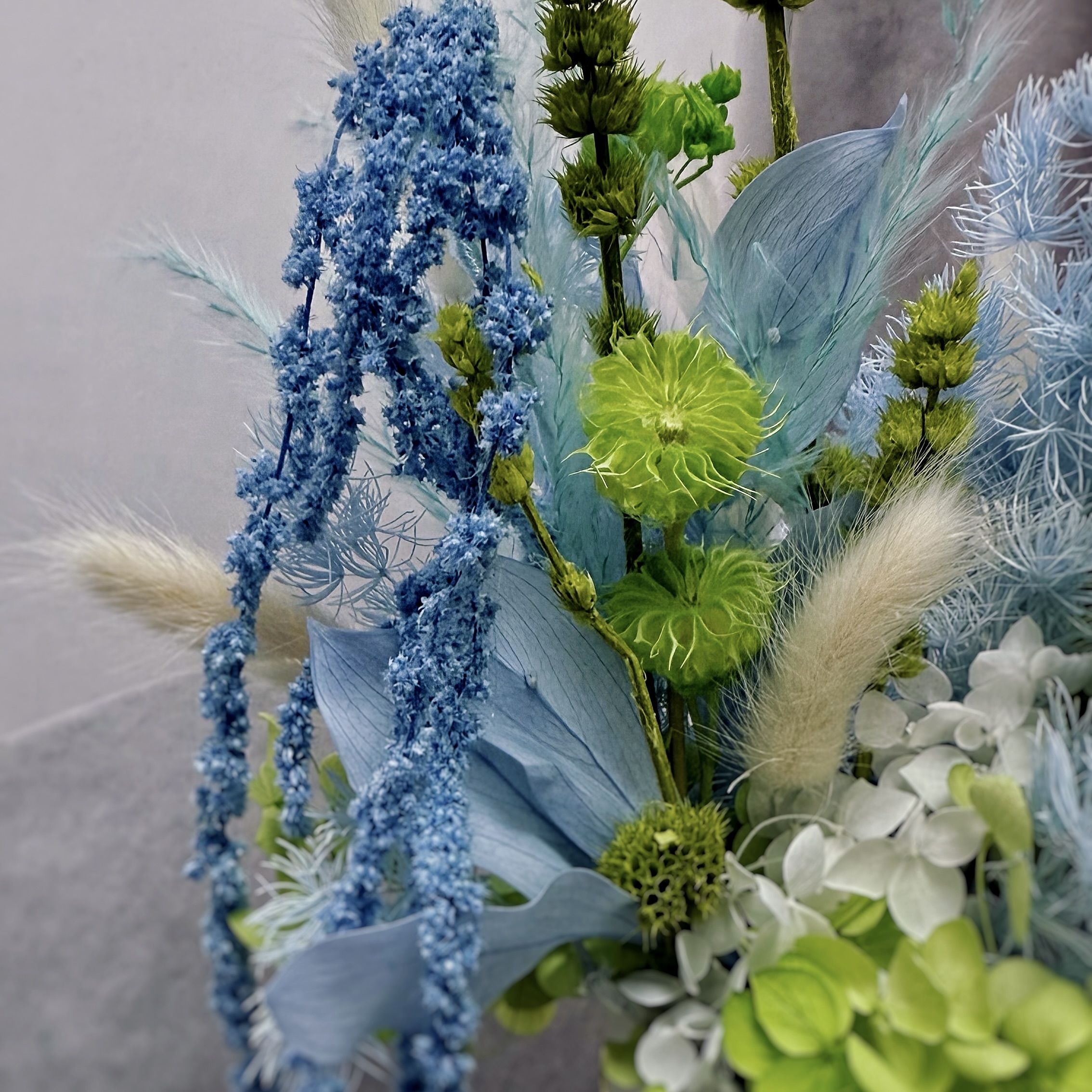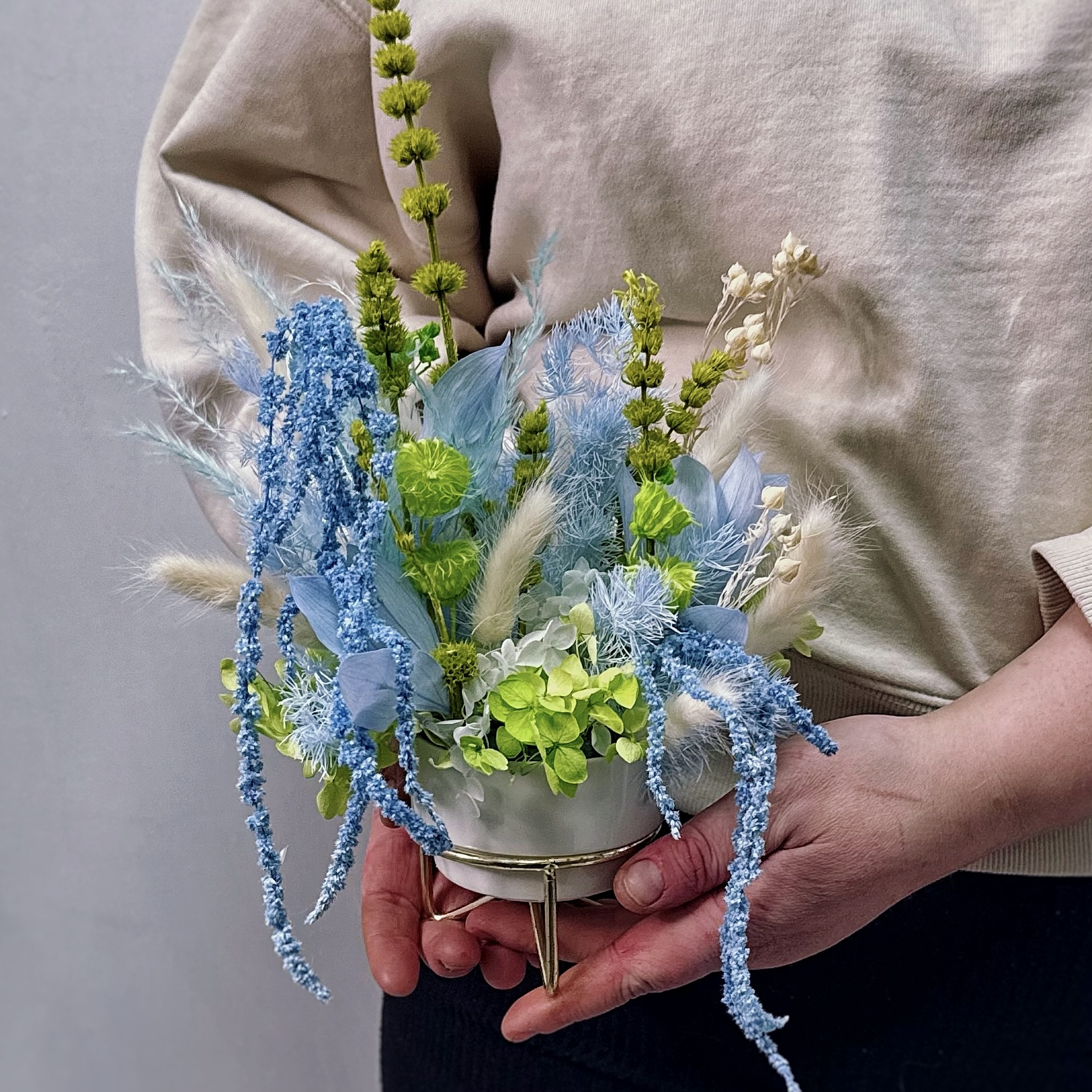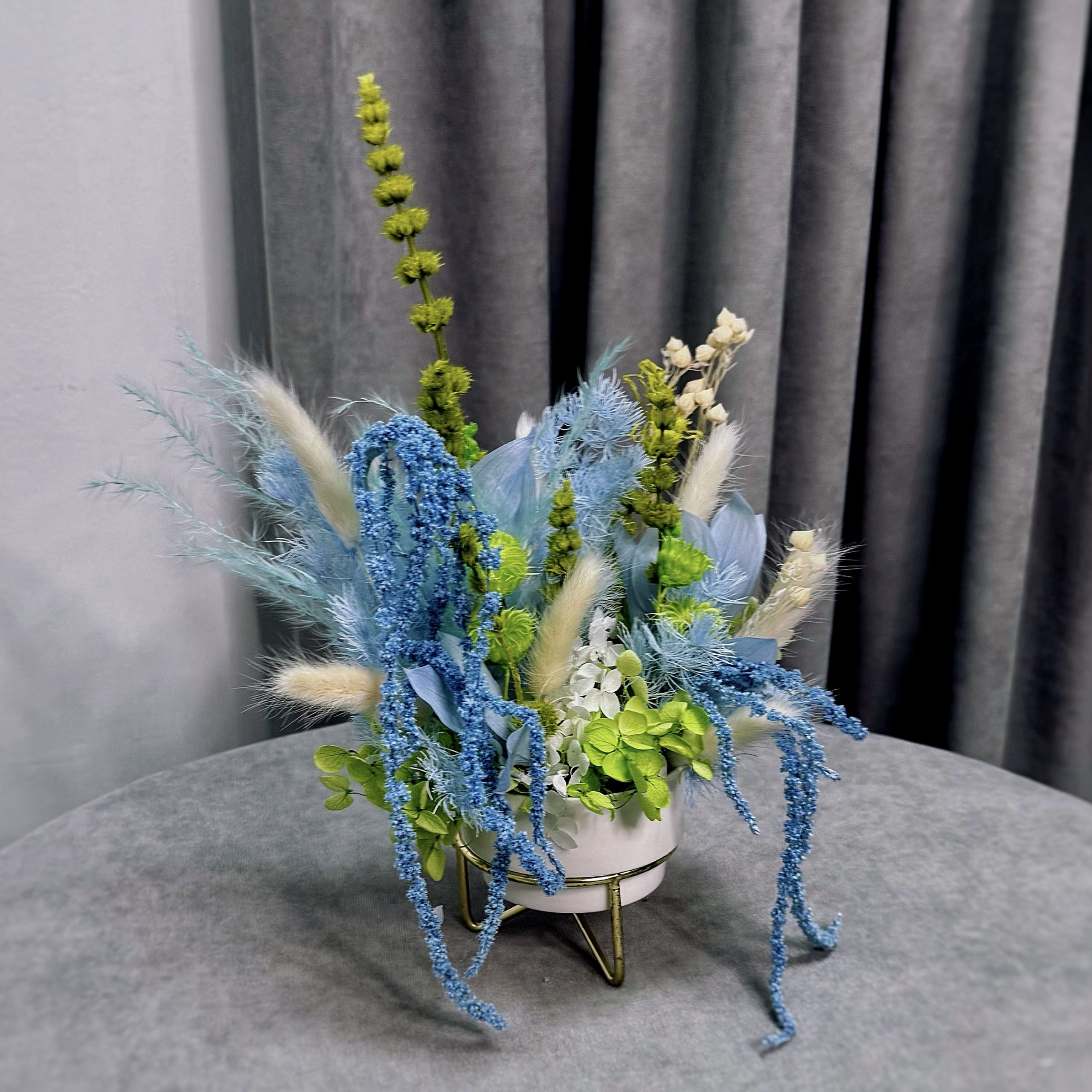 Изысканная премиальная композиция в керамическом кашпо, создающая атмосферу утонченности и спокойствия. Центр притяжения — пышная стабилизированная гортензия нежного голубого оттенка, символ искренности и изящества. Её дополняют изящные ниспадающие ветви амаранта (щирица) и воздушные метёлки лагуруса, добавляющие объем и природную динамику. Благодаря технологии стабилизации, растения сохраняют безупречный вид, эластичность и цвет годами, не требуя воды и света.