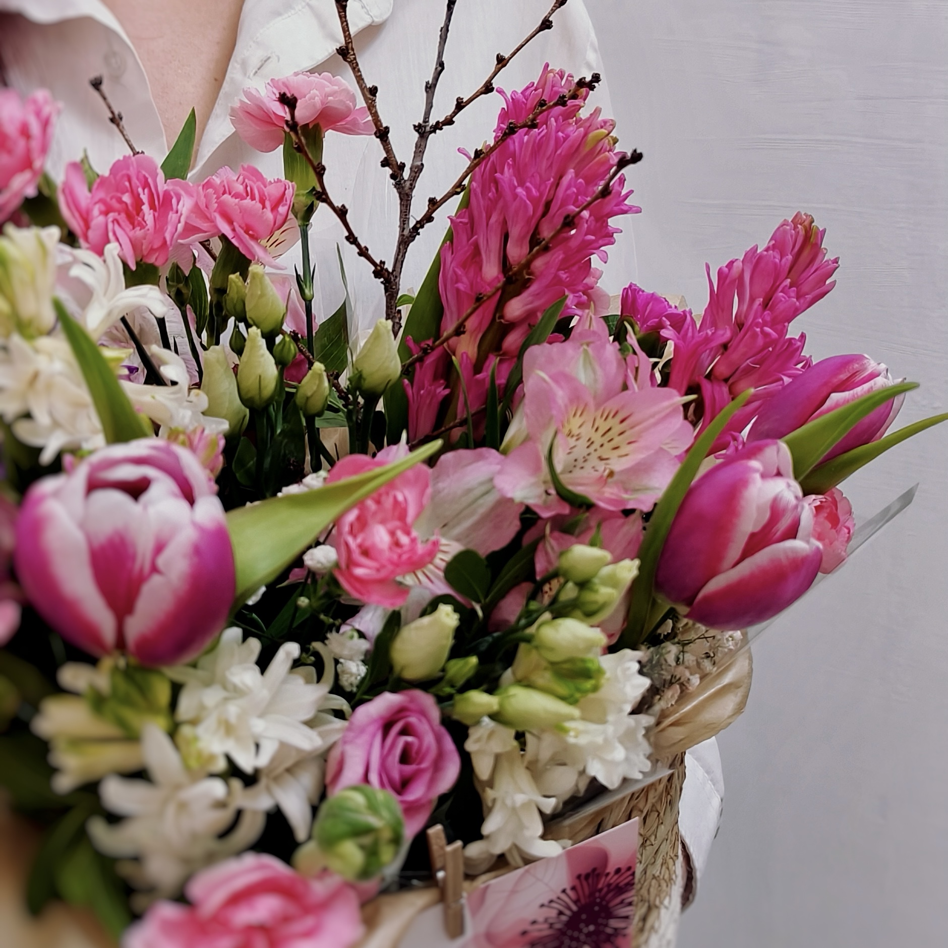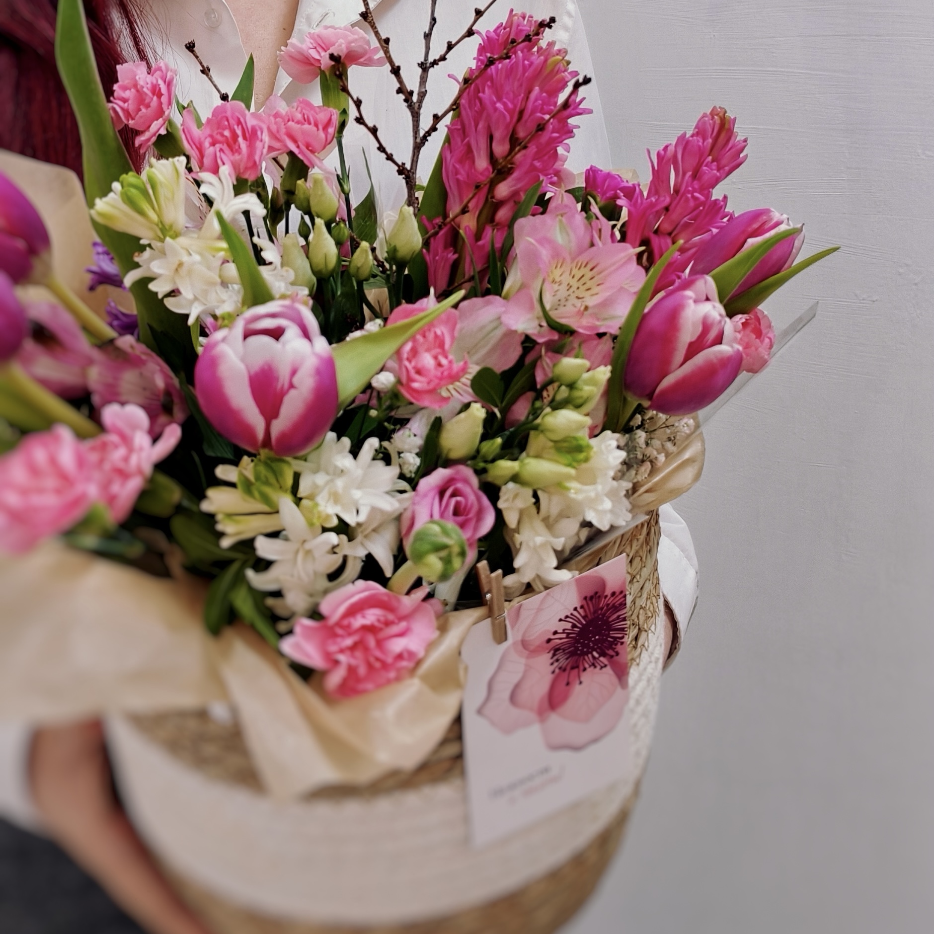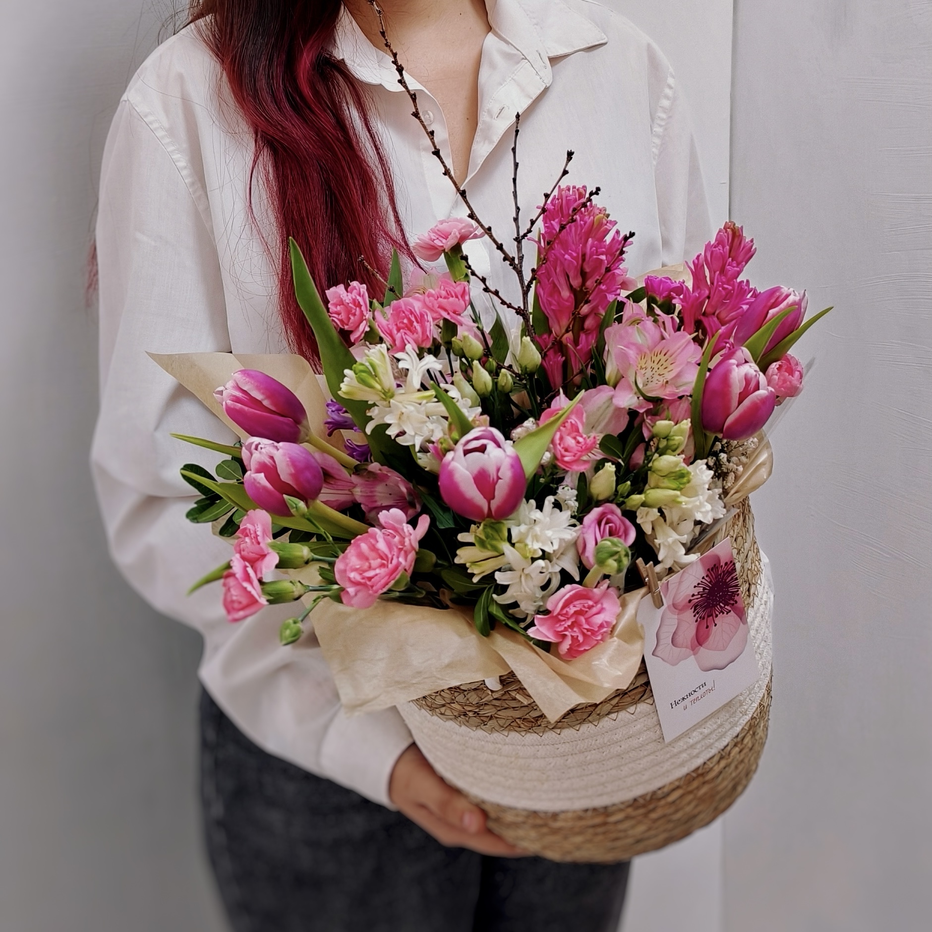 Композиция с тюльпанами и гиацинтами в плетеном кашпо / Готова к доставке сегодня