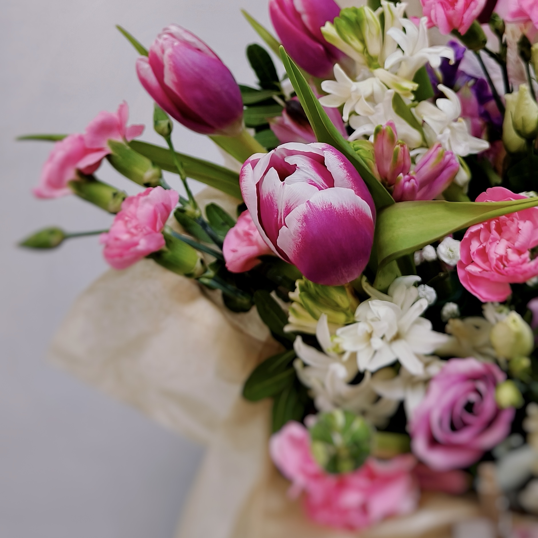 Яркие тюльпаны, аристократичная эустома, главное украшение цветущие гиацинты с их потрясающим ароматом.