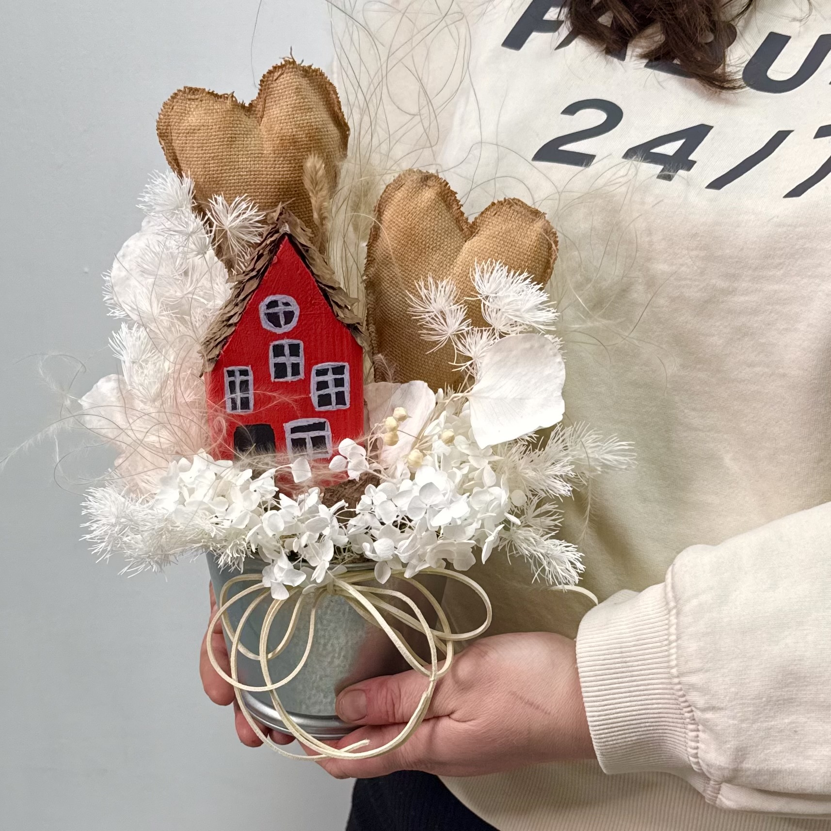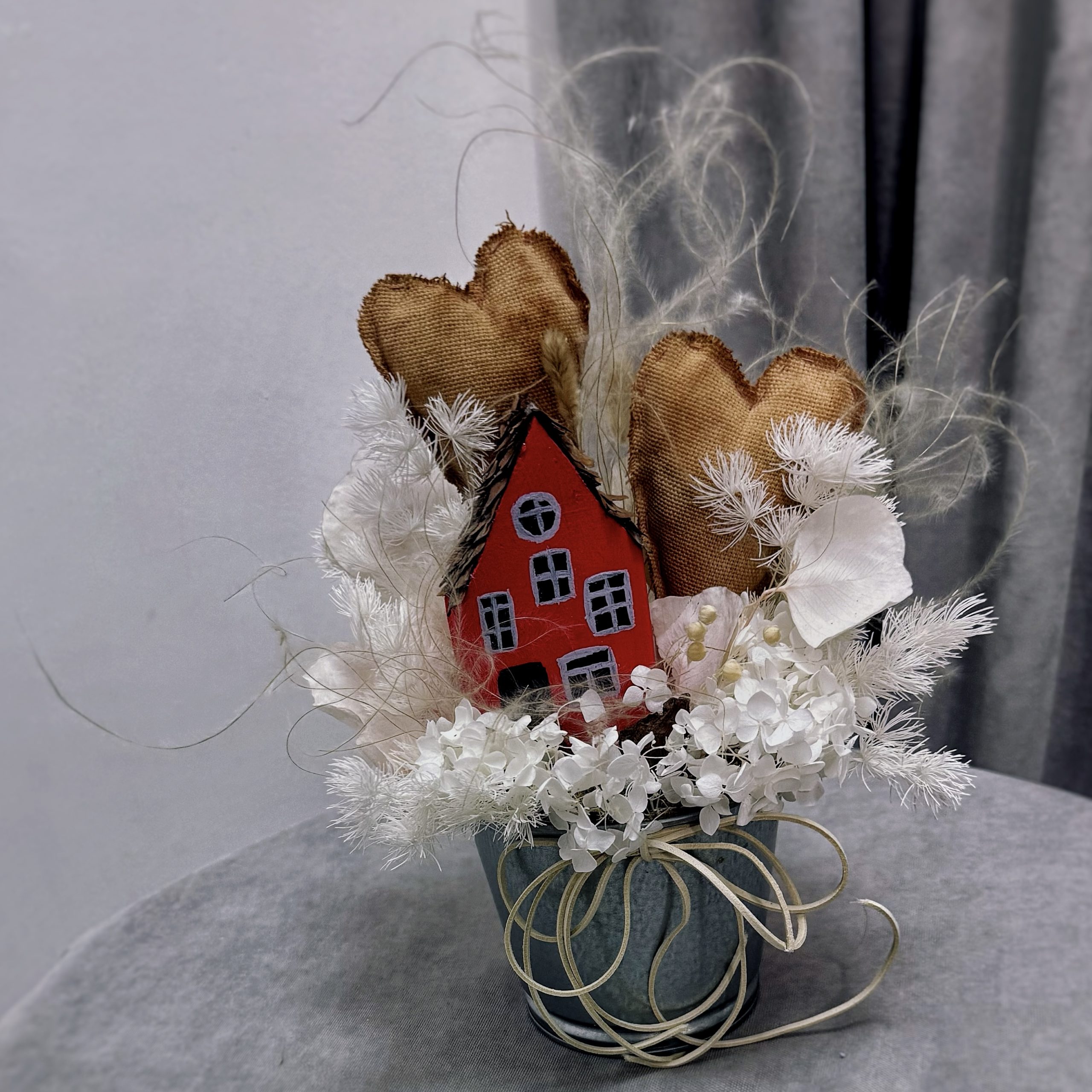 Ищете подарок со страстью и глубоким смыслом? Эта композиция — готовое выражение ваших чувств. Красный домик символизирует горячий, страстный очаг, а текстильные сердца — наполняющую его любовь. Сухоцветы говорят о стабильности и вечности. Вместе в стильном металлическом кашпо они создают мощный эмоциональный посыл
