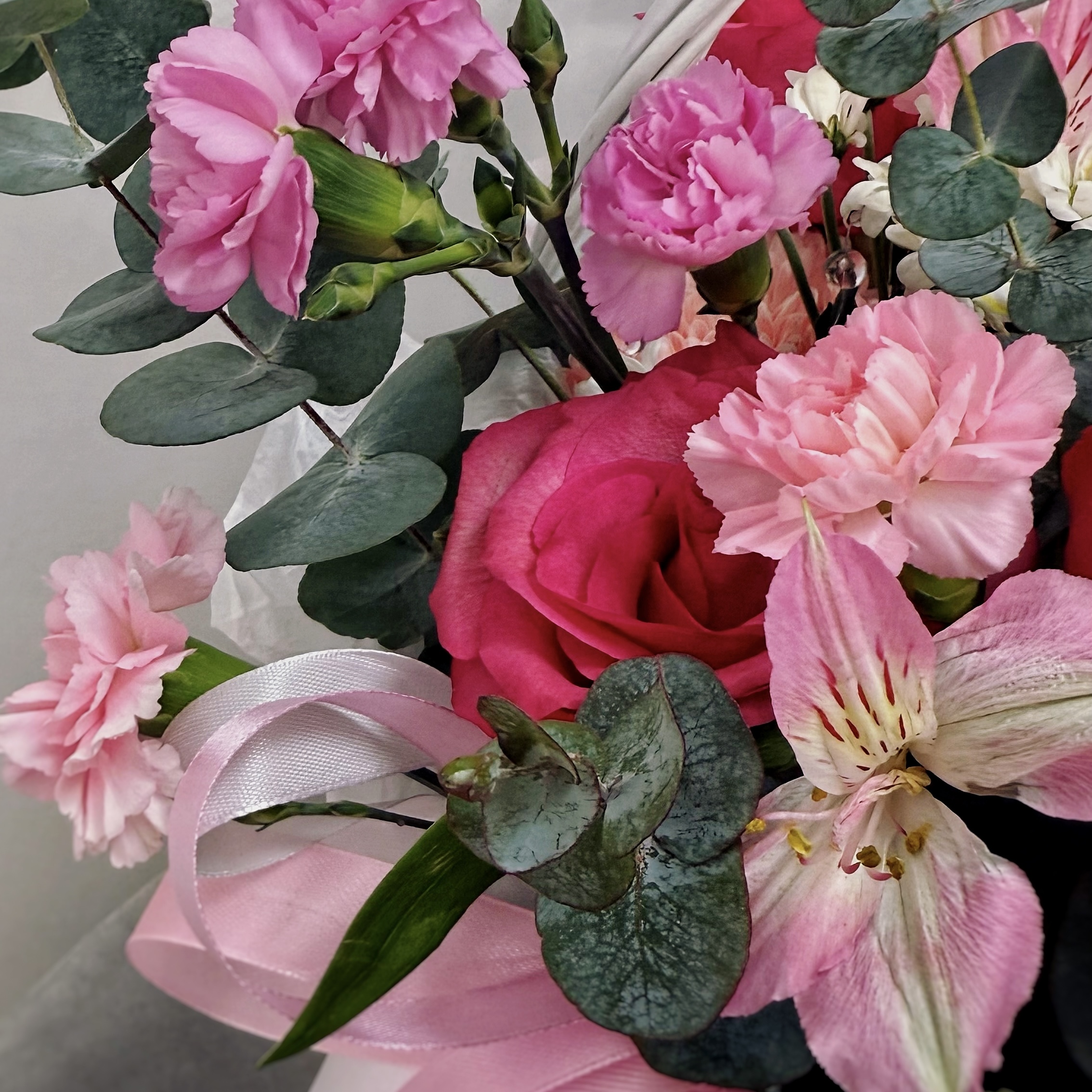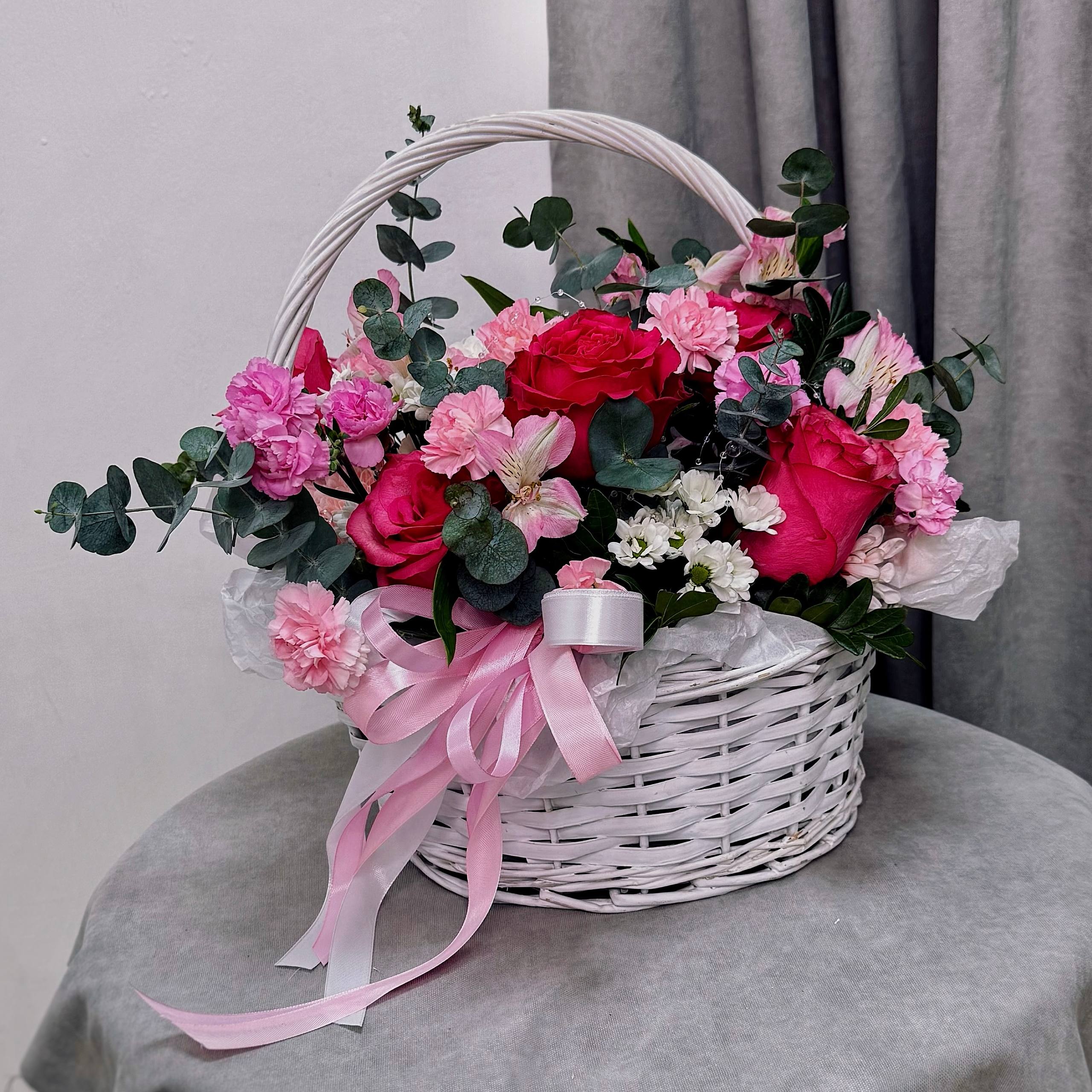 Корзина с малиновыми розами и альстромерией | Подарочная композиция 45/40 см | Доставка цветов Бердск