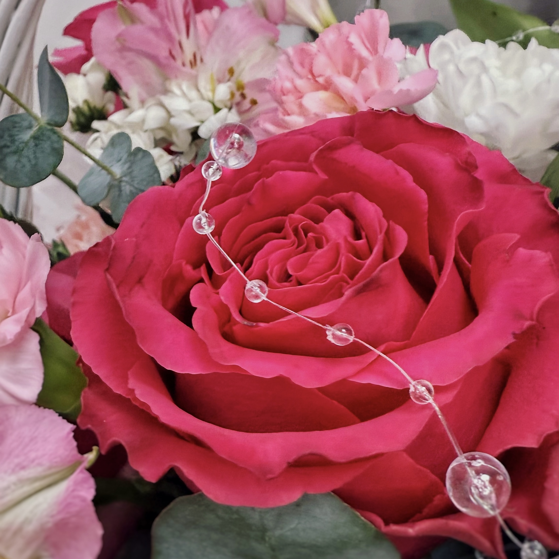 Готовая роскошная корзина — элегантный и самодостаточный подарок. Глубокие малиновые розы, стойкая альстромерия, пушистые хризантемы сантини и ажурный эвкалипт создают богатую фактуру и образ утончённой роскоши. Корзина (размер 45/40 см) — это готовое праздничное решение, не требующее вазы.