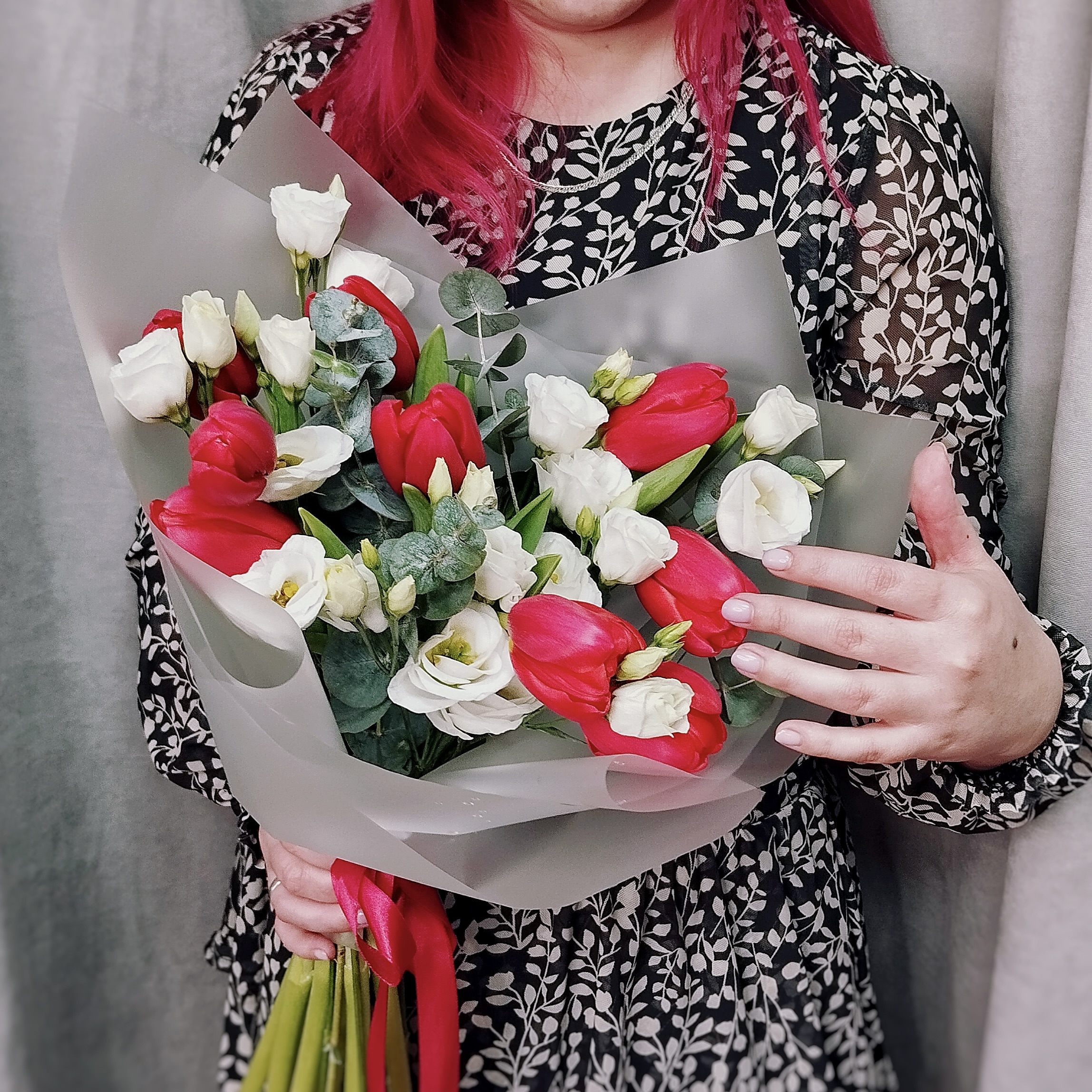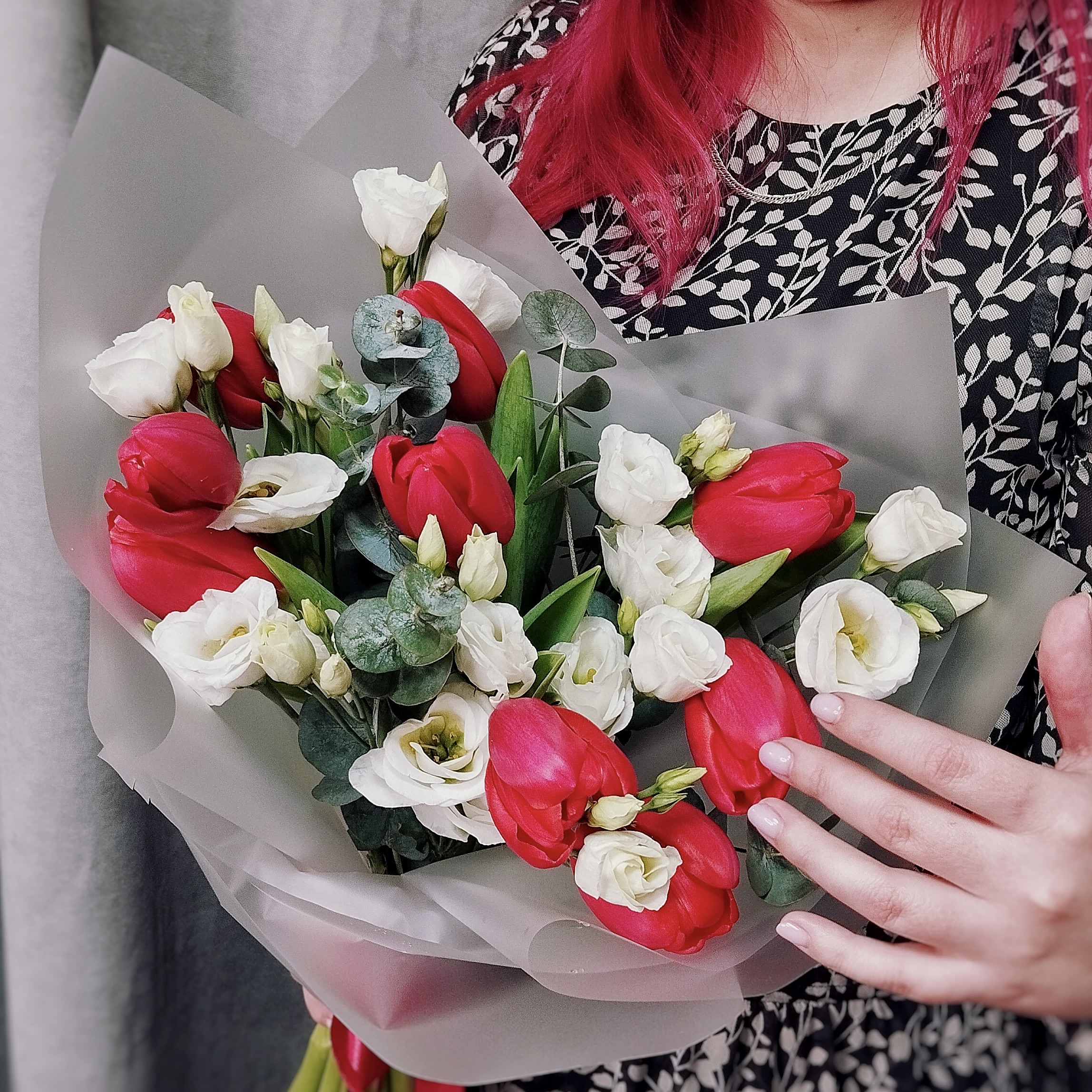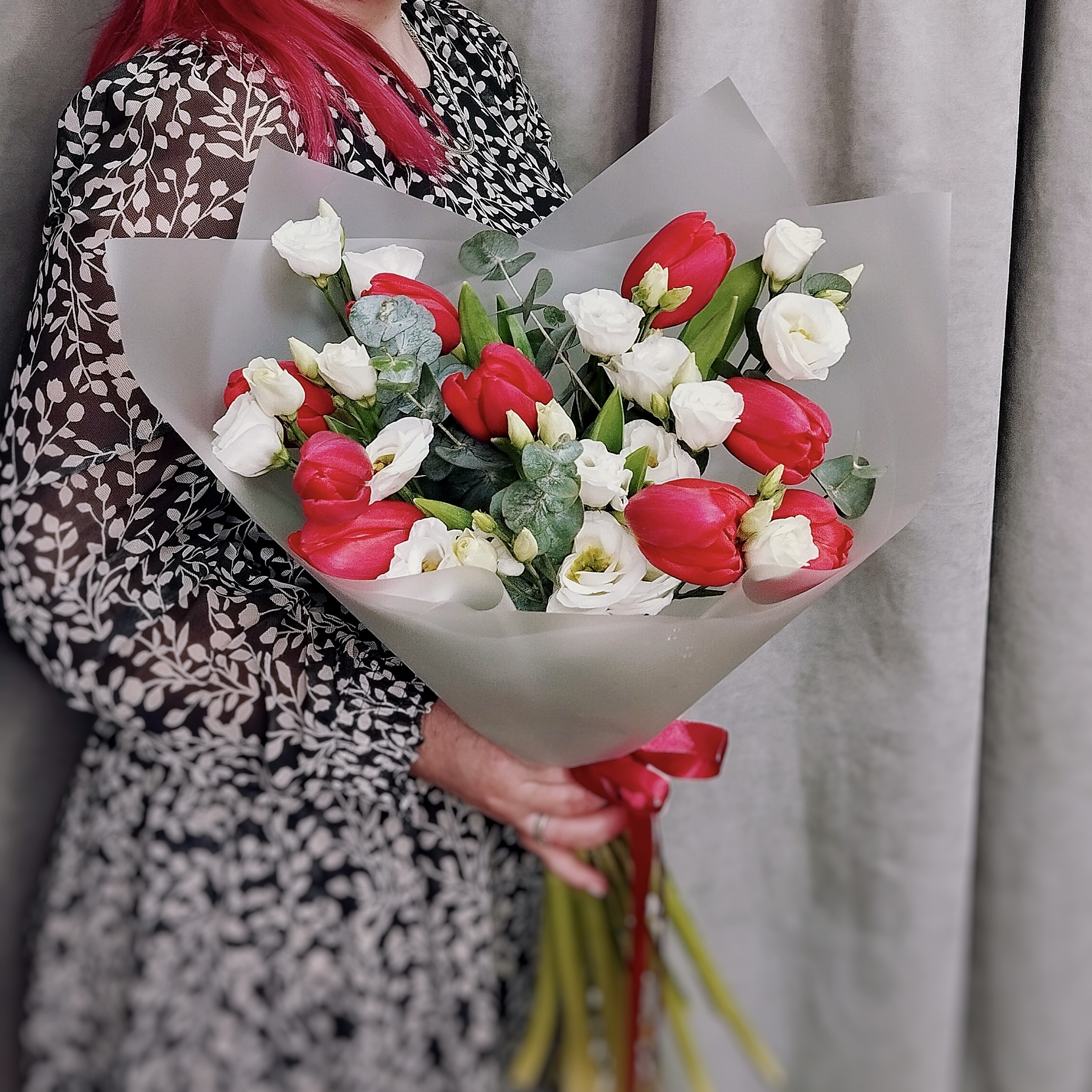 Красный — цвет страсти и энергии, признание и весеннее тепло. Они притягивают взгляд и задают энергичный тон, белый — символ чистоты и нежности, напоминающие нежные розы или колокольчики. Их аристократичная белизна смягчает страстность тюльпанов, добавляя букету утончённость и благородство. Их объединяет свежий эвкалипт с пряным ароматом, он не только придаёт композиции объём и свежесть, но и наполняет пространство лёгким, чуть терпким ароматом. Эвкалипт долго сохраняет декоративность