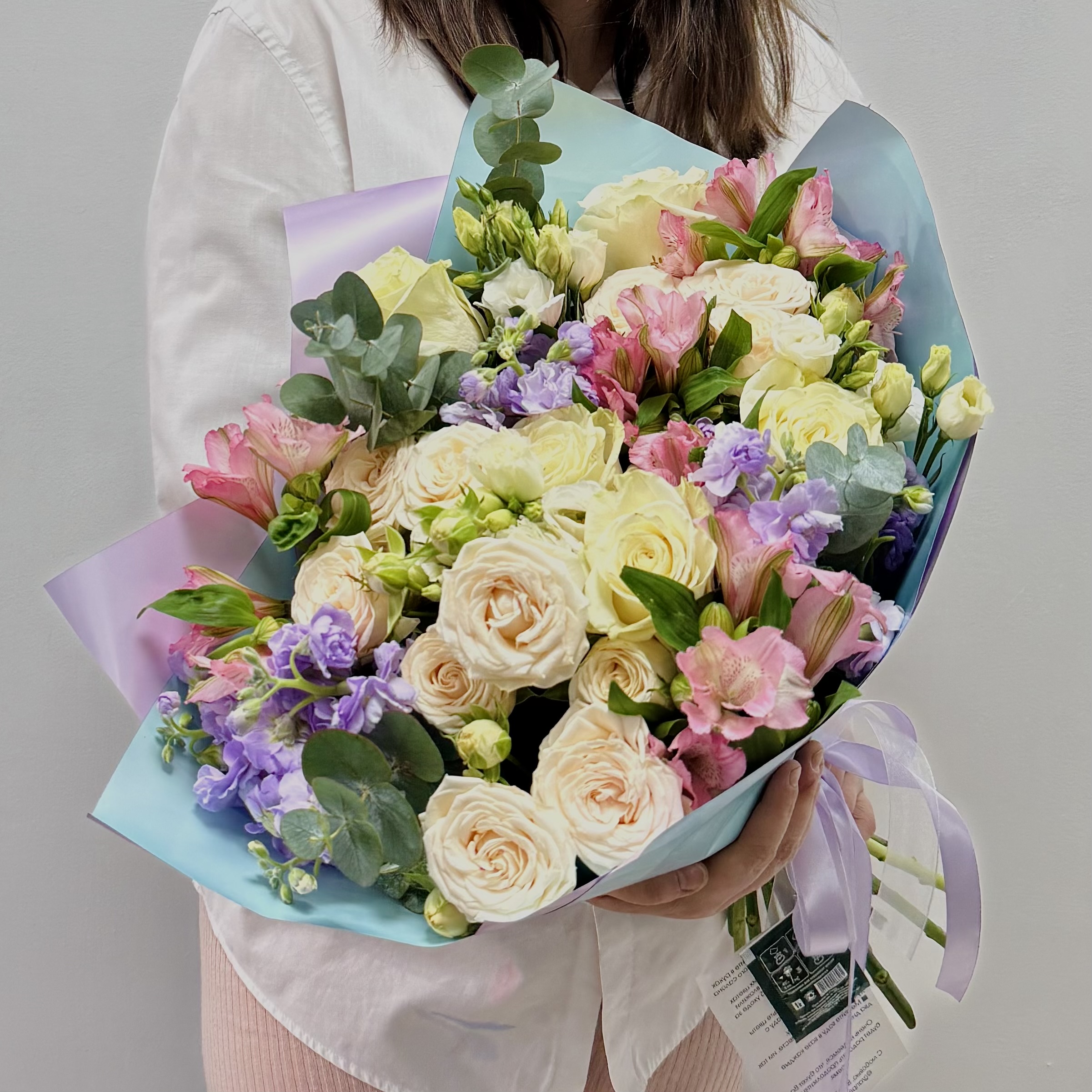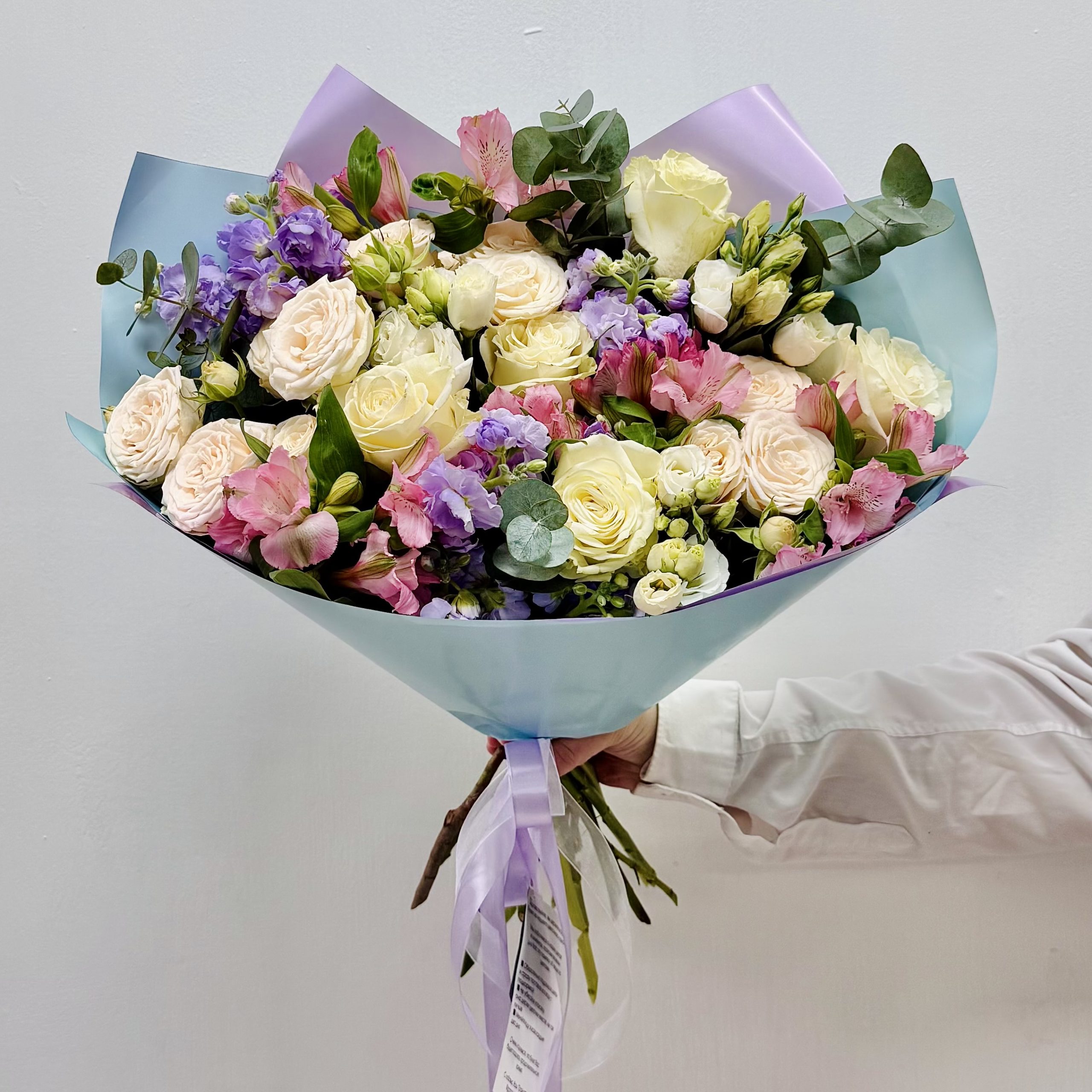 Нежность и элегантность в большом формате! Этот роскошный букет сочетает белые розы, пионовидные розы, маттиолу и эвкалипт. Композиция создает образ легкости и изысканности, а тонкий аромат маттиолы добавляет ей особое очарование.