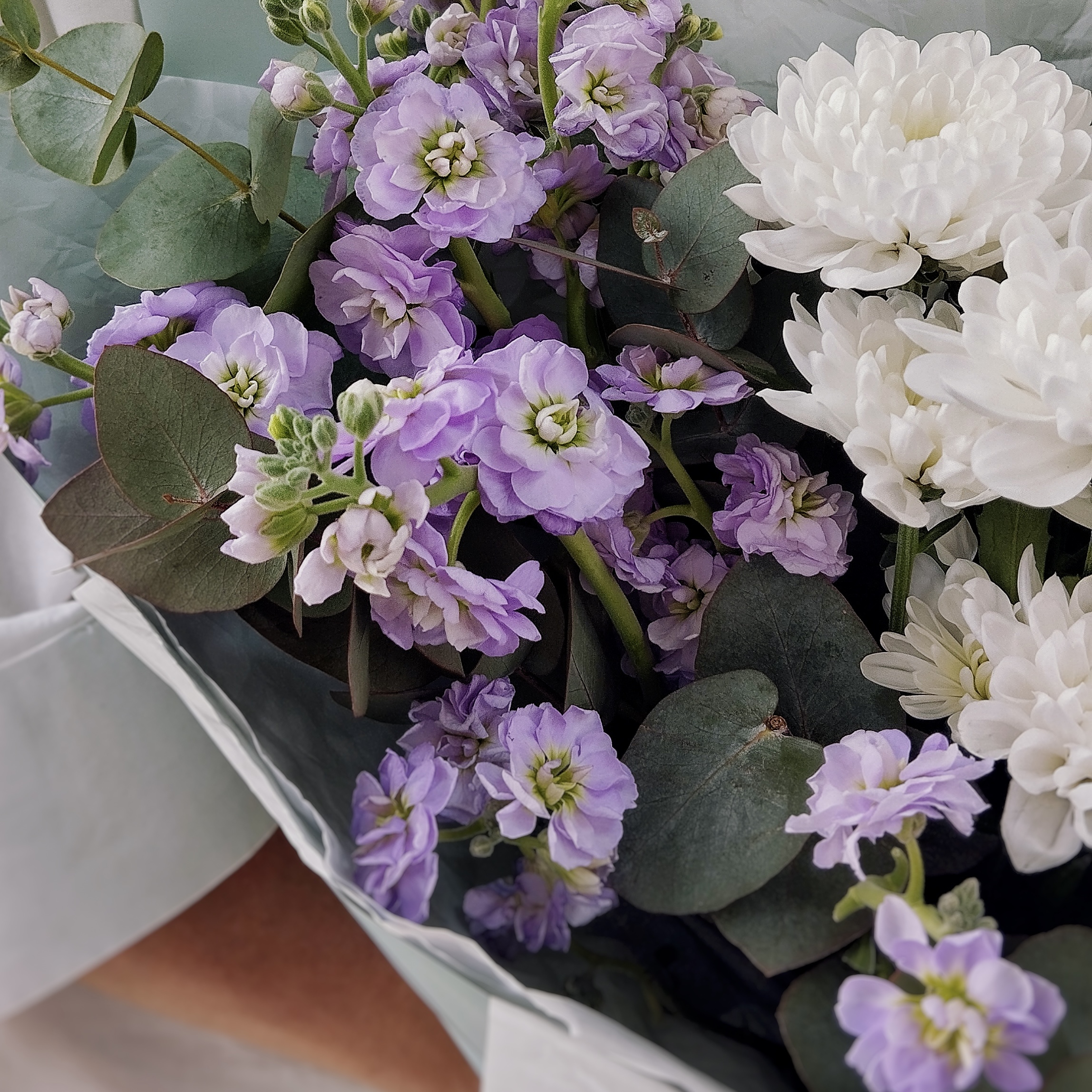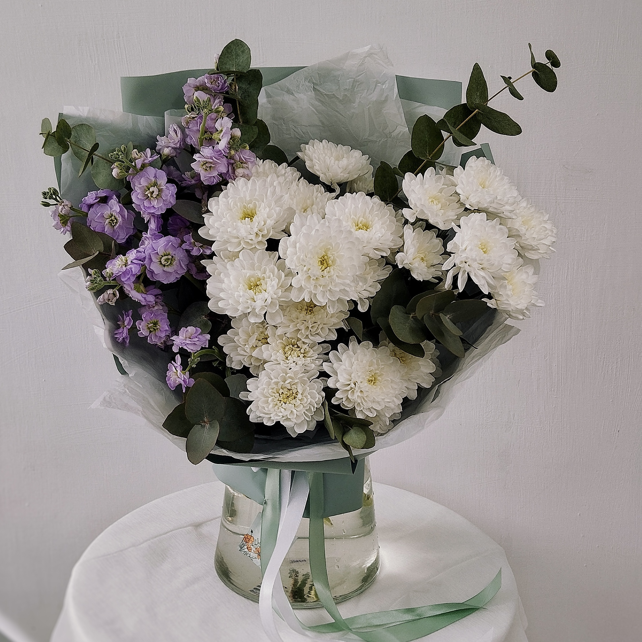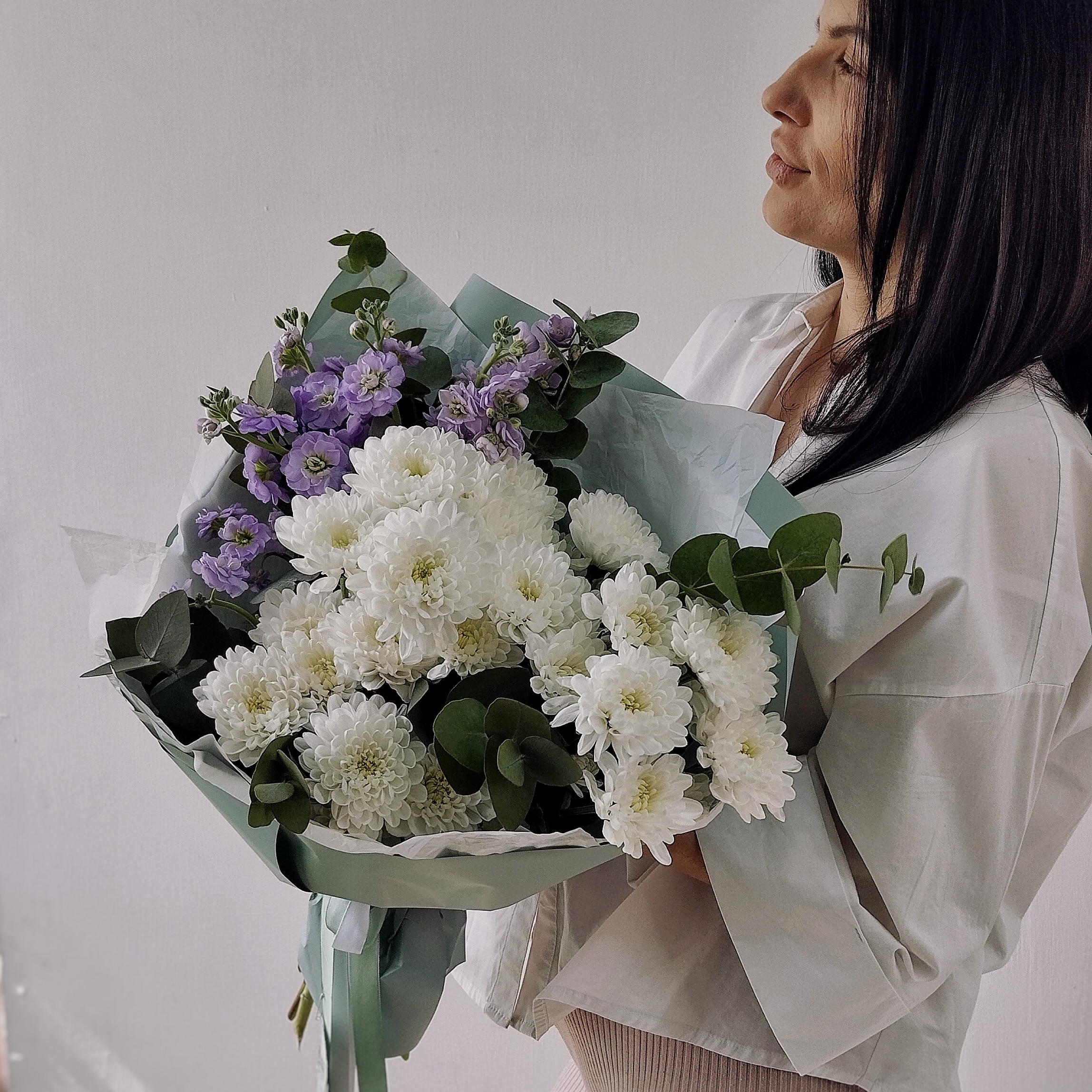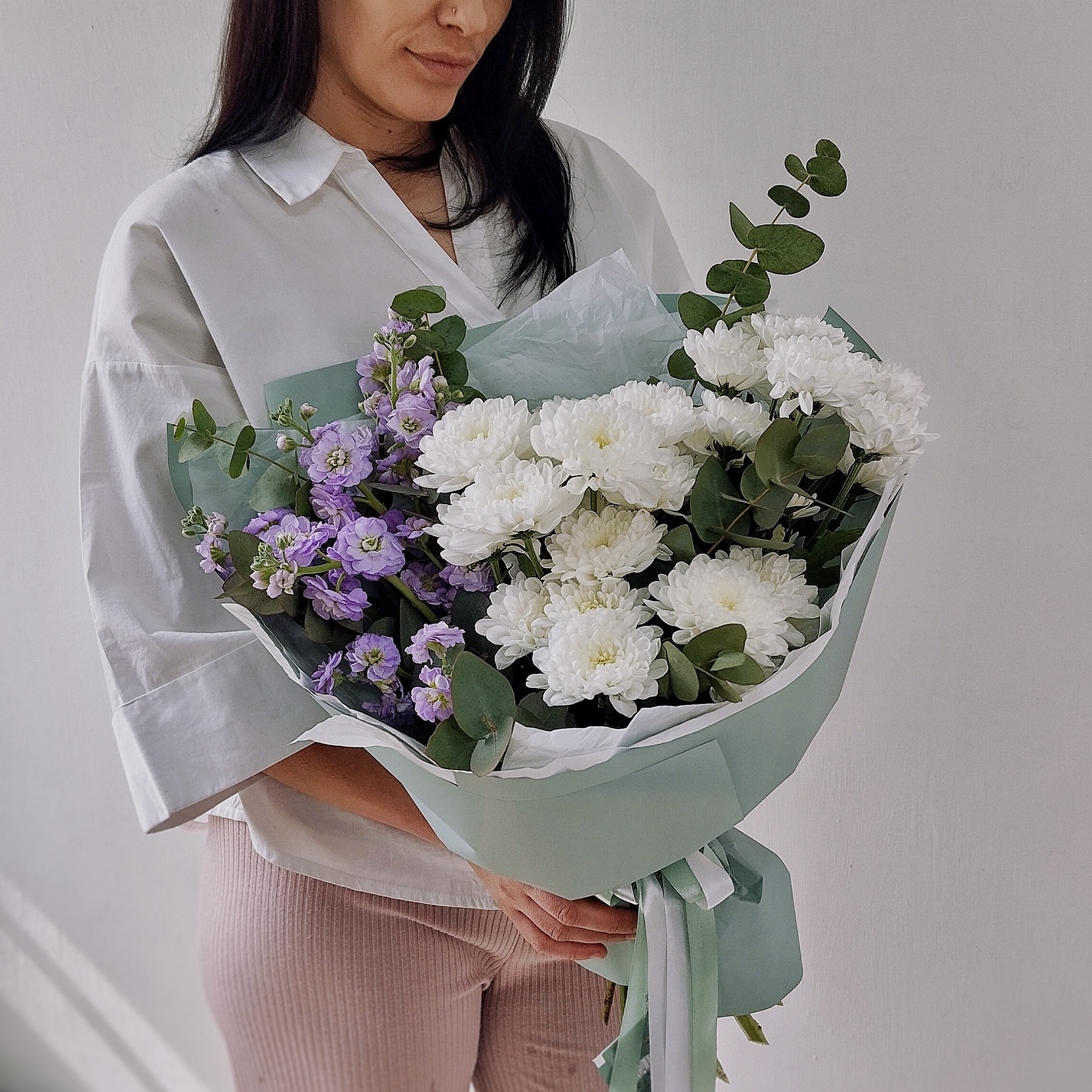 2 150 ₽ – 5 280 ₽- Если вы хотите купить цветы Бердск, которые выглядят стильно и свежо, обратите внимание на этот дуо-букет. Белые махровые кустовые хризантемы в паре с сиреневой маттиолой создают нежный контраст, а веточка эвкалипта добавляет лёгкий аромат и благородную зелень. Упаковка — мятная, с изящными лентами. Идеально для подарка подруге, коллеге или маме