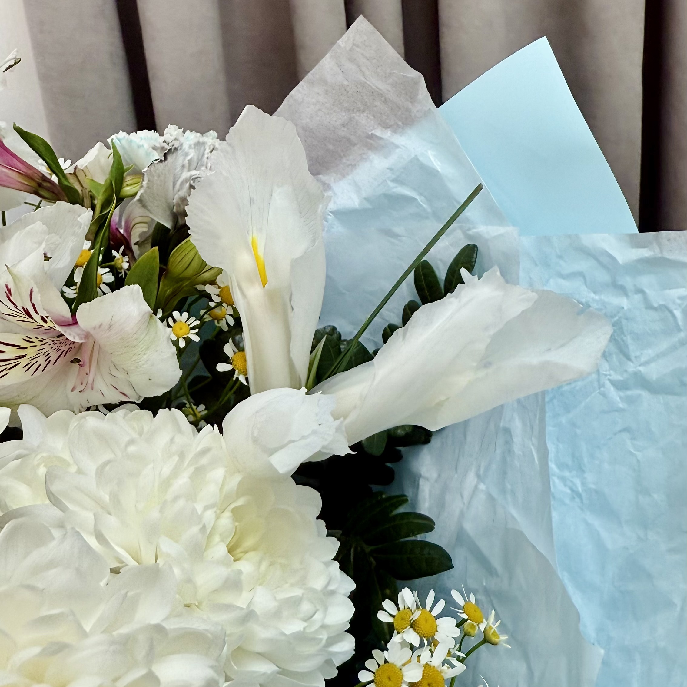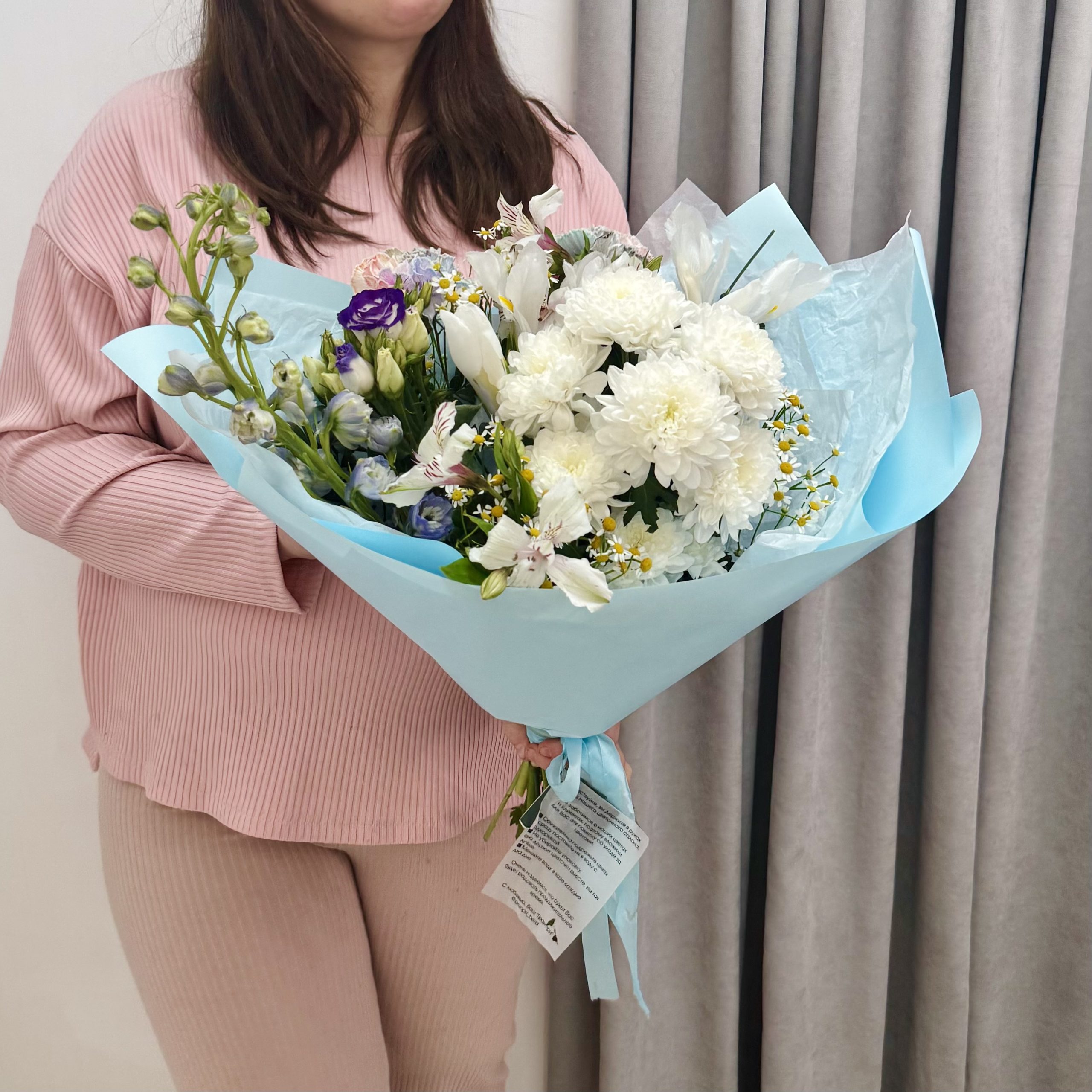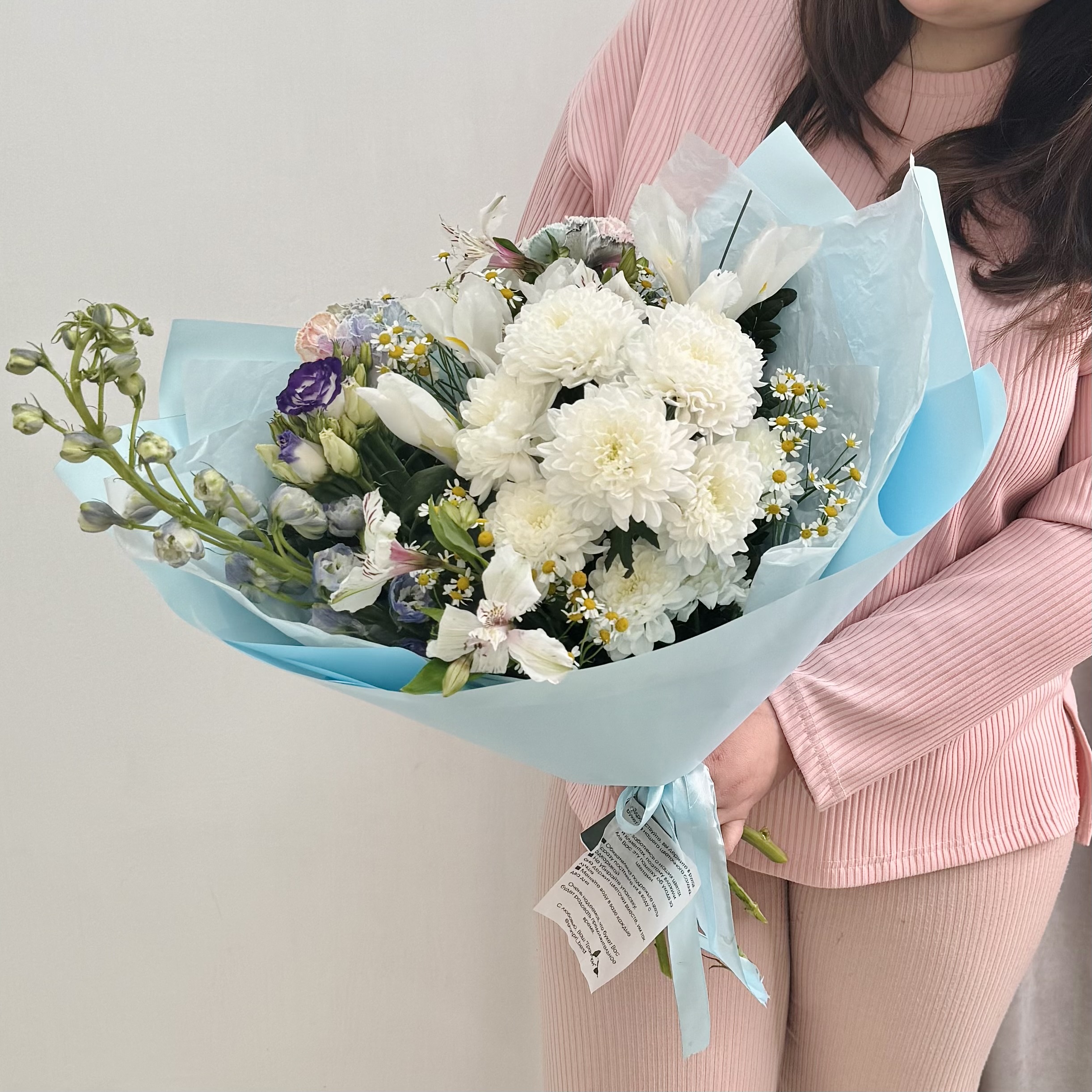 Этот воздушный букет в нежной бело-голубой гамме сочетает пышную хризантему, изящный дельфиниум, добавляющий высоту и лёгкость, и милые ромашки, придающие образу трогательную простоту. Идеальный баланс цвета и формы создаёт ощущение свежести, спокойствия и гармонии.