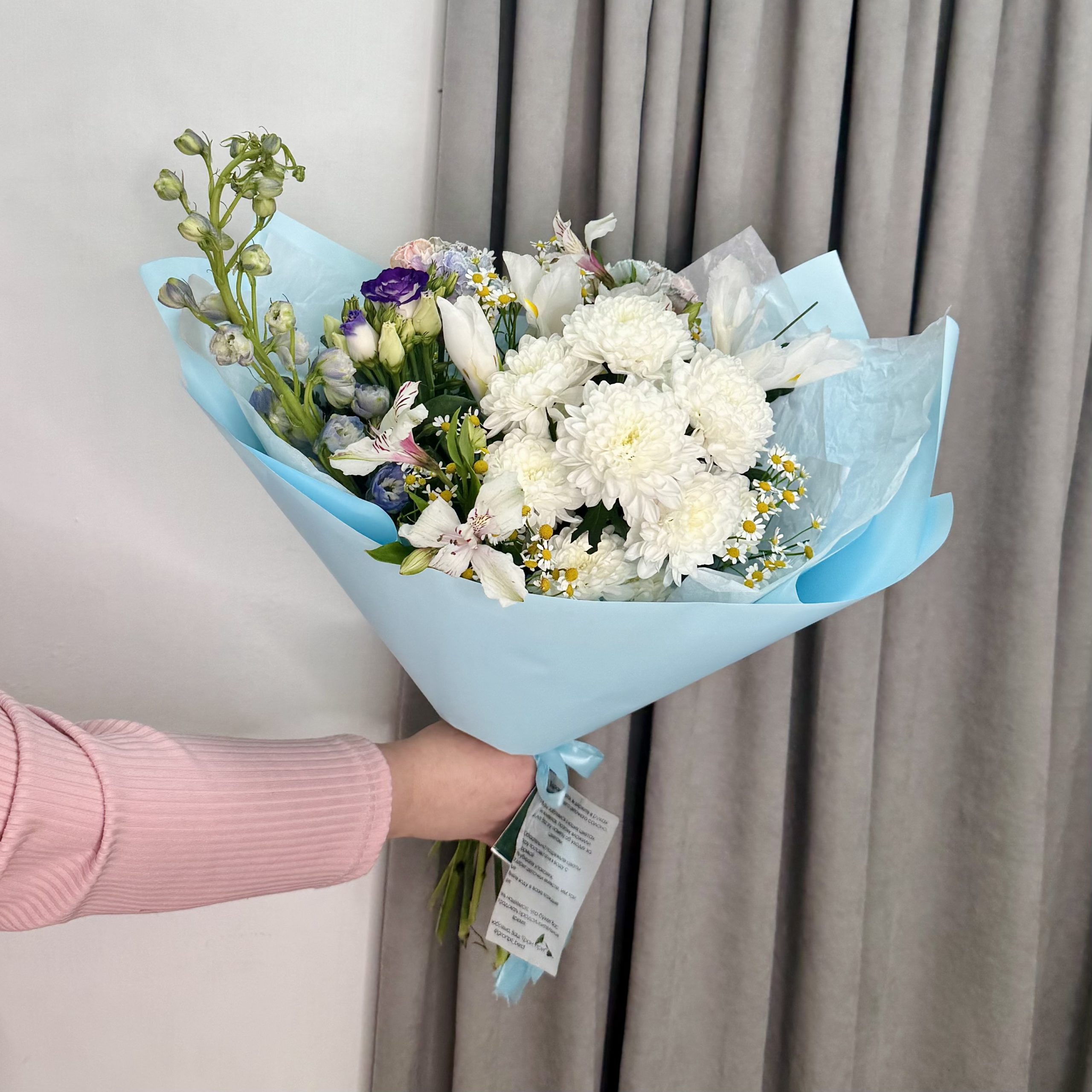 Нежный бело-голубой букет с хризантемой и дельфиниумом | Ромашки | Размер 40/50 см | Доставка цветов в Бердске