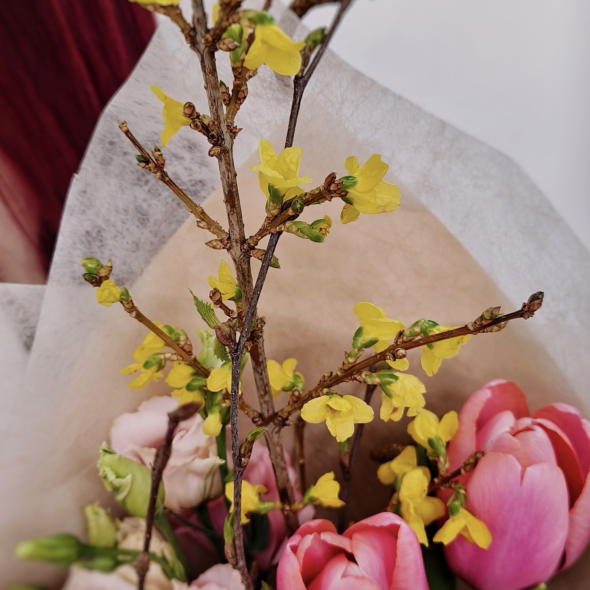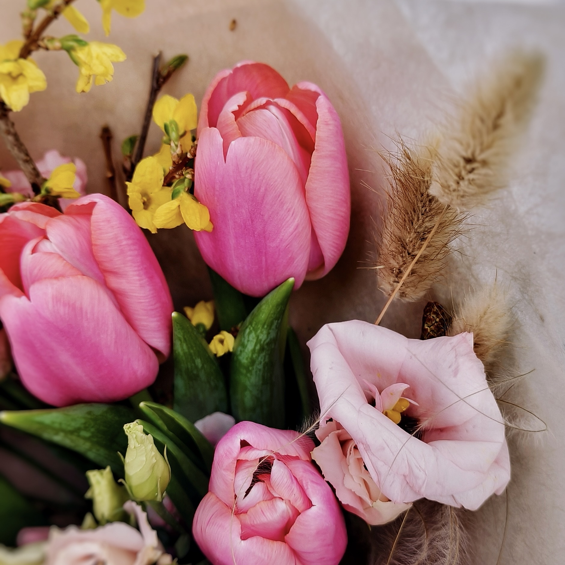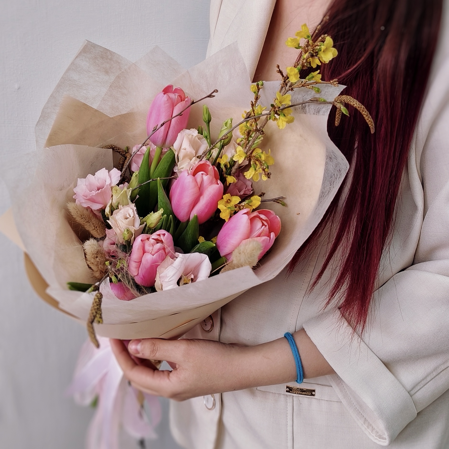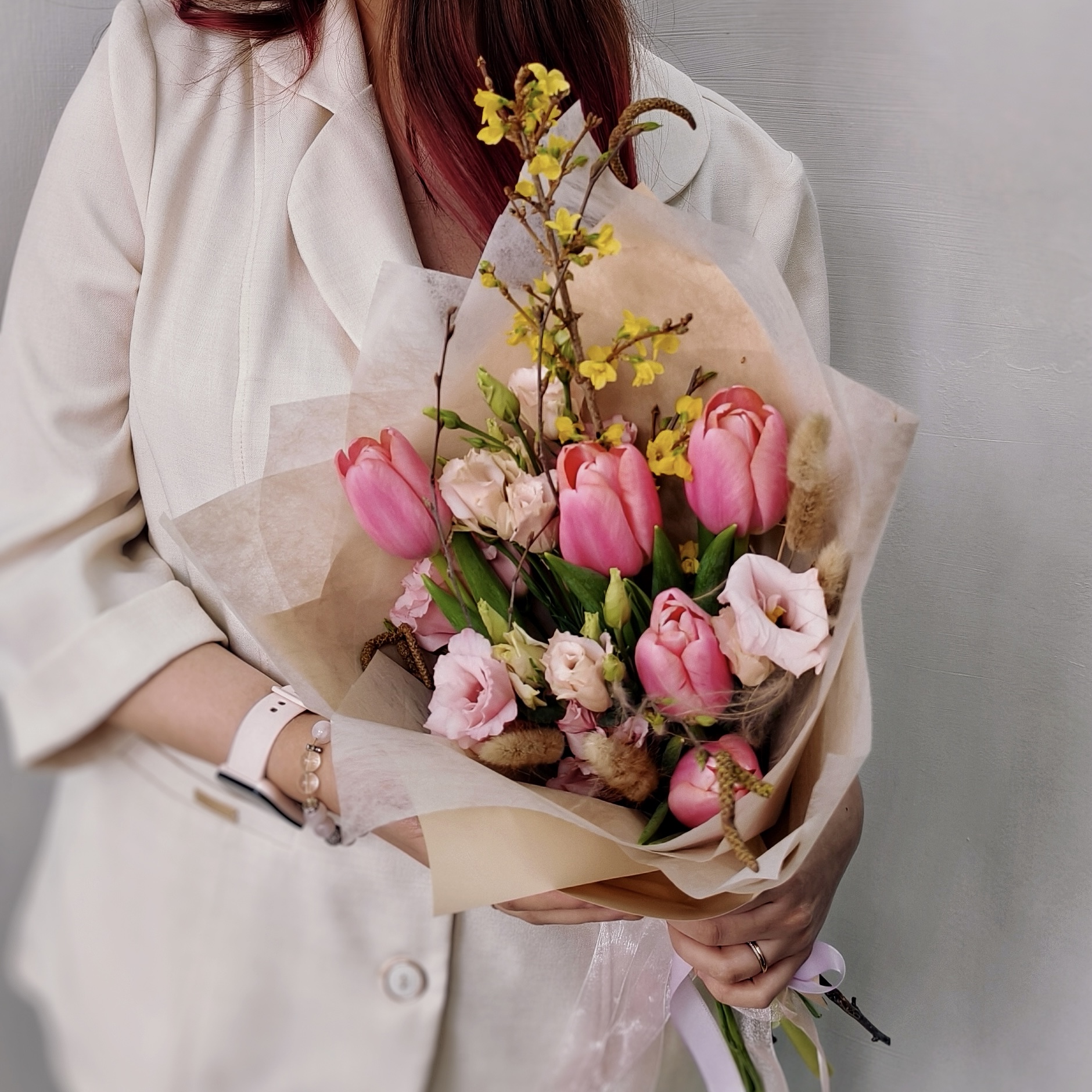 Нежные розовые тюльпаны, утонченная эустома, похожая на маленькие розы, и трогательные цветущие веточки форзиции создают композицию, полную жизни и света. Стройный размер 30/50 см позволяет букету выглядеть элегантно и величественно.
