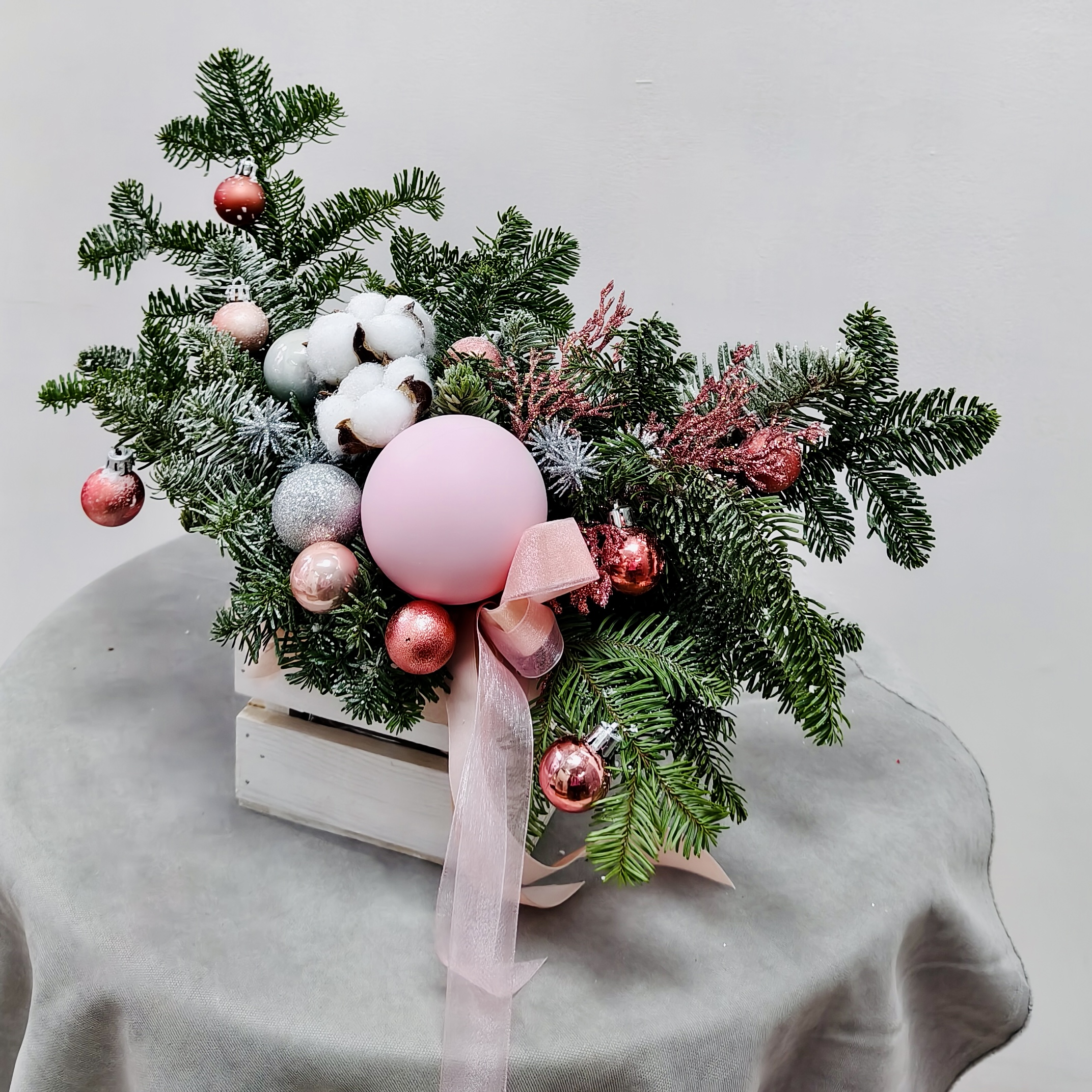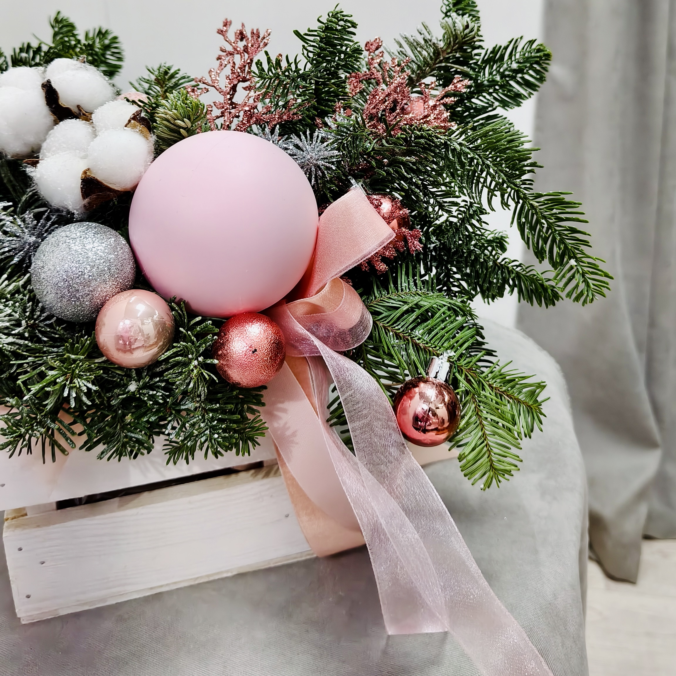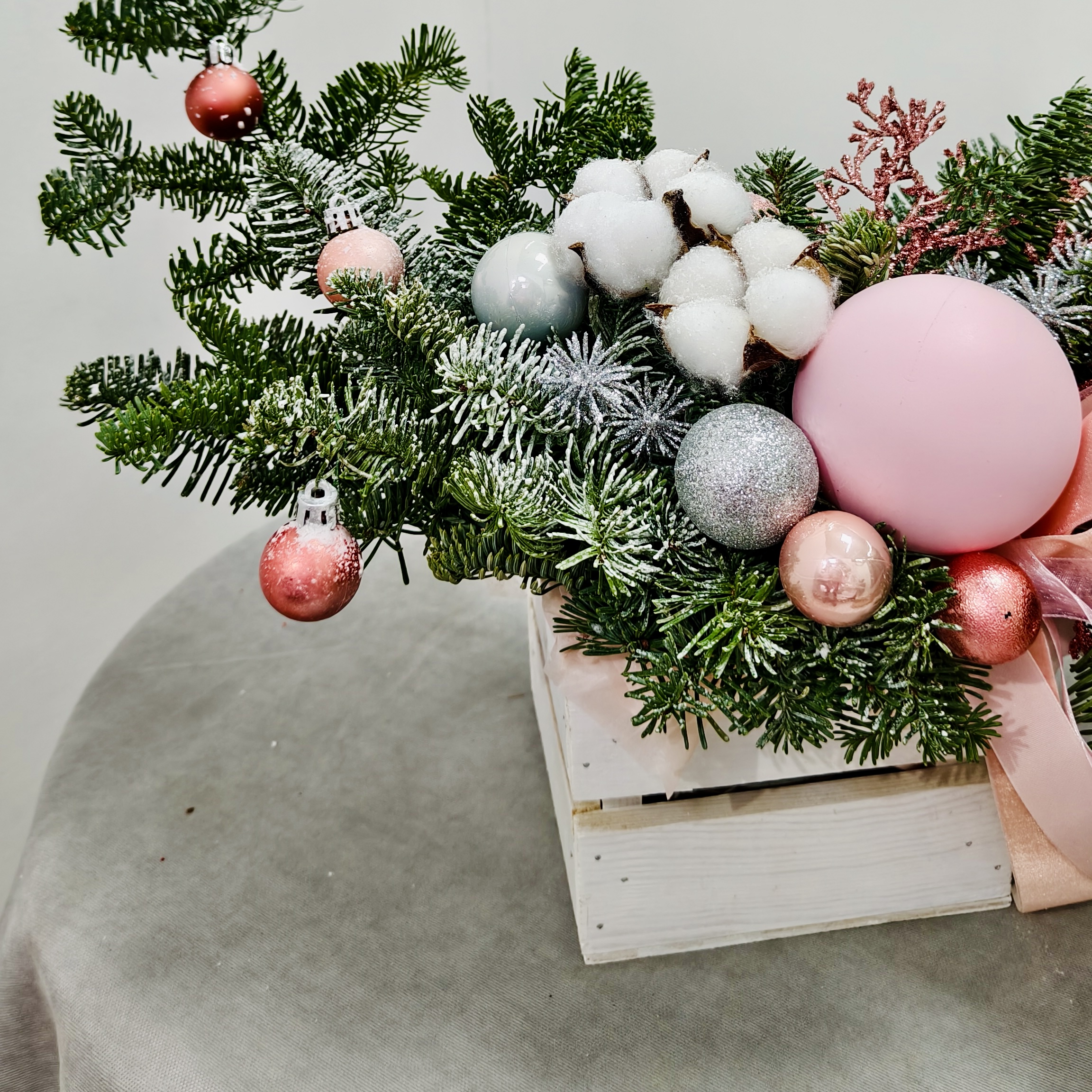 Новогодняя композиция в деревянном ящике 50/40 см | Голубая ель, розовые шары