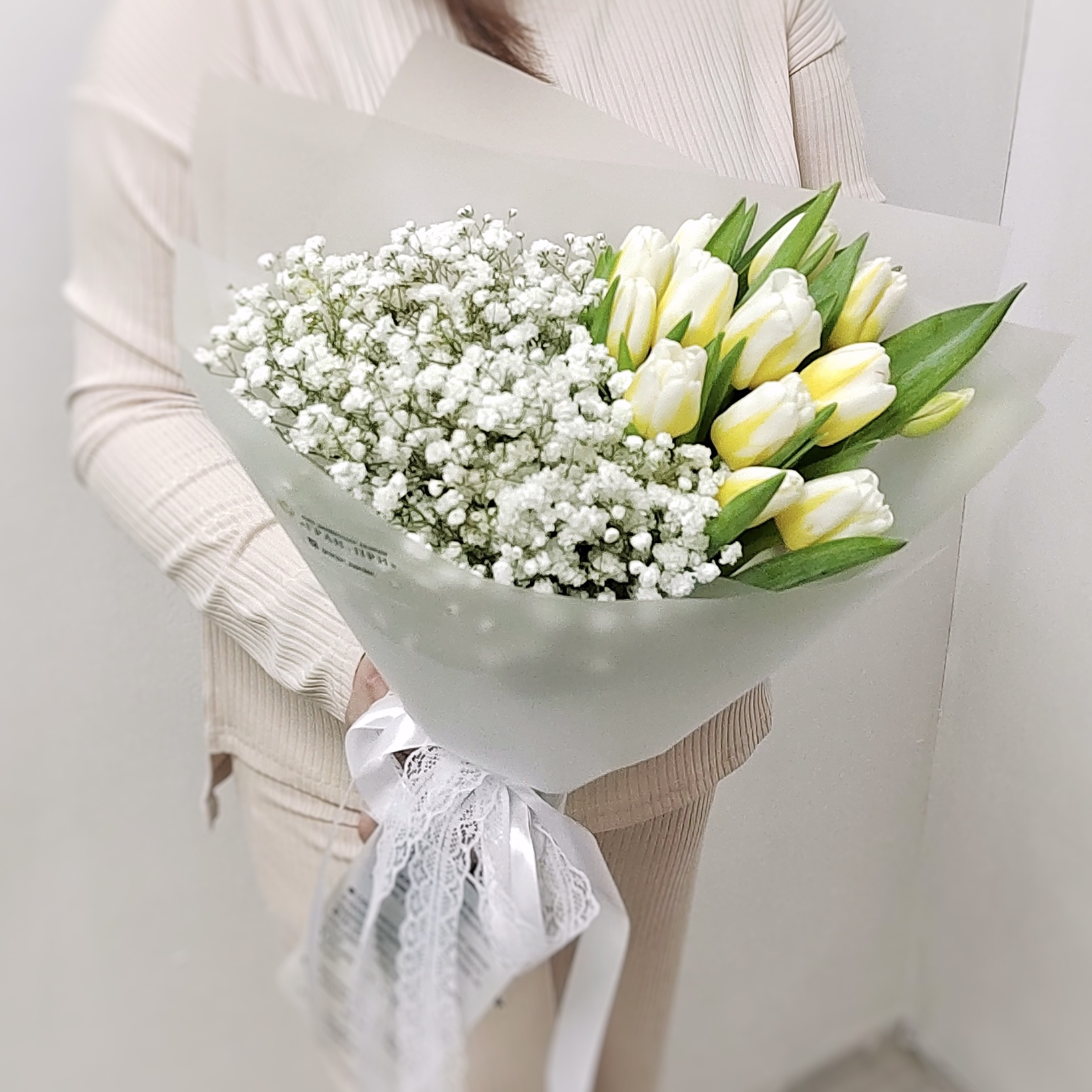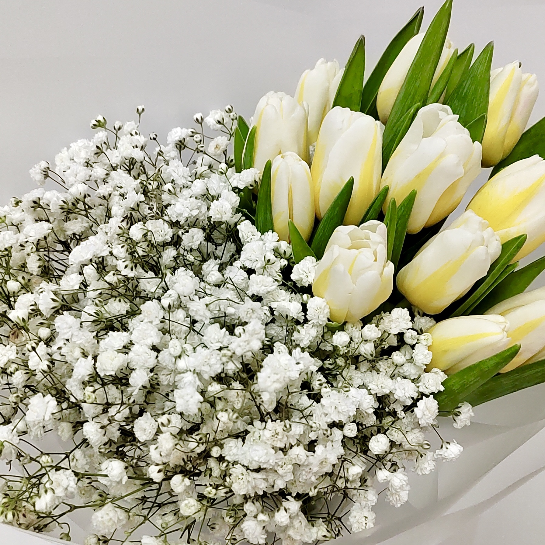 Этот букет — словно первое весеннее облако, спустившееся с неба, чтобы подарить радость. Крупные, белоснежные бутоны тюльпанов, символизирующие чистоту и искренность, утопают в нежной дымке из гипсофилы. Эти мелкие белые цветы создают эффект воздушности и легкости, делая композию по-настоящему живой и трогательной