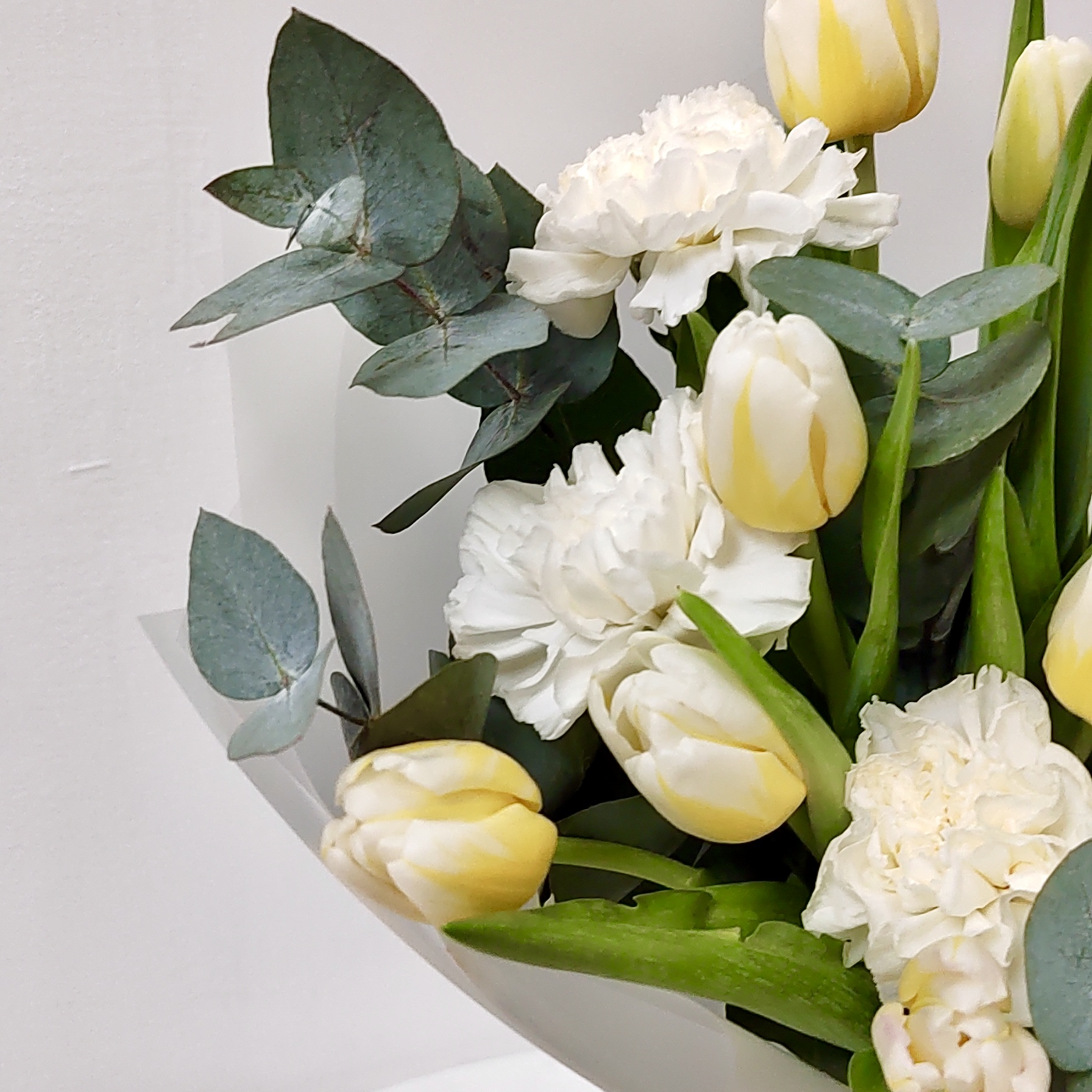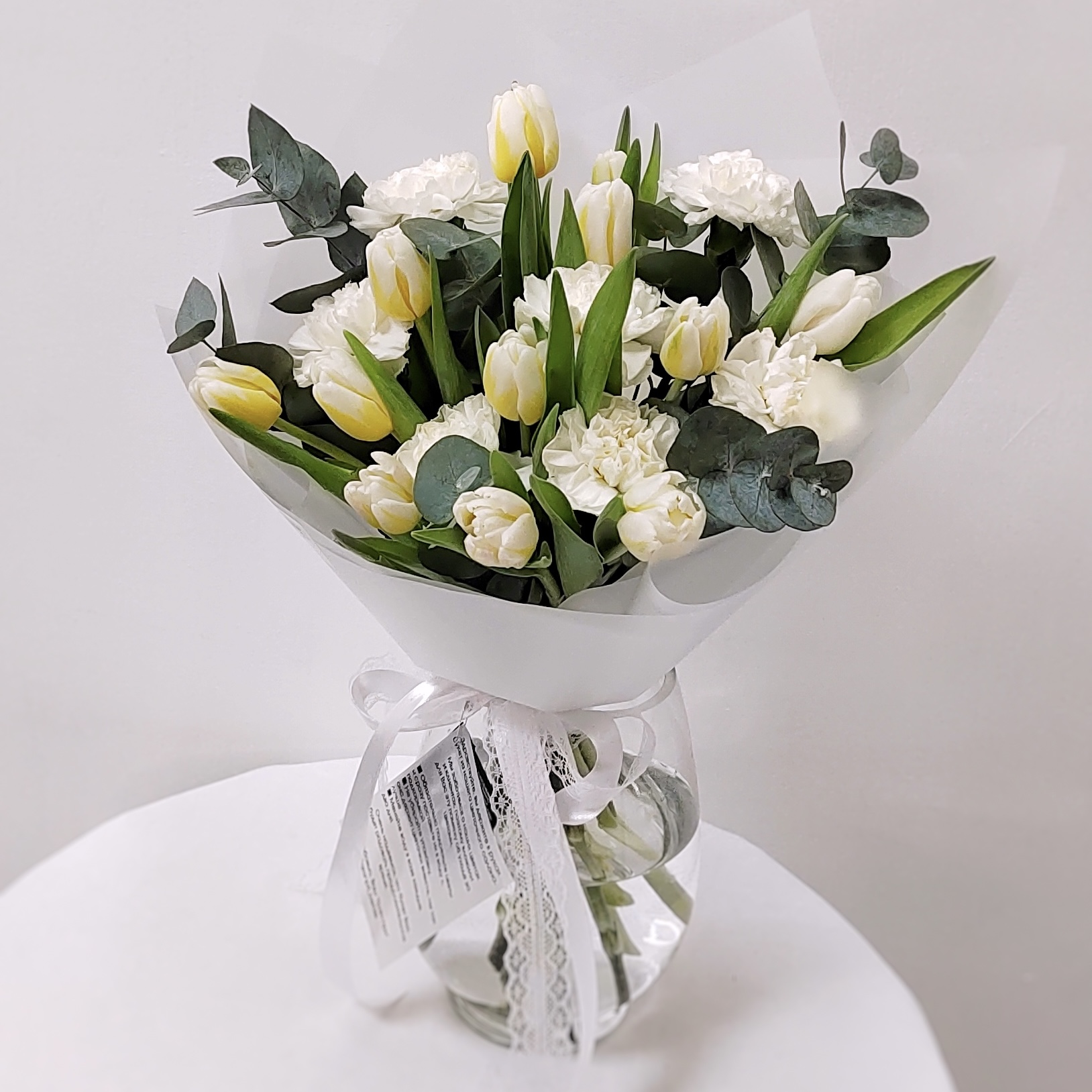 Изысканный и благородный букет для самых важных моментов. Мы собрали композицию в чистой белой гамме, где каждый цветок звучит особенно: нежные тюльпаны символизируют весну и пробуждение чувств, махровая или обычная гвоздика добавляет объём и трогательную текстуру, а веточки эвкалипта вносят свежесть и тонкий, чуть смолистый аромат.