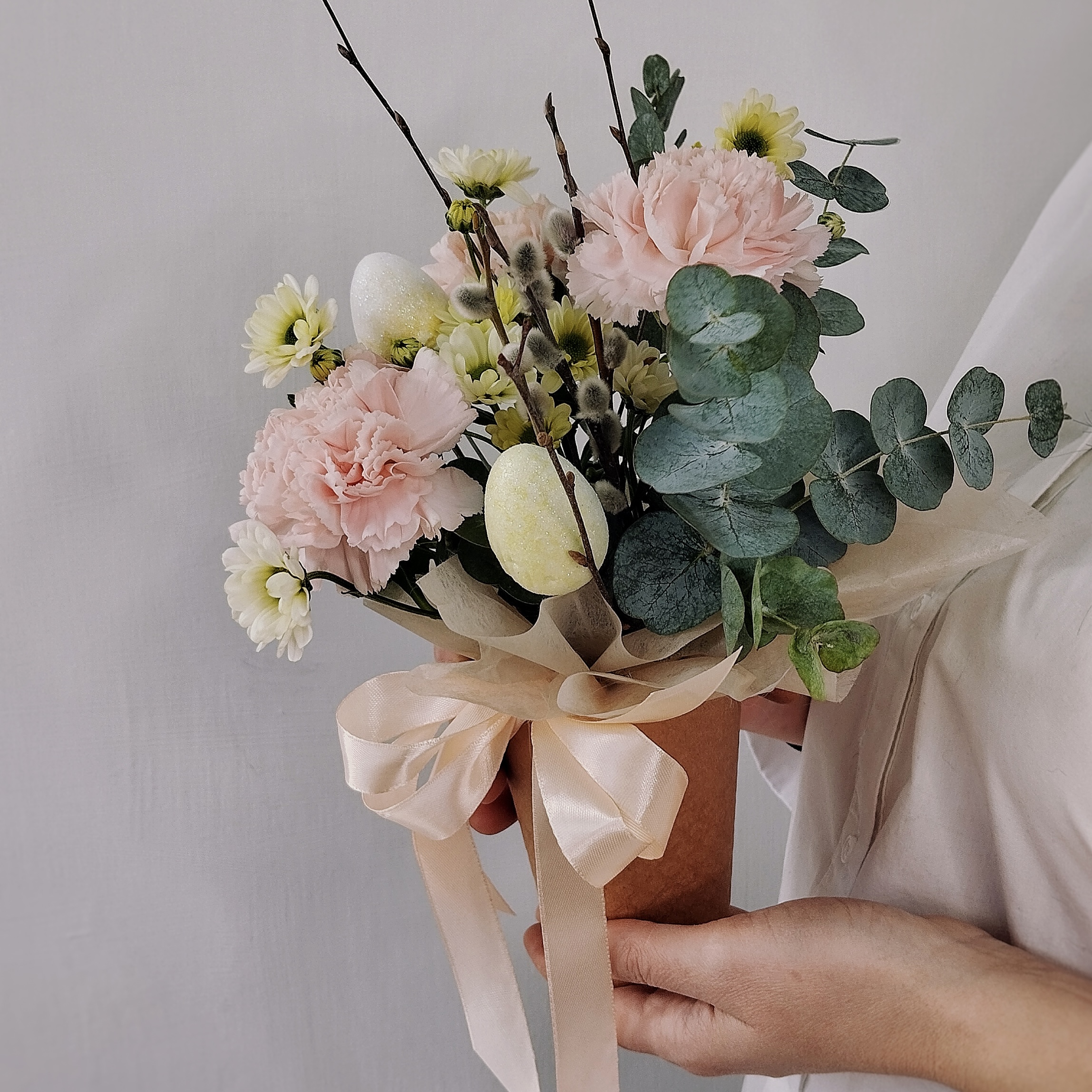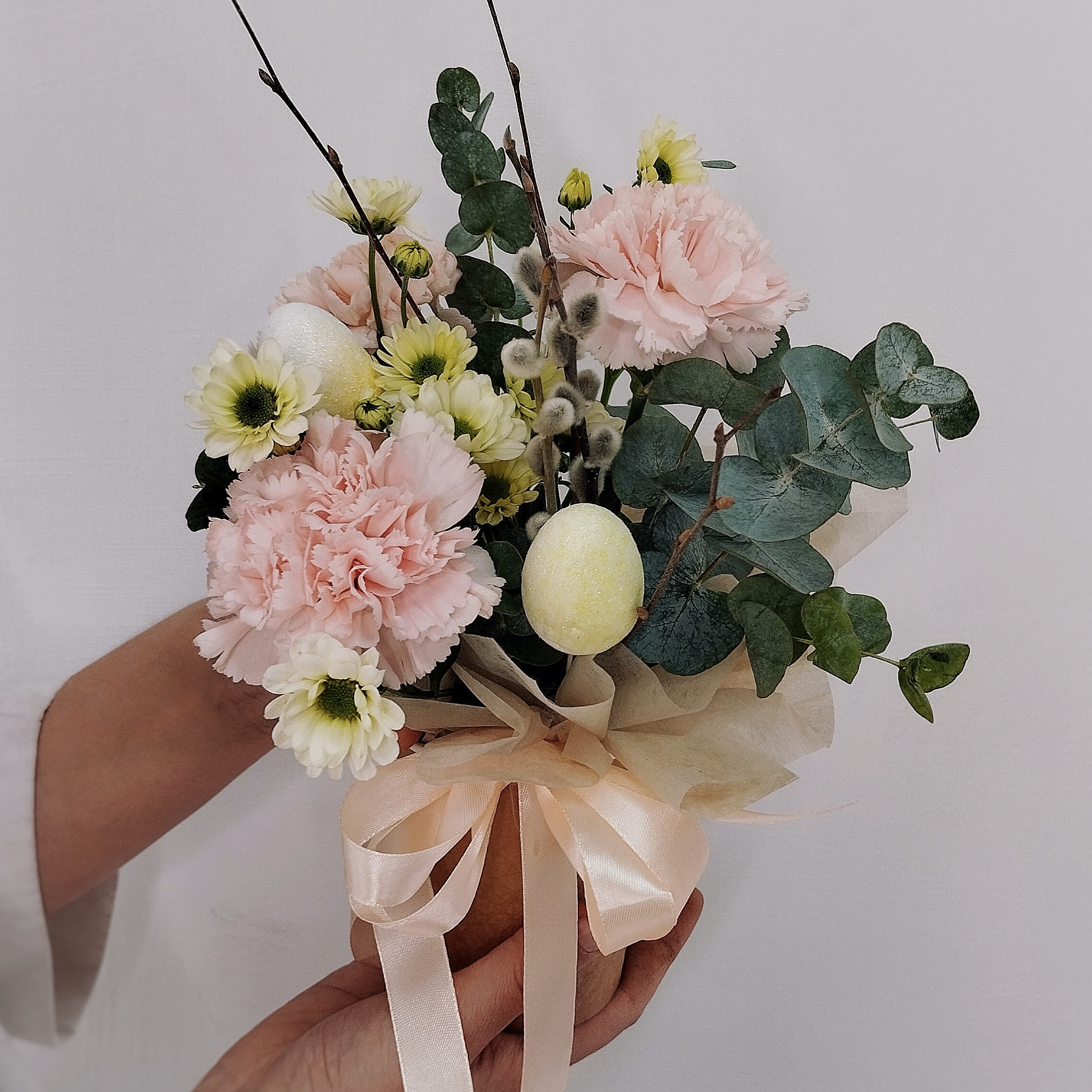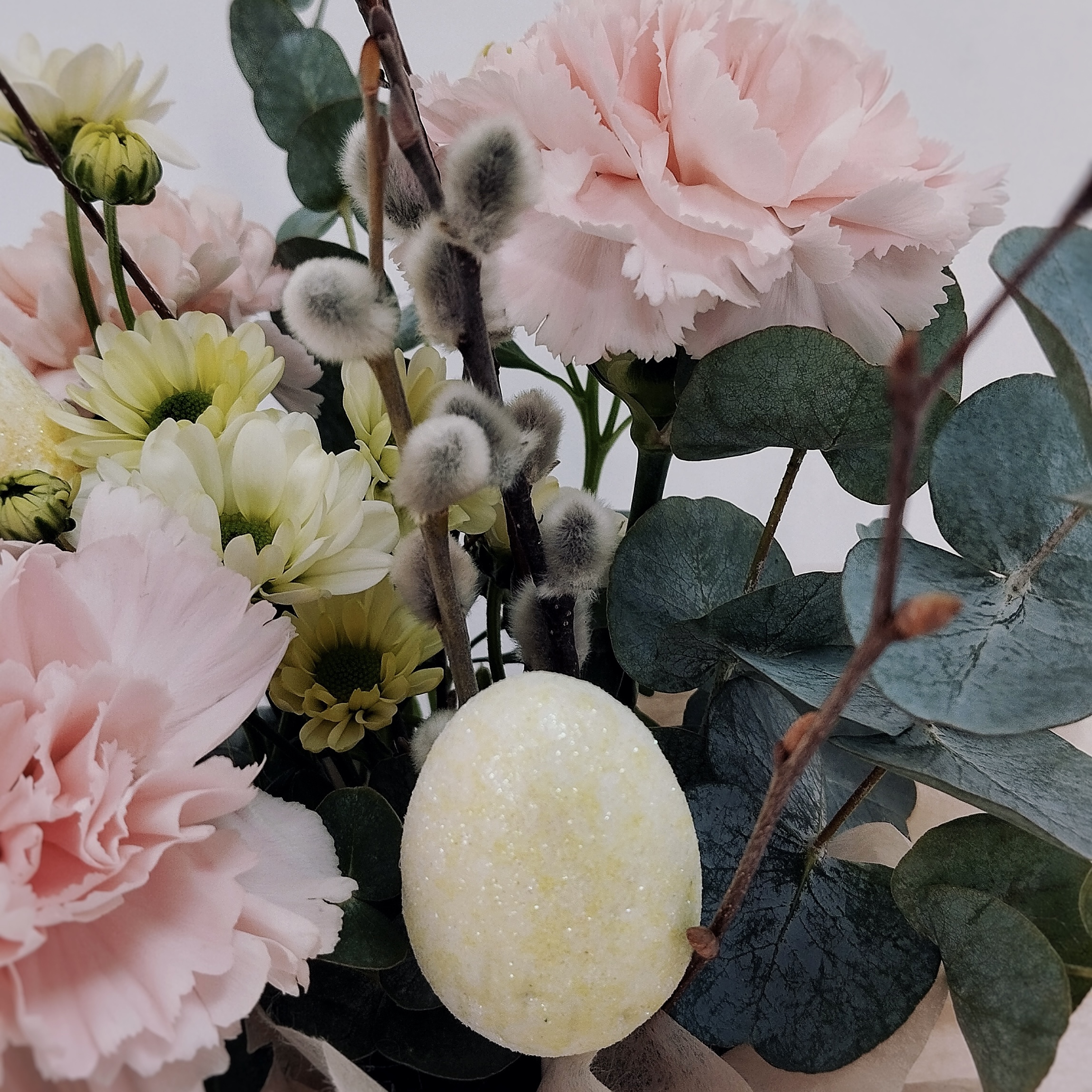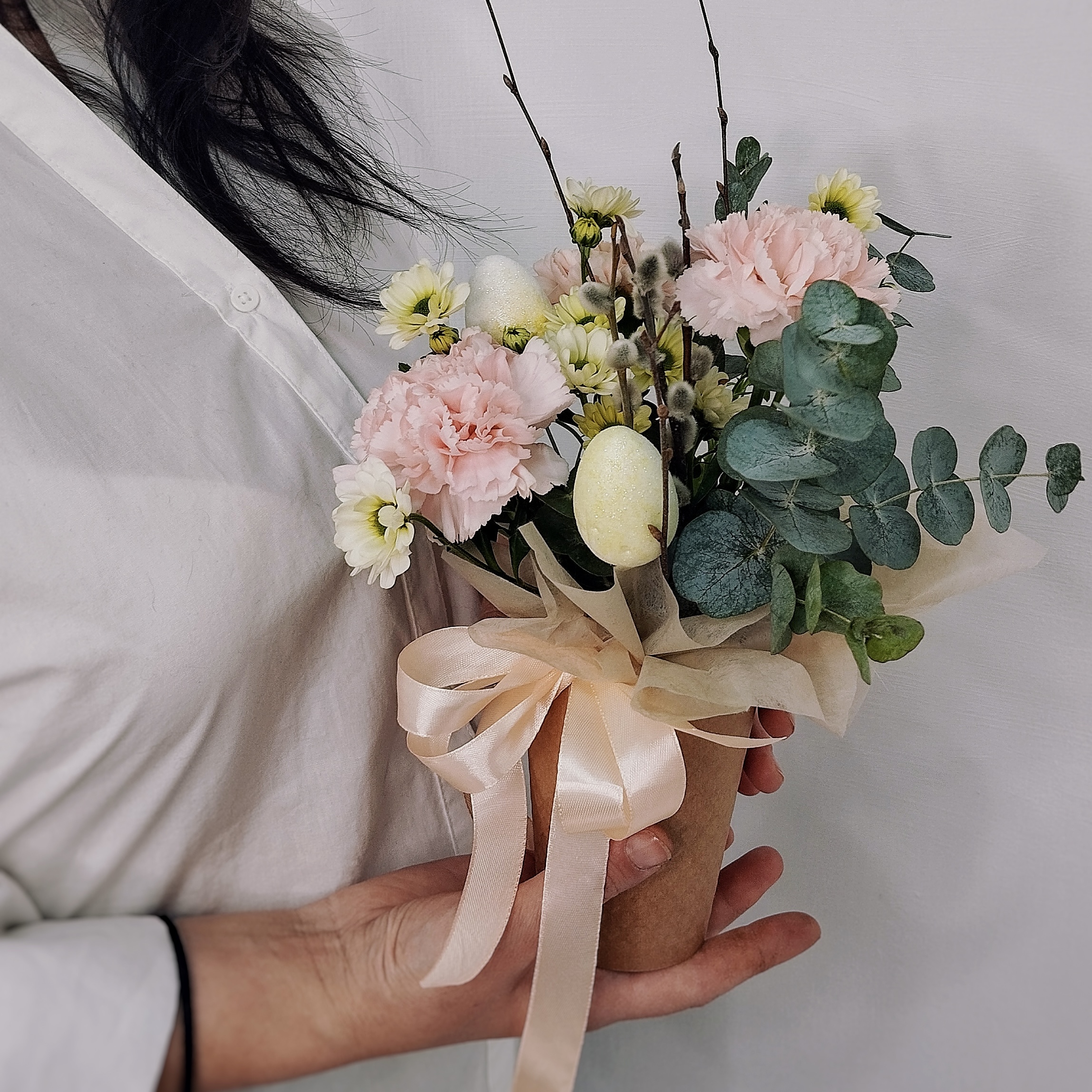 Пасхальная композиция в стаканчике с яйцами, вербой, хризантемой и гвоздиками купить с доставкой в Бердске