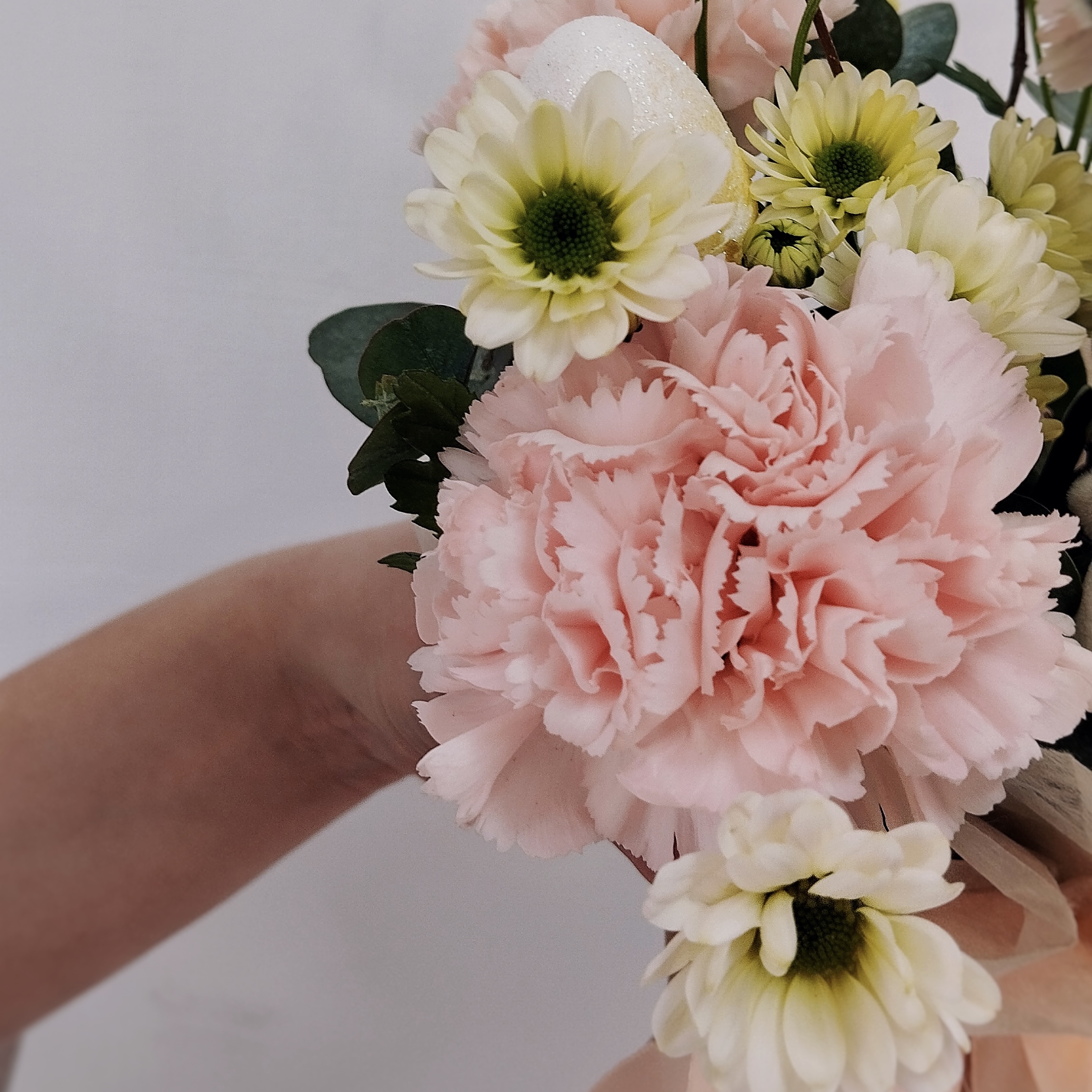 Этот трогательный подарок наполнен символами Светлого Воскресенья. Пушистые веточки вербы — главный весенний символ, нежная кустовая хризантема и трогательные гвоздики создают уютную композицию. Декоративные пасхальные яйца добавляют праздничного настроения