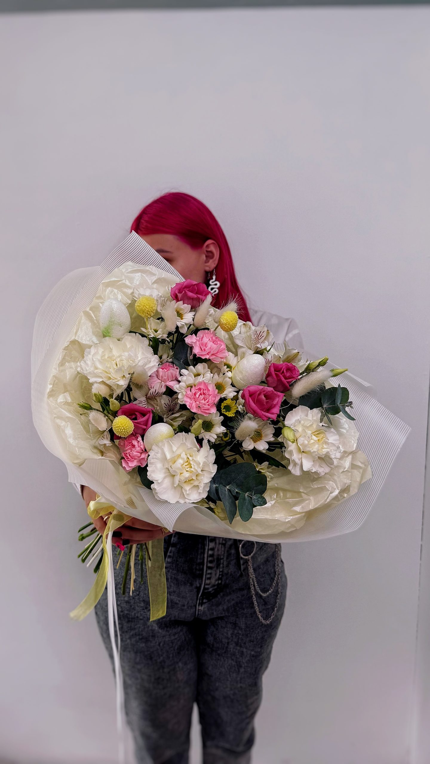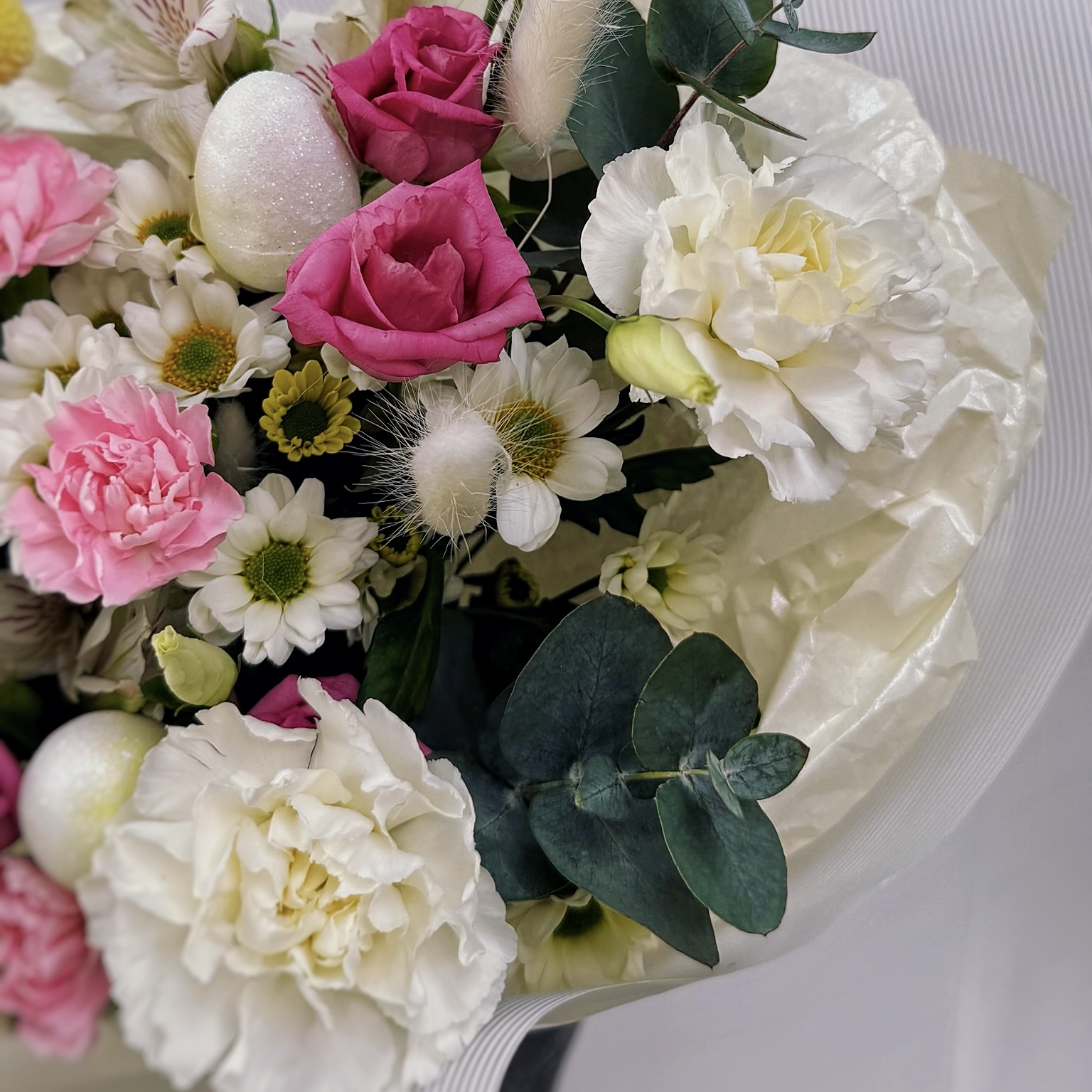 Нежная кустовая и одиночная гвоздика символизируют искренние чувства, стойкая хризантема сантини добавляет композиции объём и долговечность, изящная эустома придаёт романтичность, а утончённая альстромерия — лёгкость.